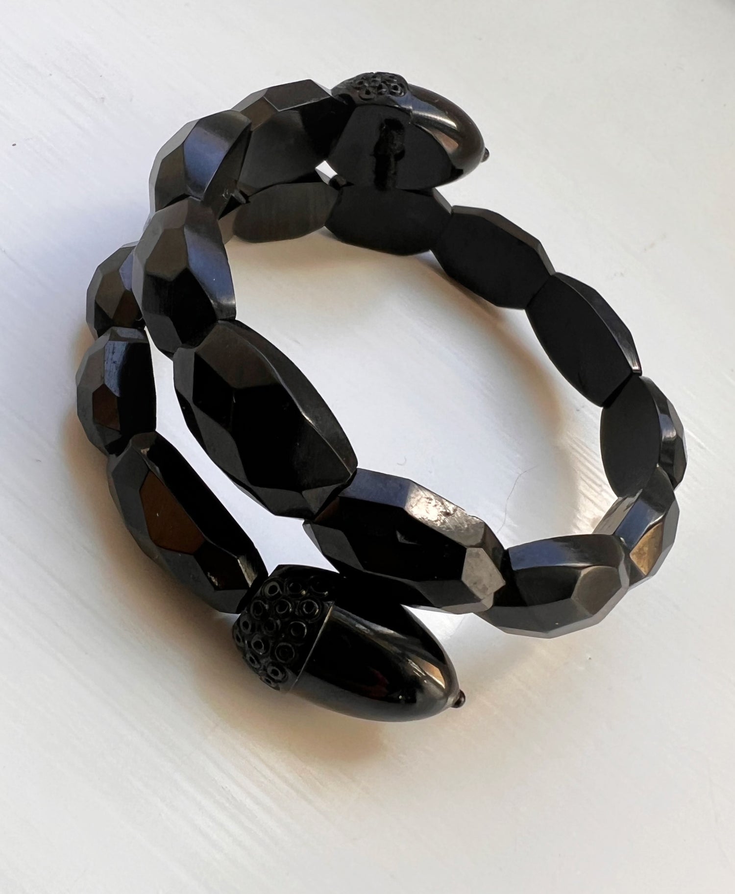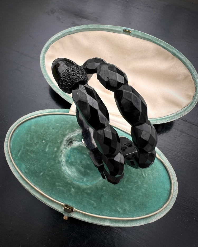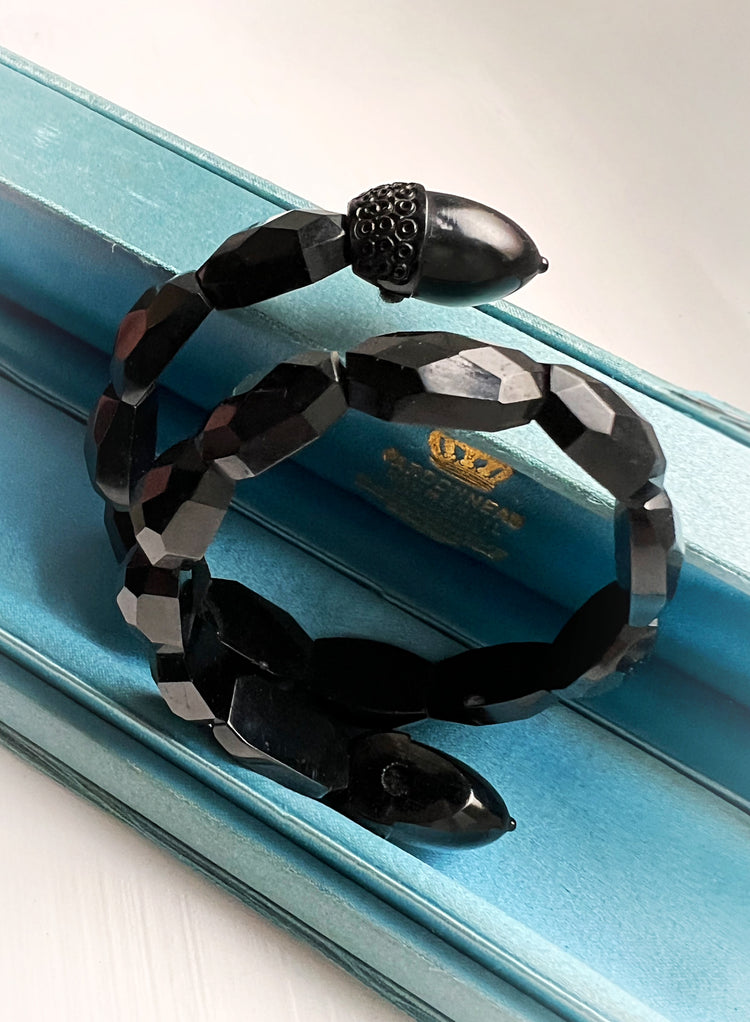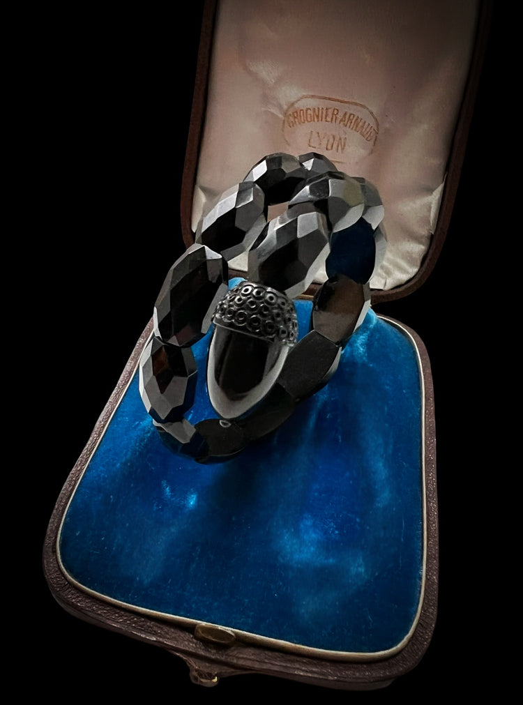 Made in England, circa 1870, the bangle is made of faceted and polished Jet beads, with decorative finials carved into acorns!