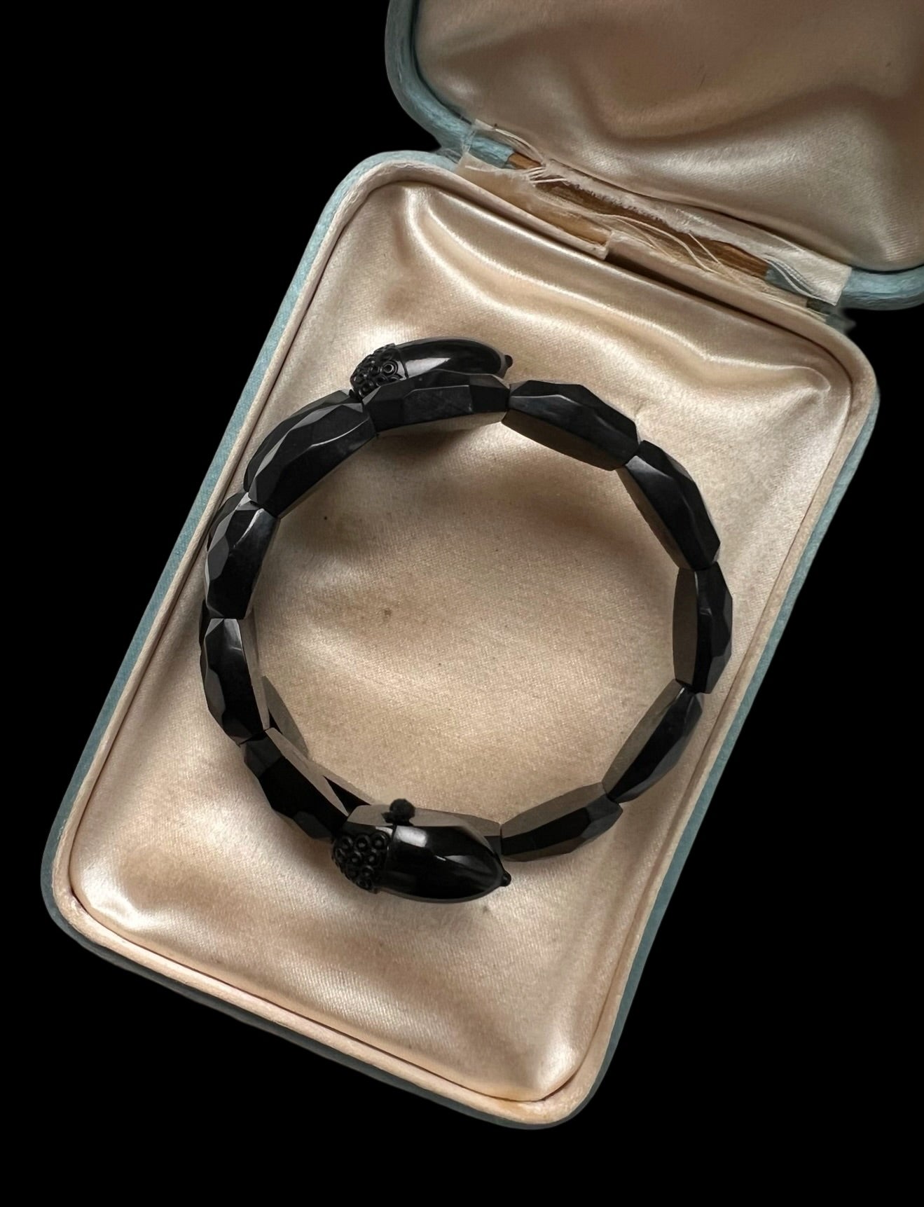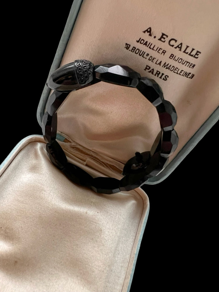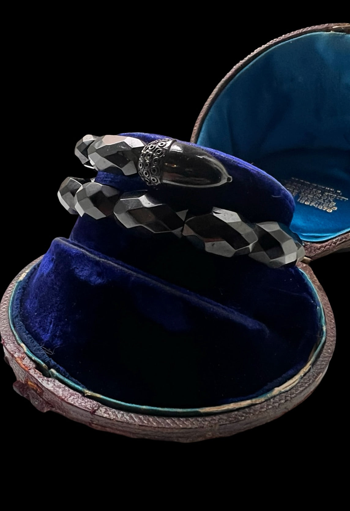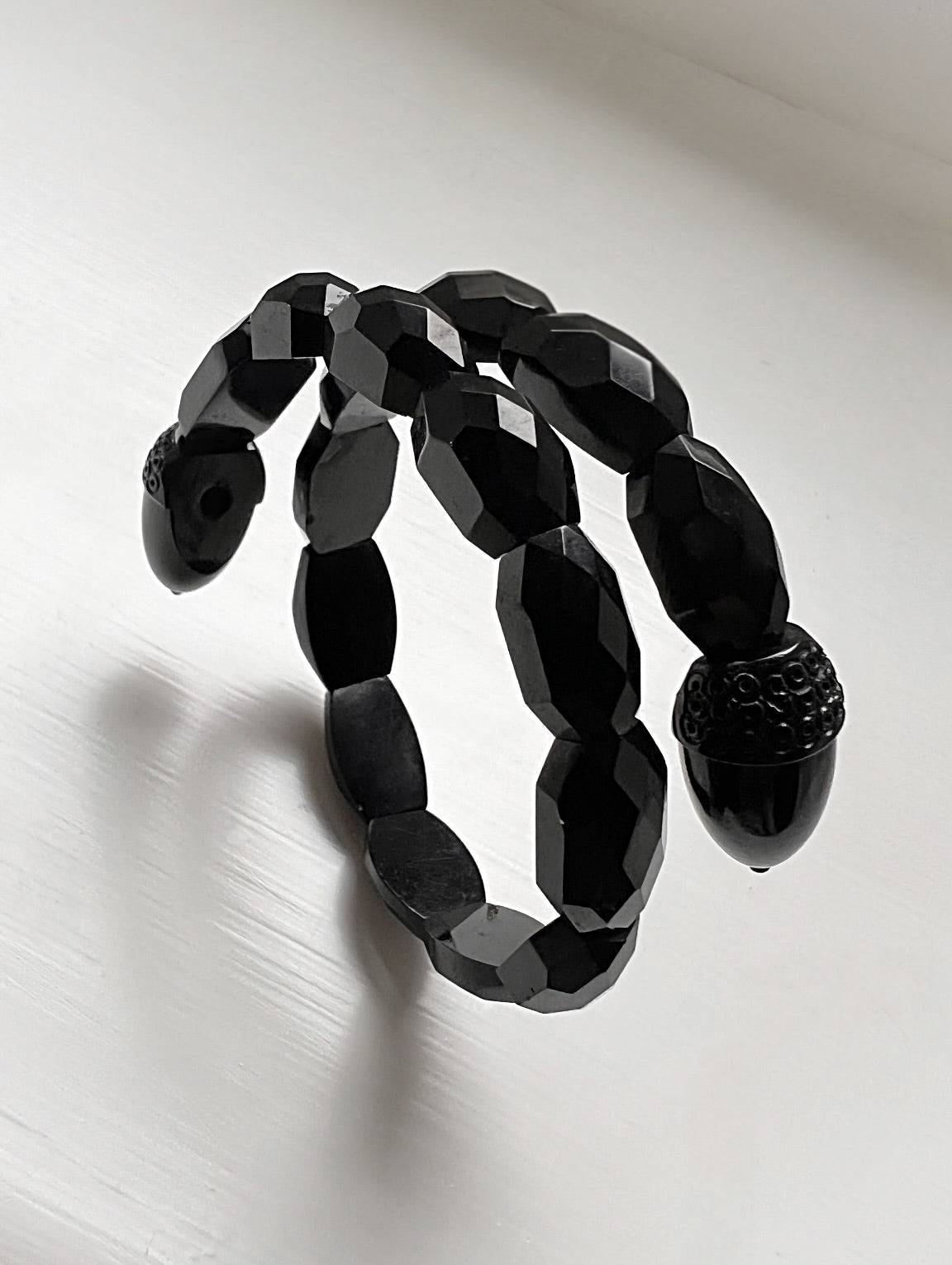 Made in England, circa 1870, the bangle is made of faceted and polished Jet beads, with decorative finials carved into acorns!