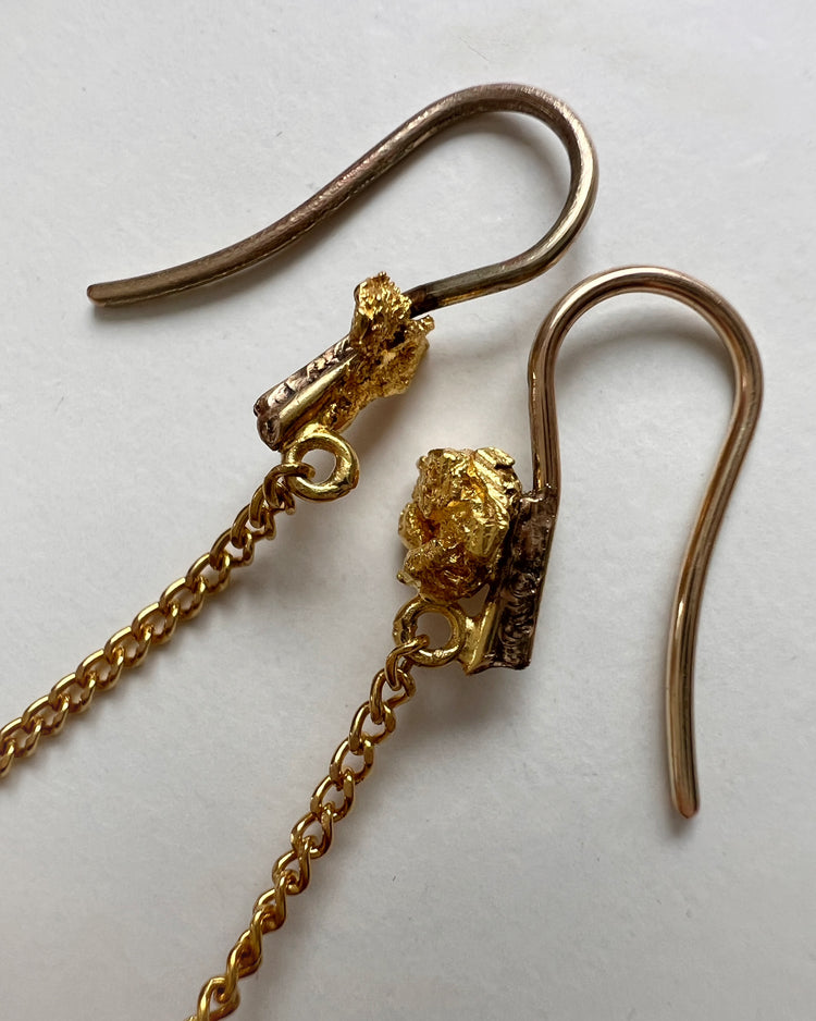 Each earring is made of two totally unique gold nuggets. With a mini nugget at the top and a chunky nugget drop, connected by a fine 18ct gold chain.