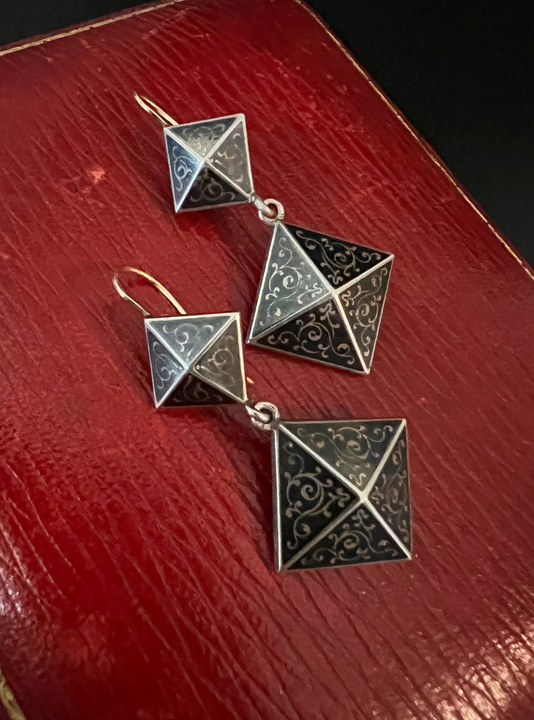 The design is so modern and sculptural, with two graduated pyramids decorated beautifully with the niello scroll pattern.