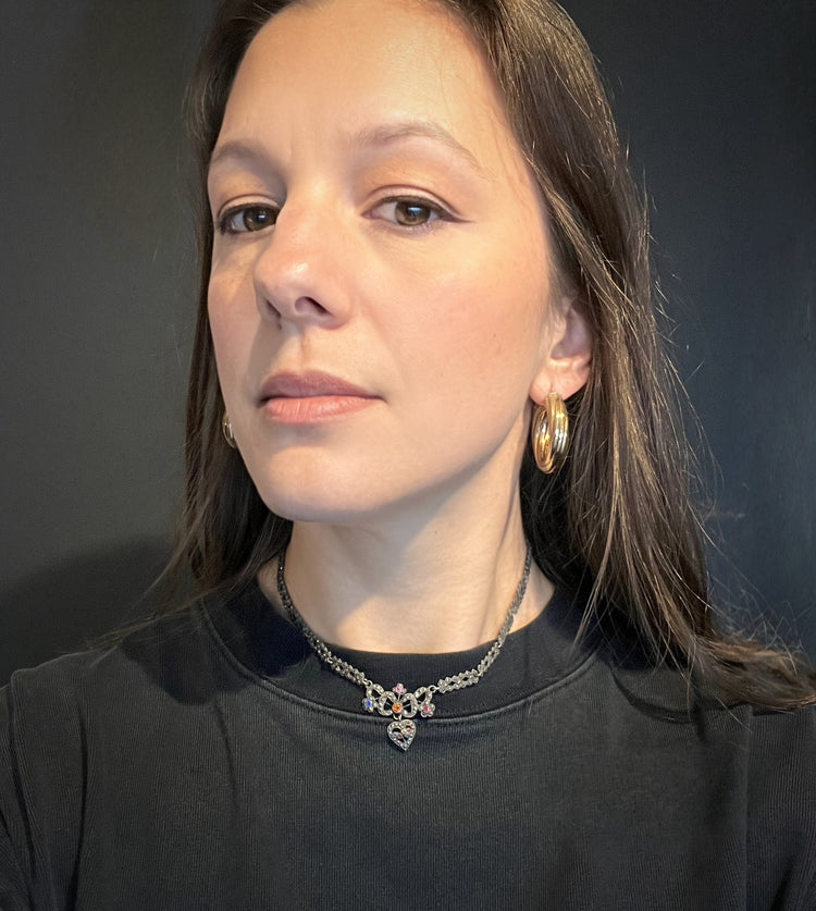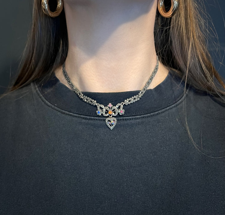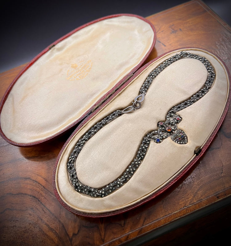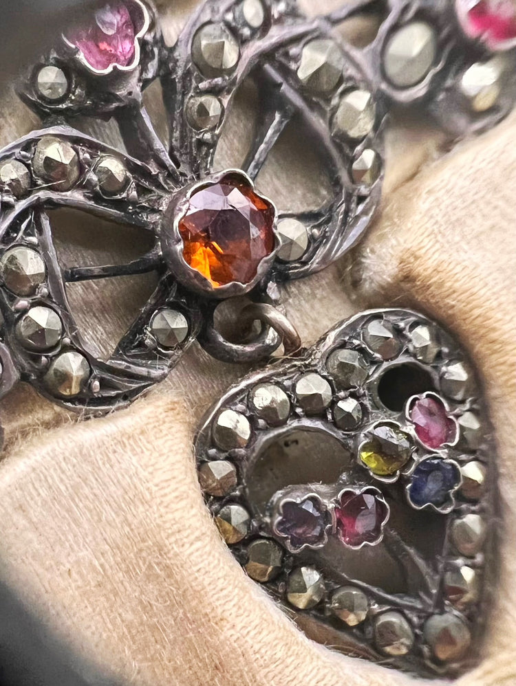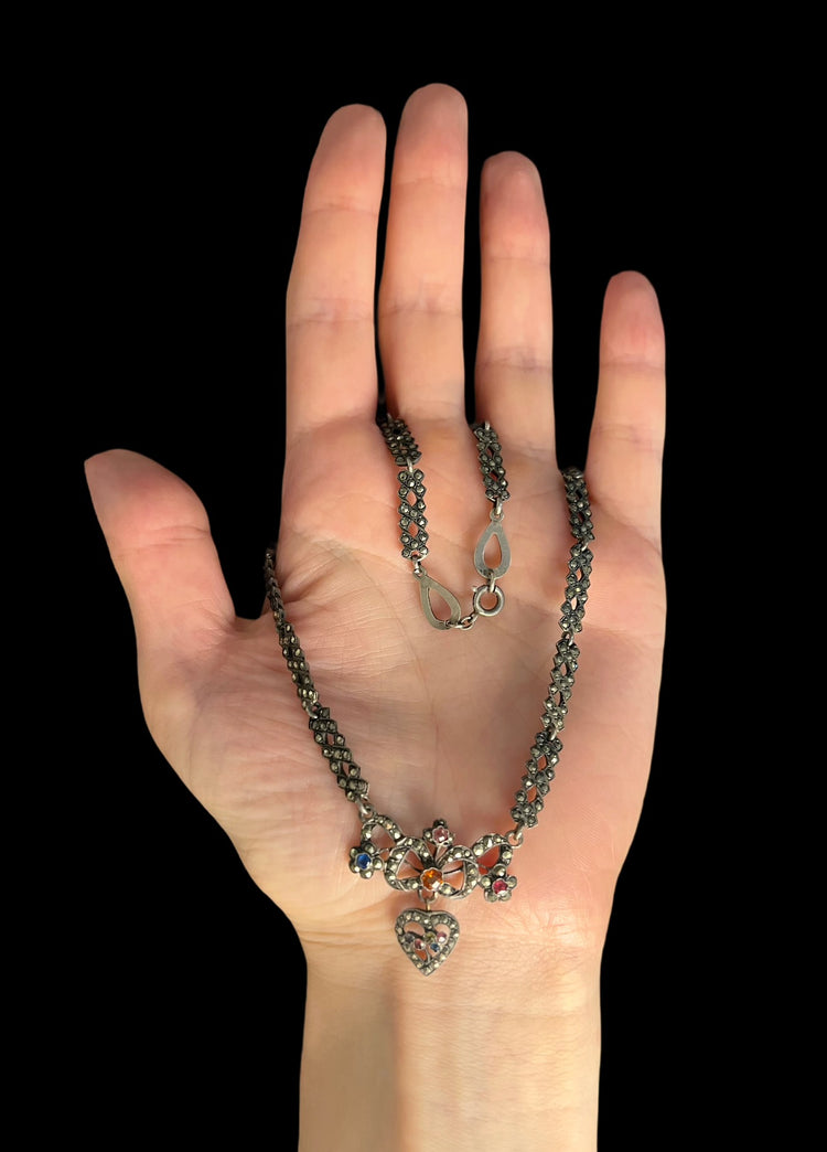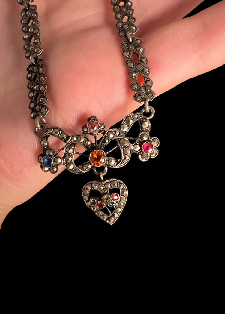 The necklace is made of pretty marcasite links, with a beautiful heart pendant filled with coloured paste stones.