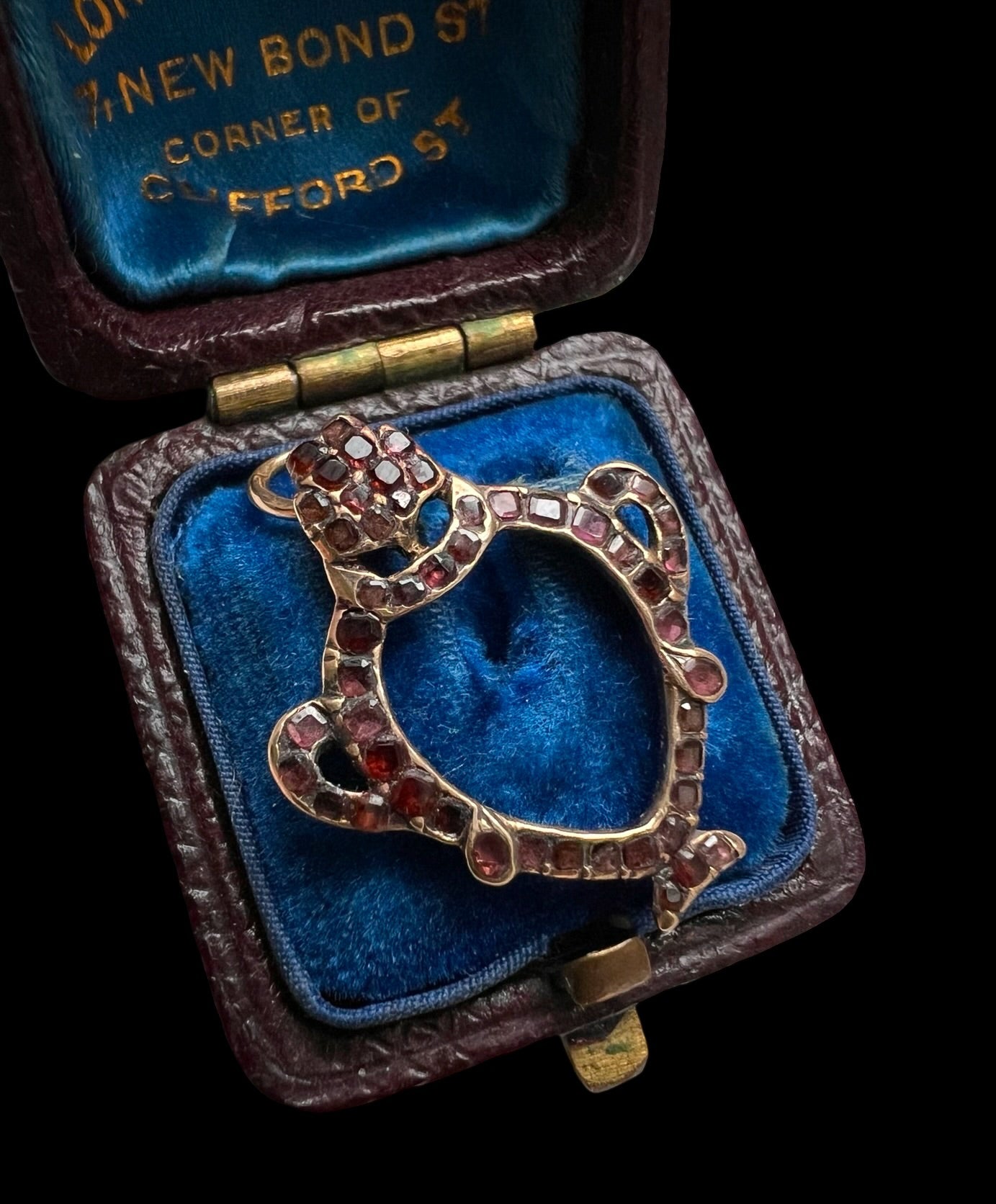 The flat cut garnets follow the frame of the amphora, which is made of 9ct gold.