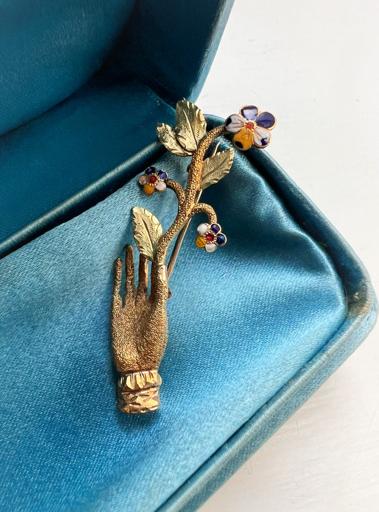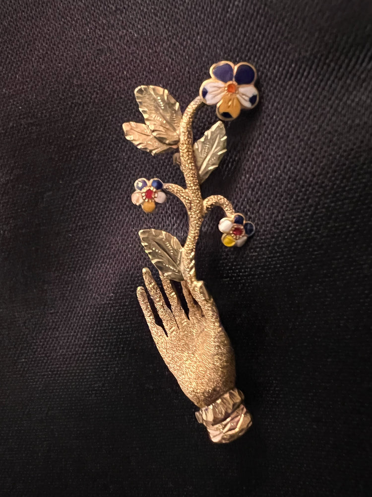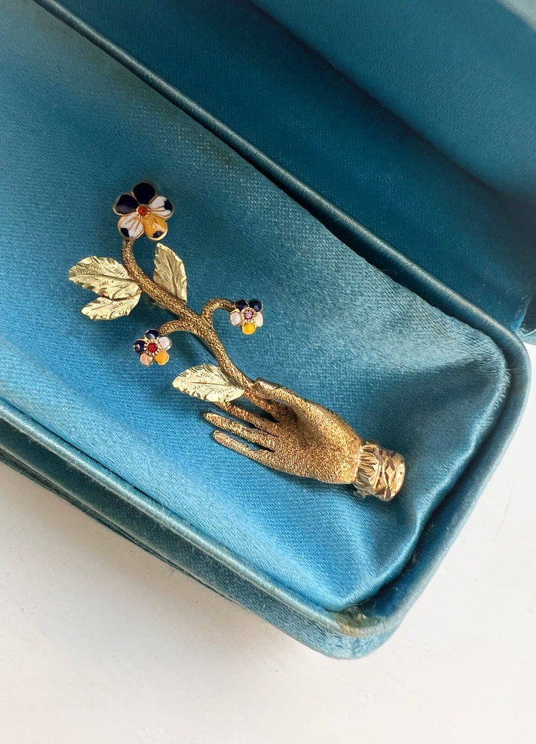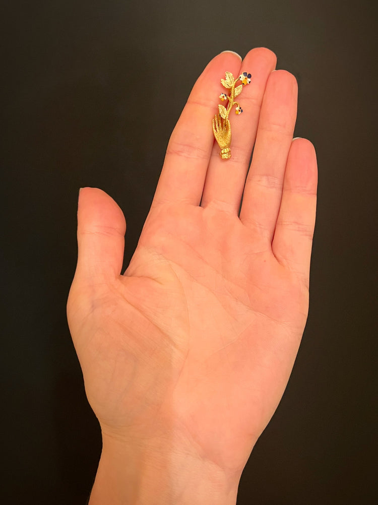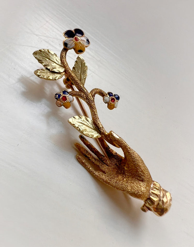 The hand is holding a branch with enamelled pansy flowers and finely chased gold leaves.