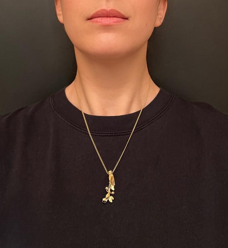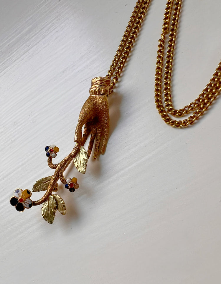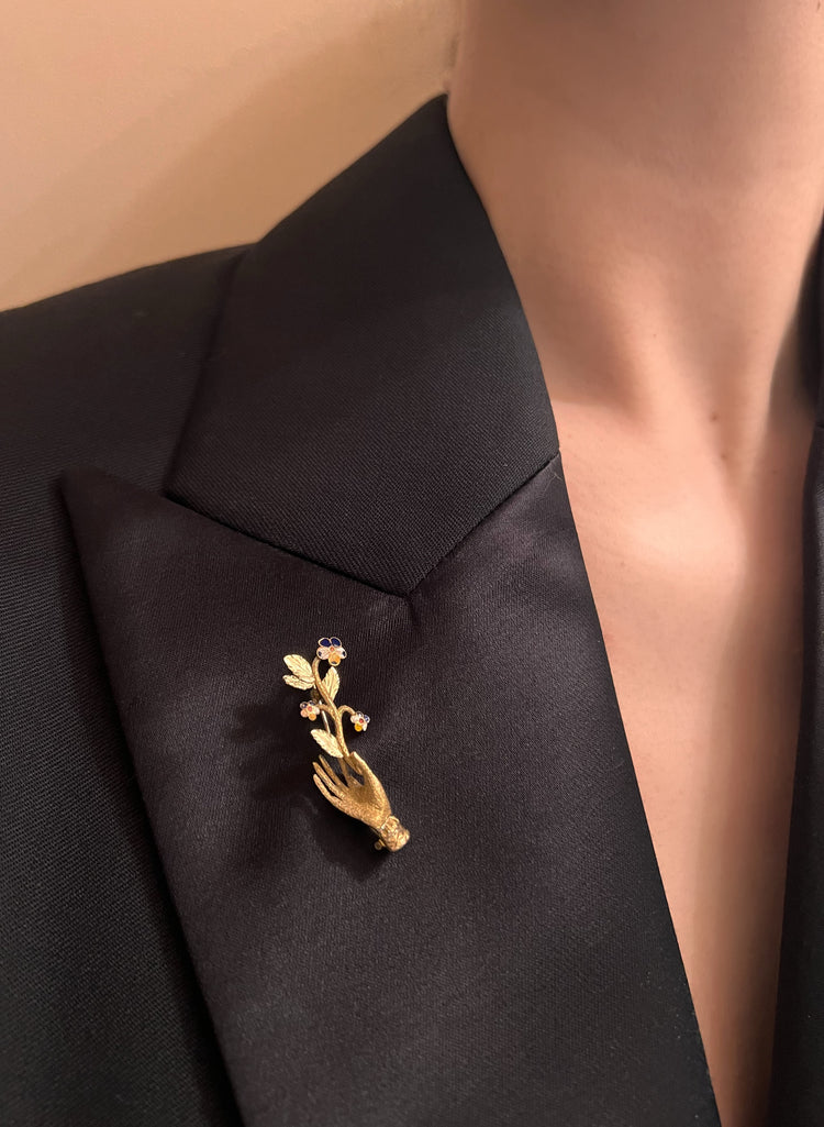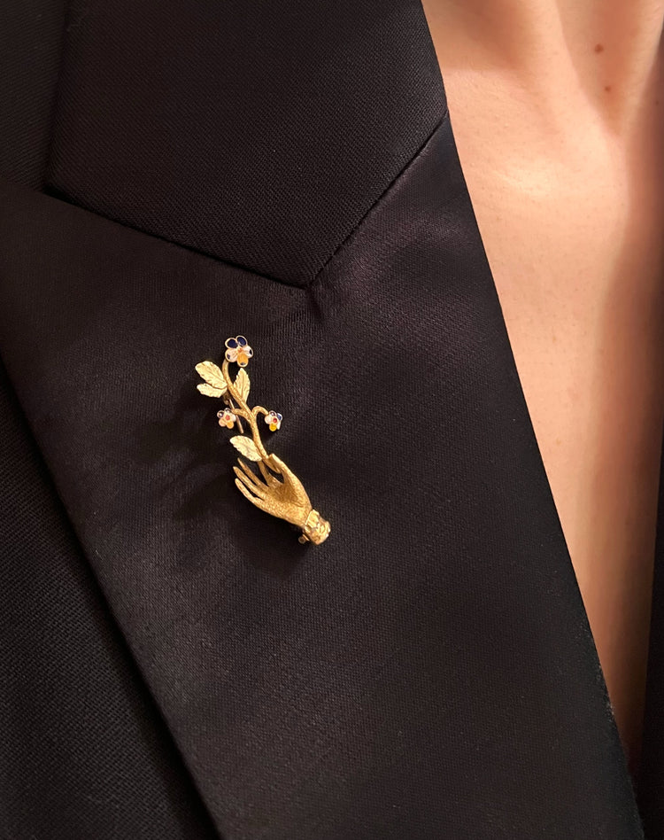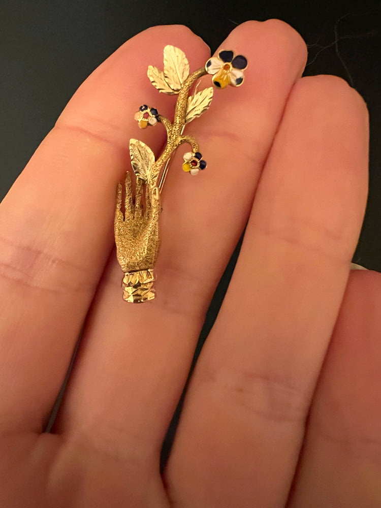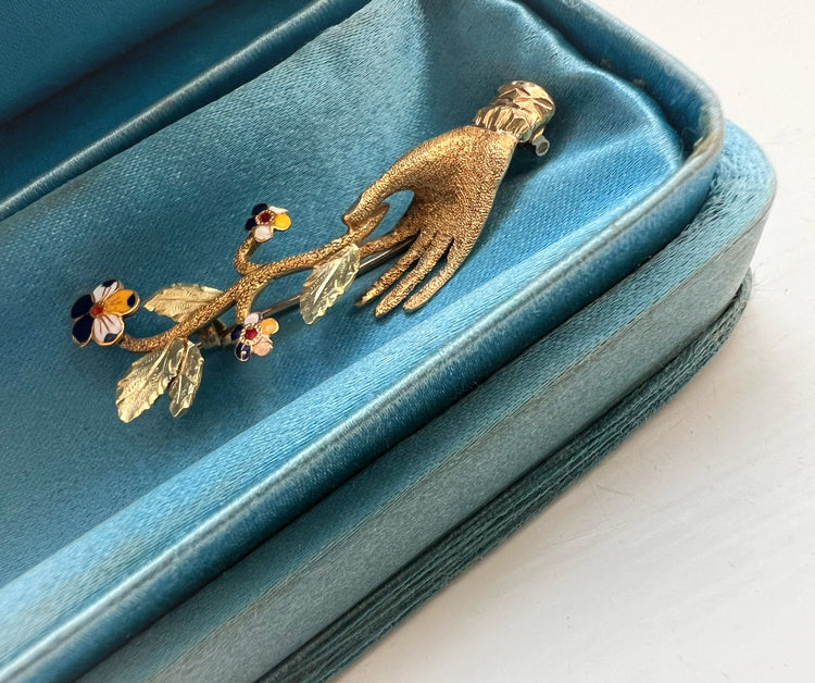 The hand is holding a branch with enamelled pansy flowers and finely chased gold leaves.