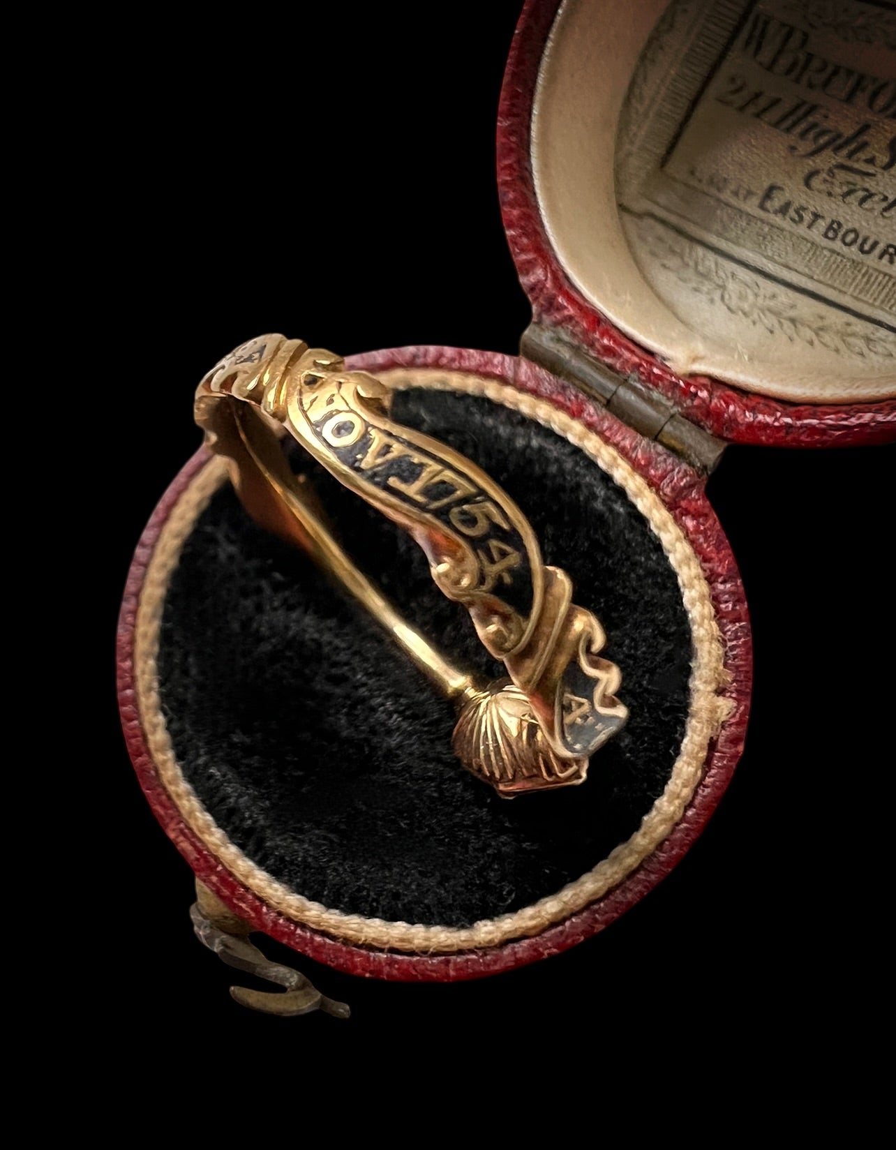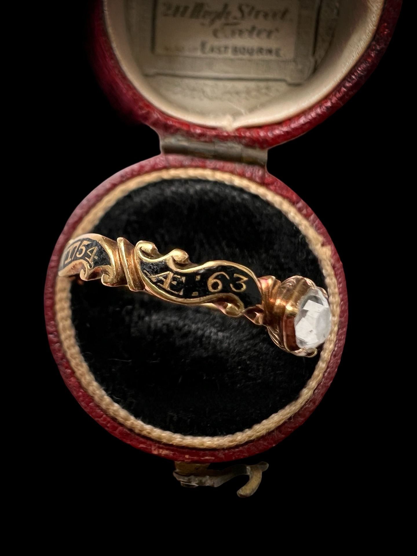 The setting for the crystal is fluted and set to a Rococo scrolled band which is enamelled in black, and reads JOHN NICHOLSON OB: 6 NOV 1754 AE: 63