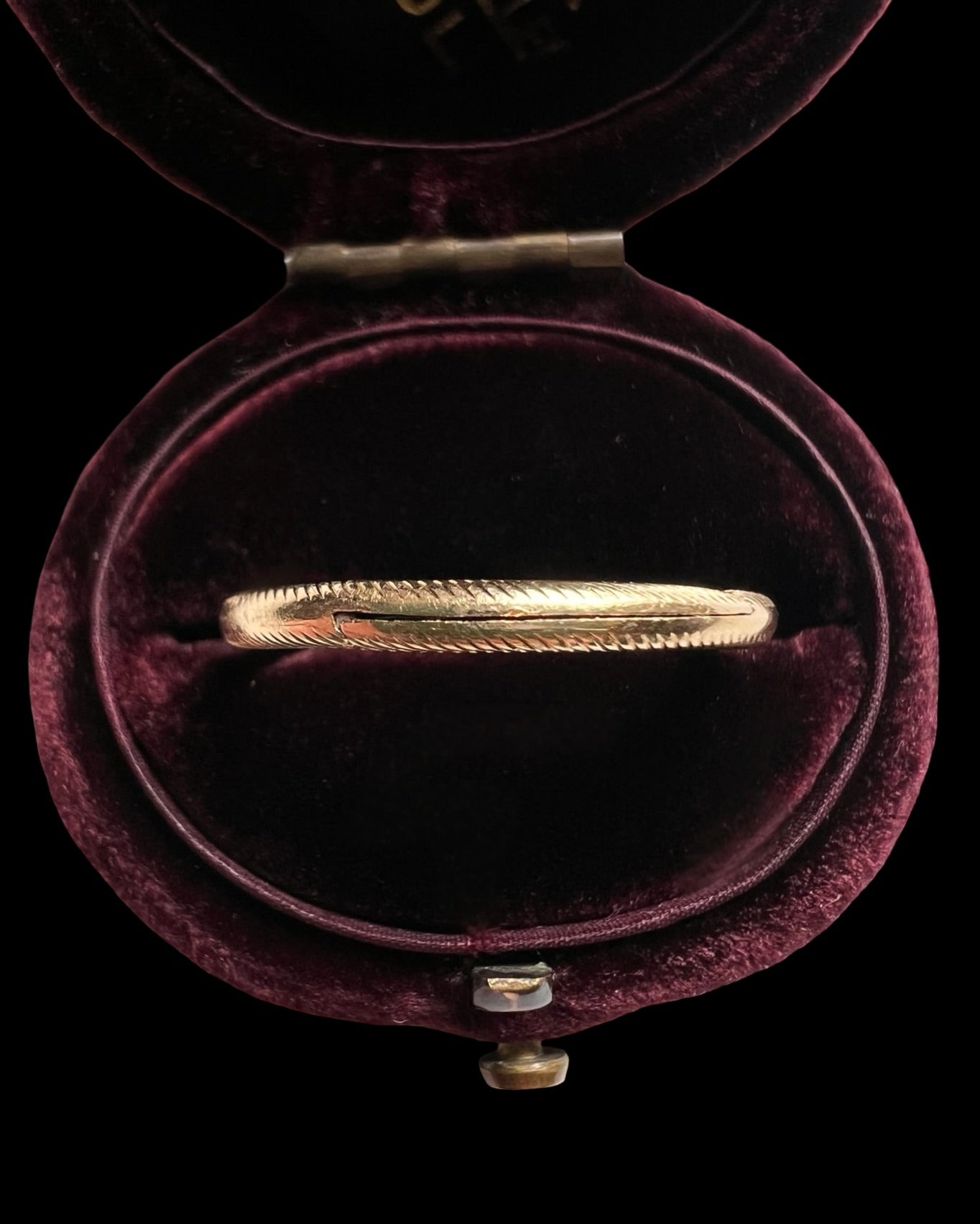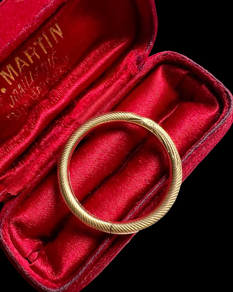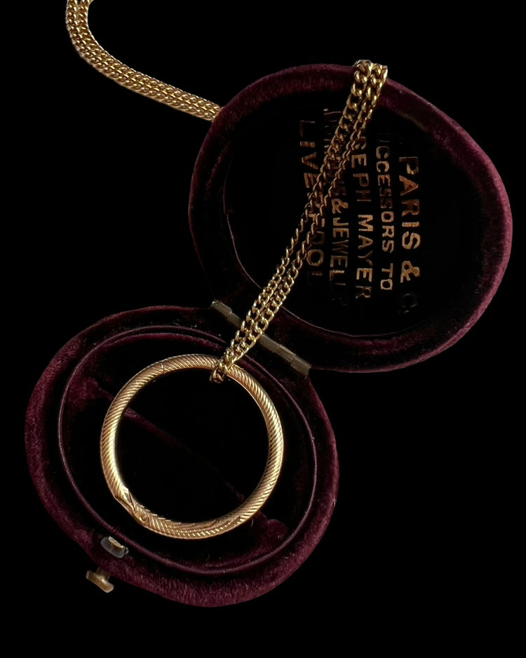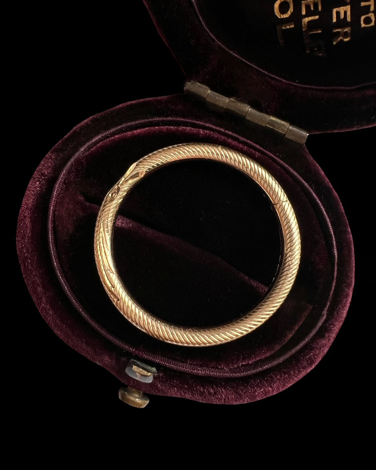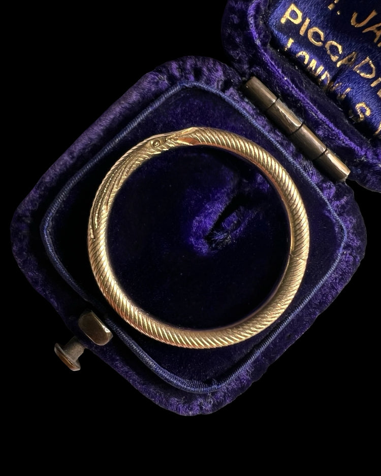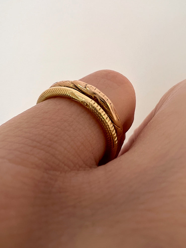 A pretty Ouroboros snake split ring made of yellow 15ct gold.