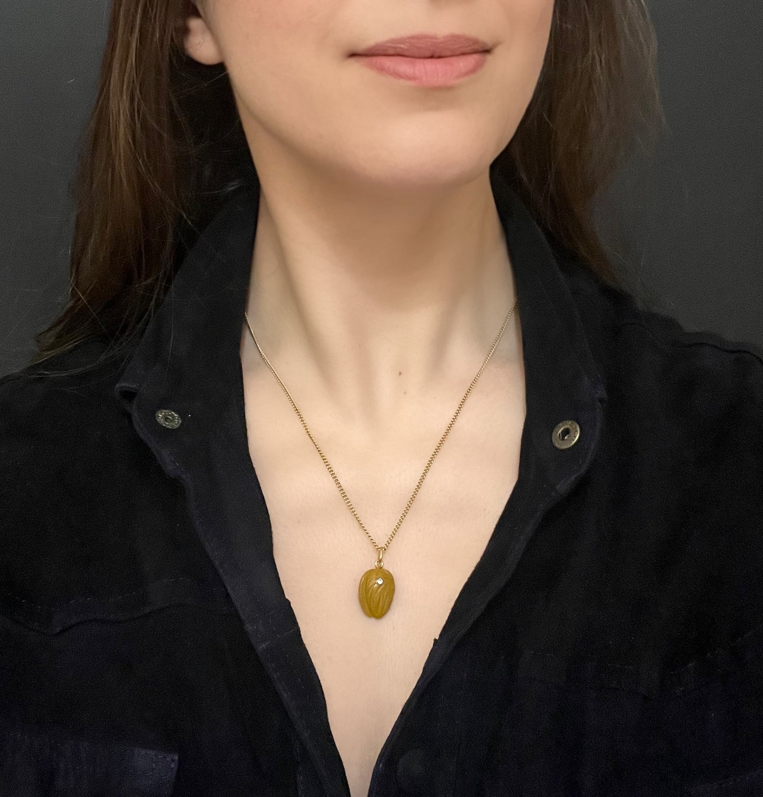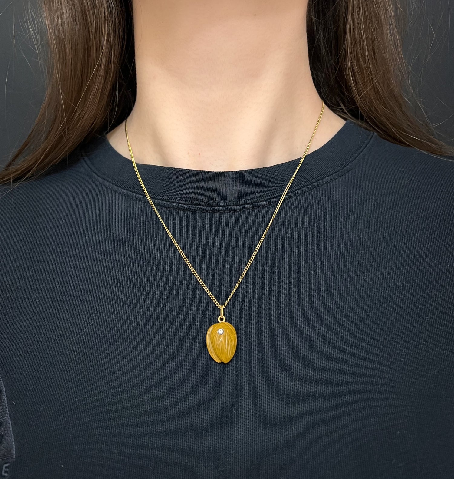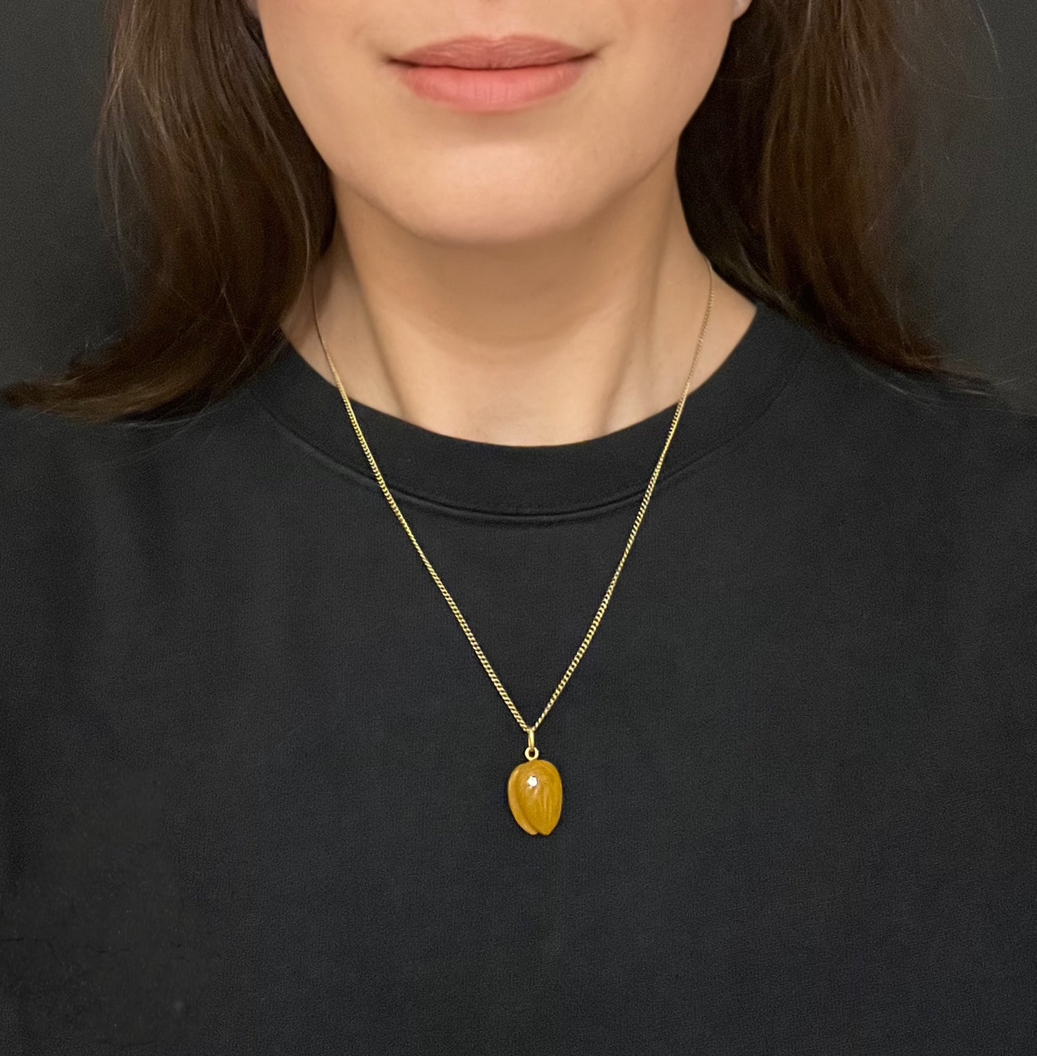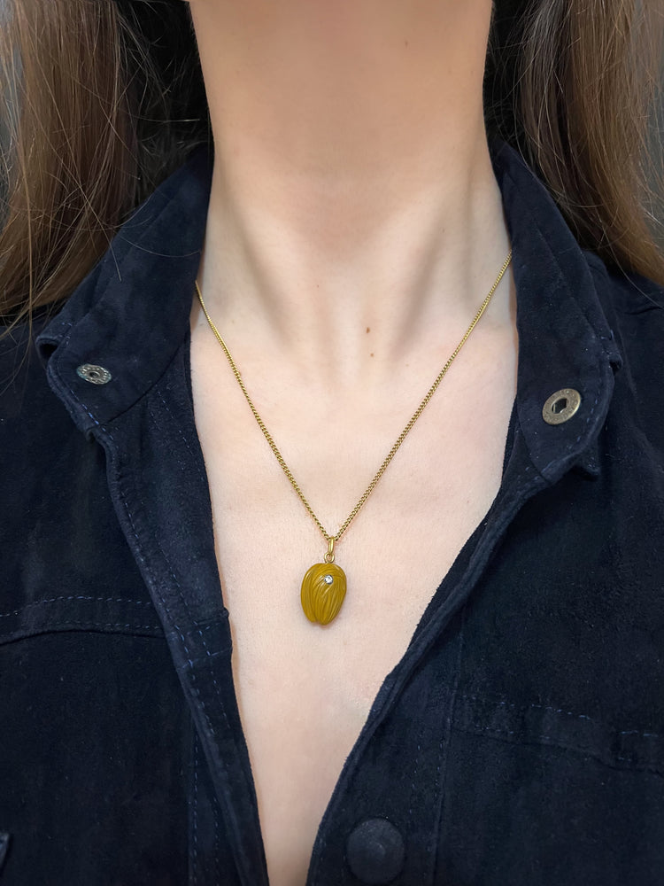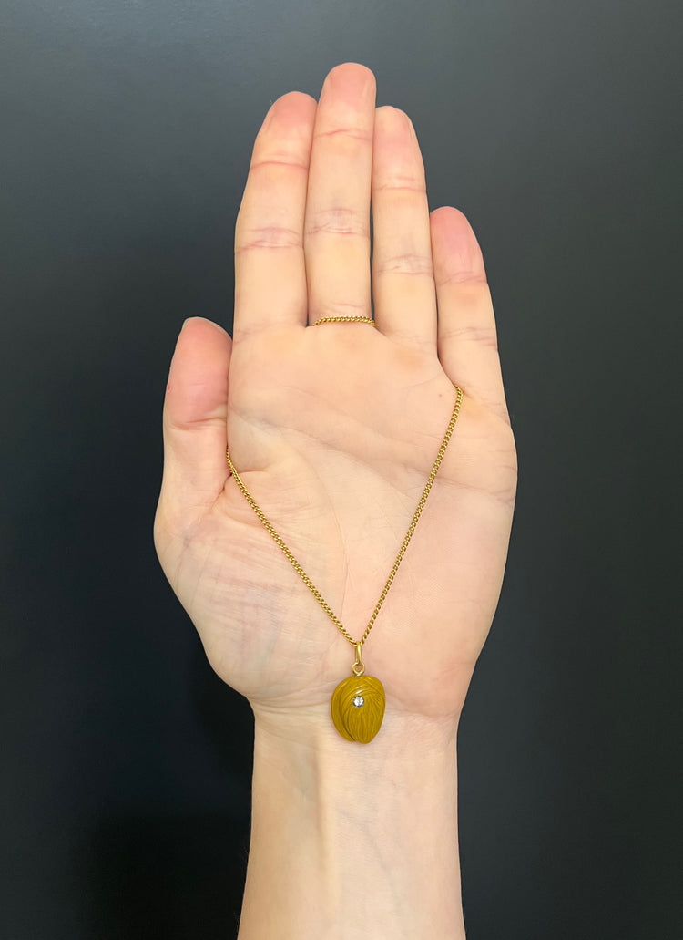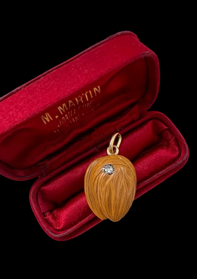 The tan coloured agate has been realistically carved as a nut! The pendant has been accented with a lovely old cut diamond which is set in a rope border silver setting.