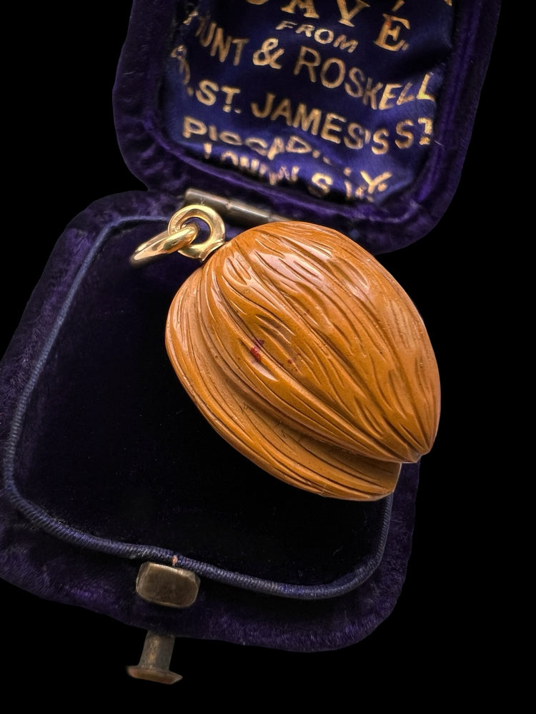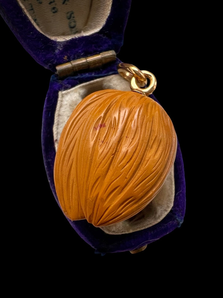 The nut hangs from the original high carat gold pegged bail.