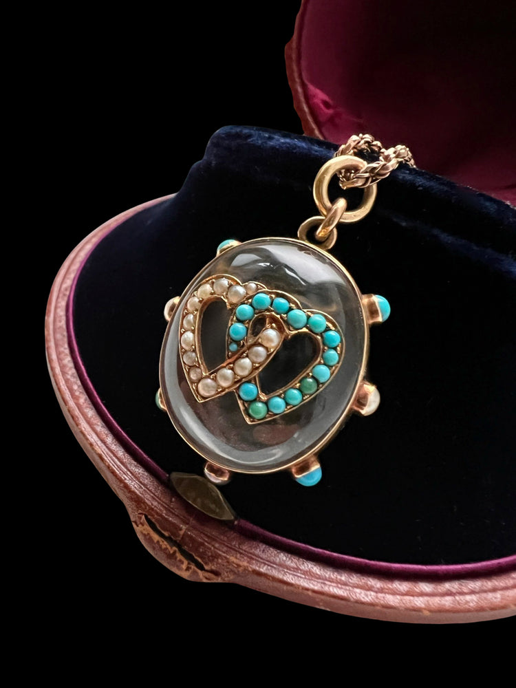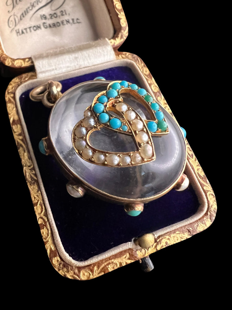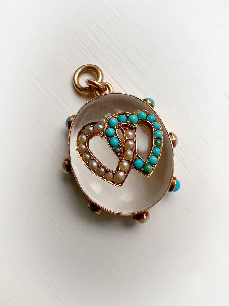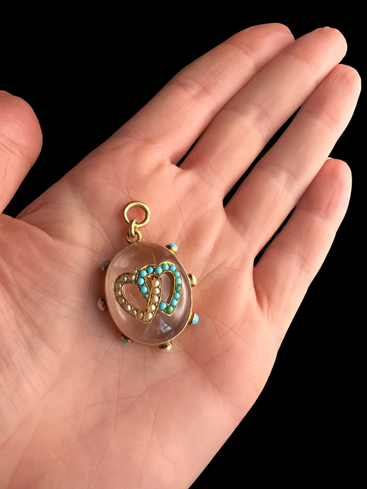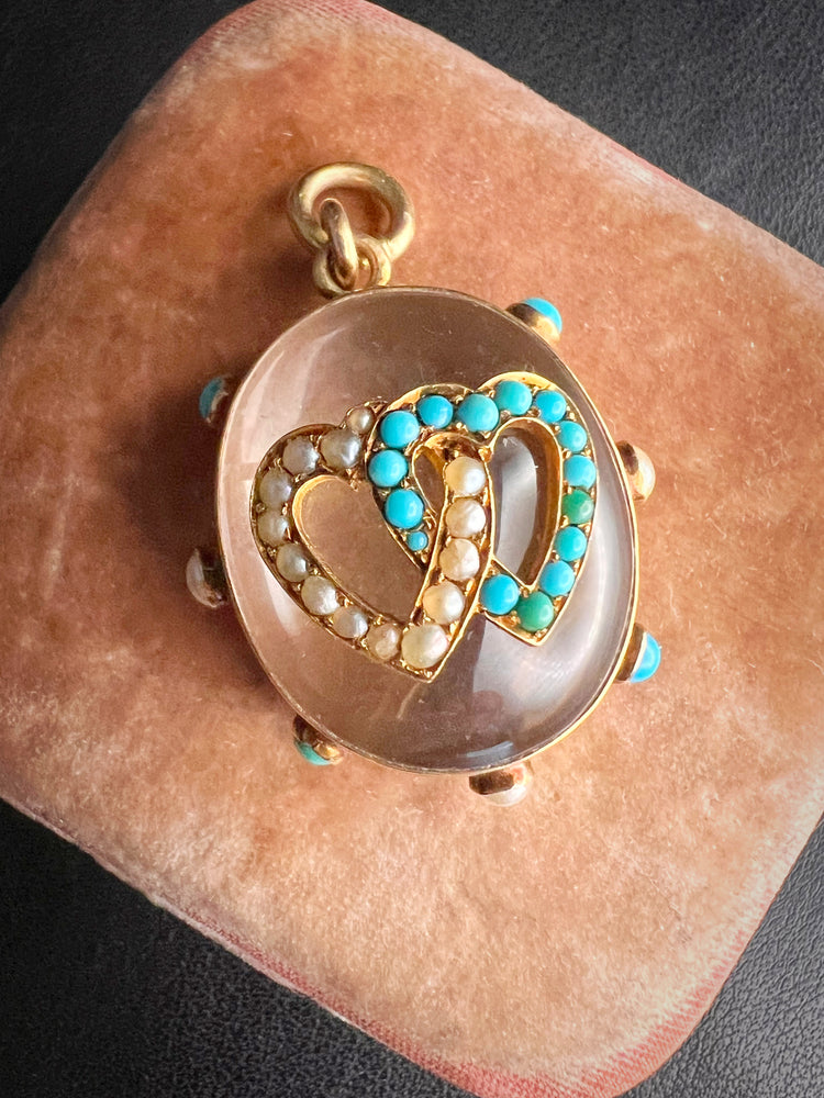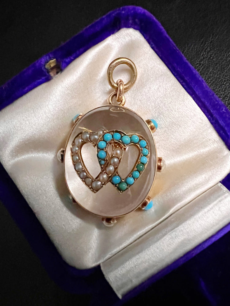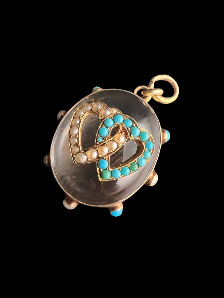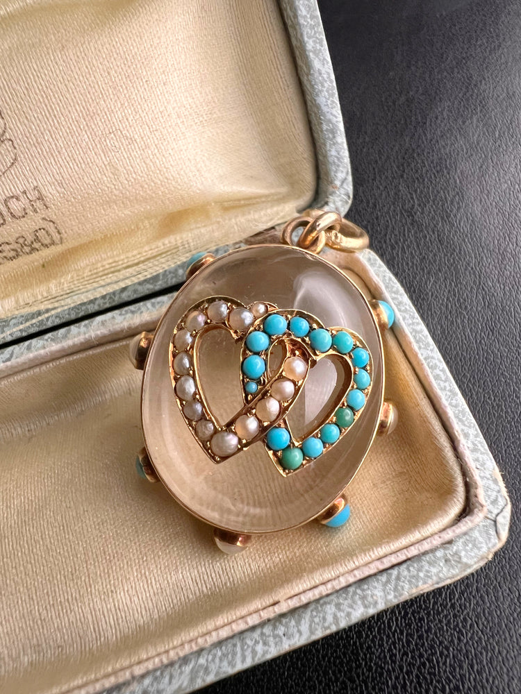The chunky oval Rock Crystal has a double interlocking heart motif made of Turquoise and Pearls which are set in 15ct gold.