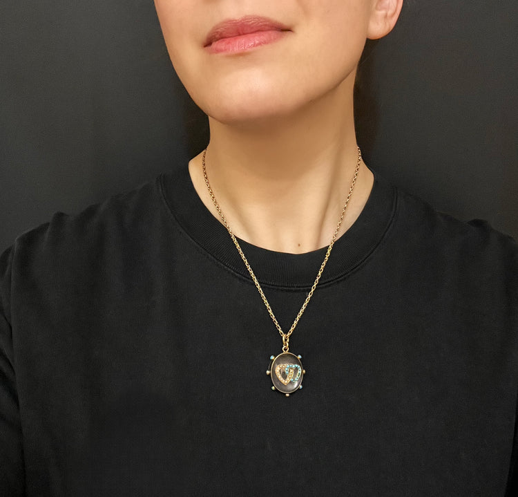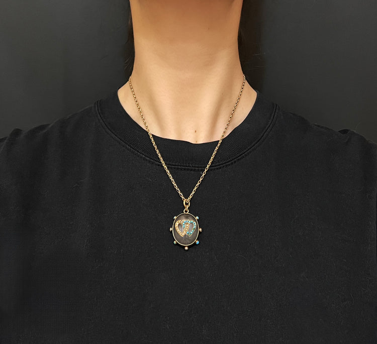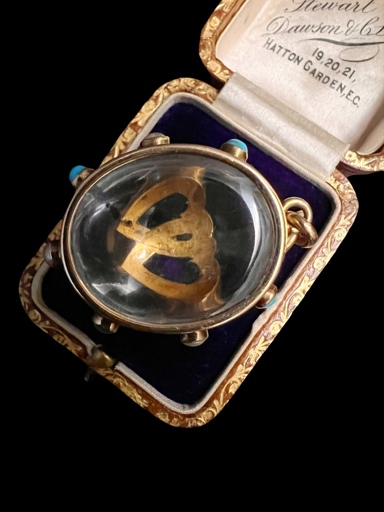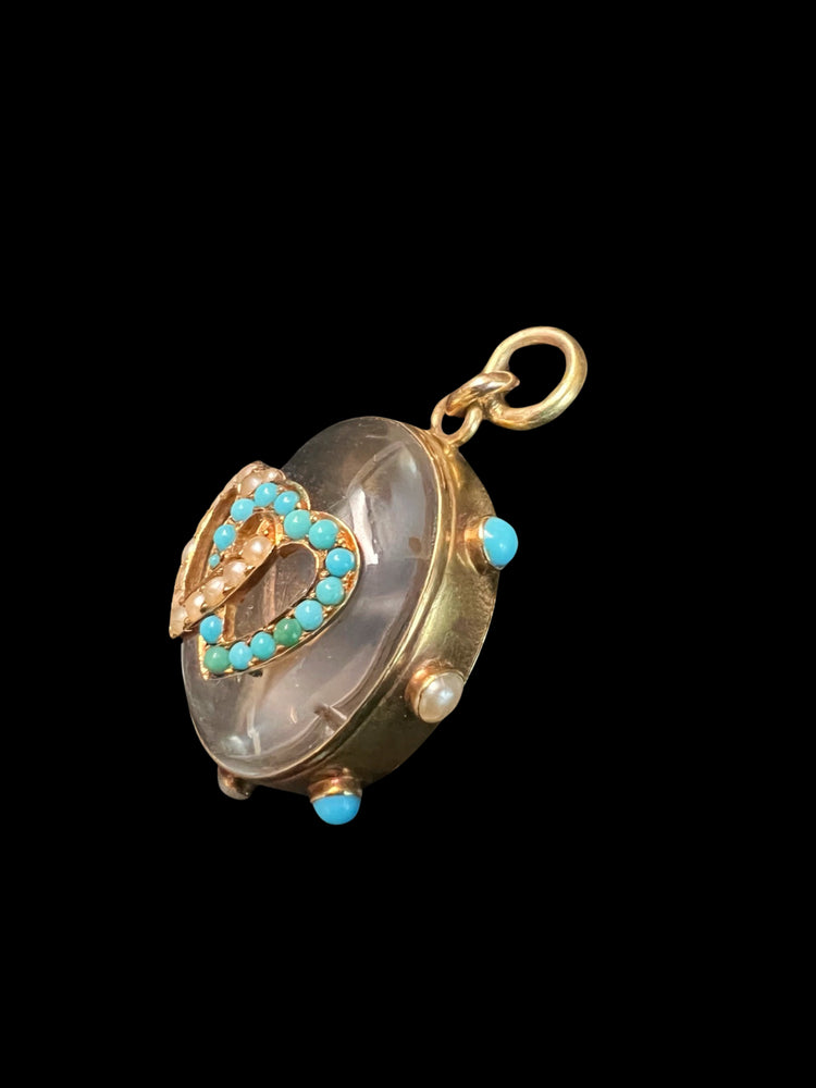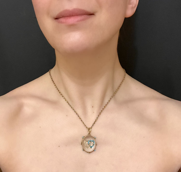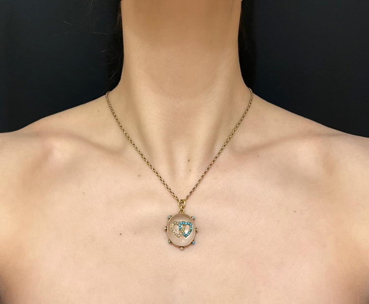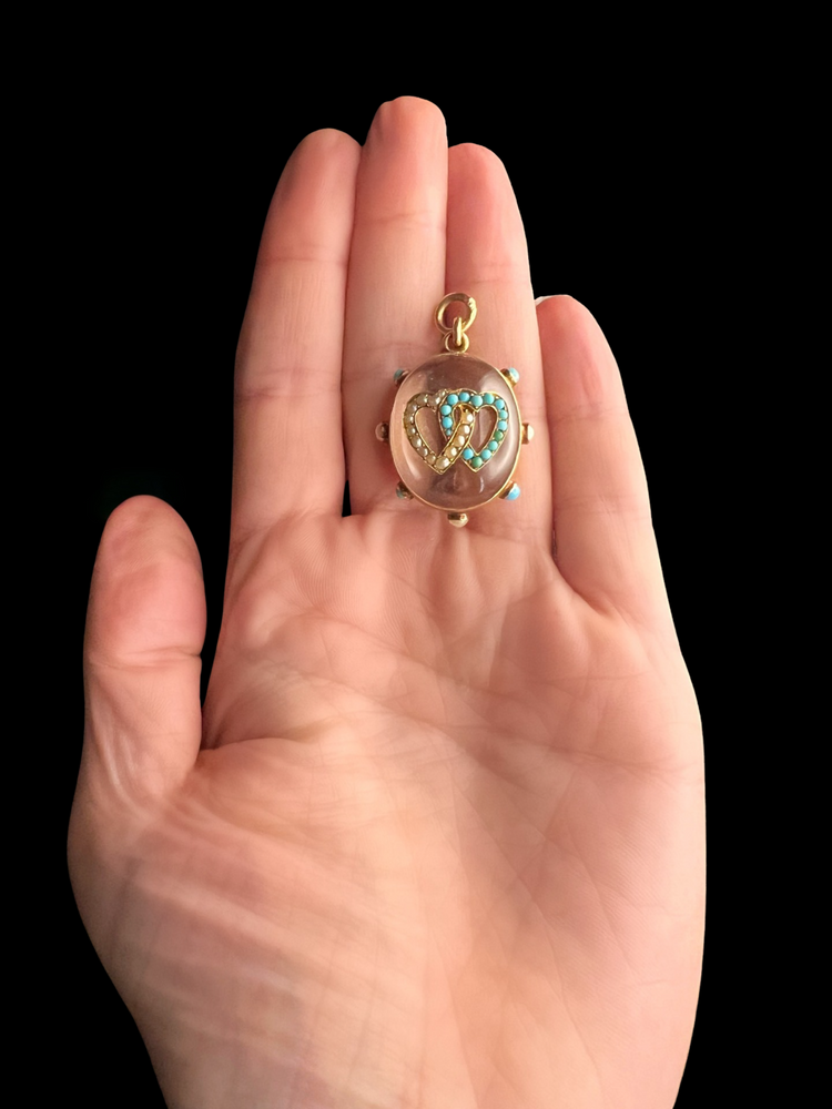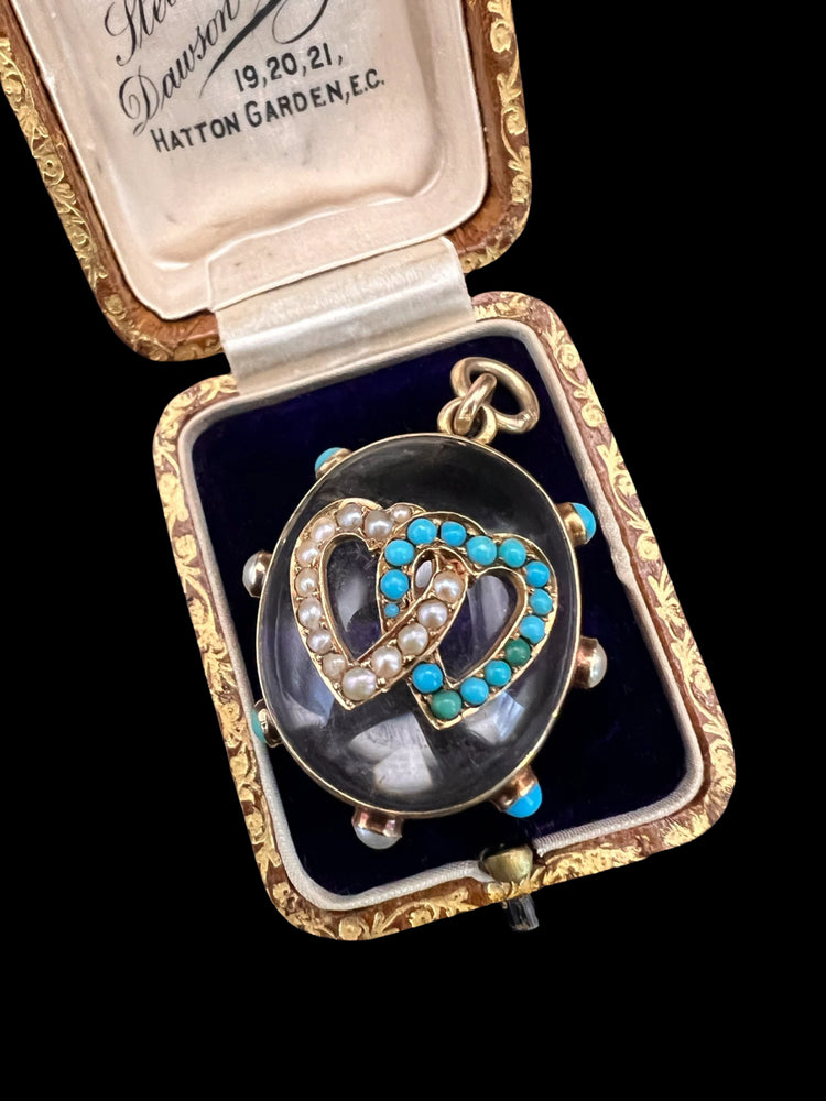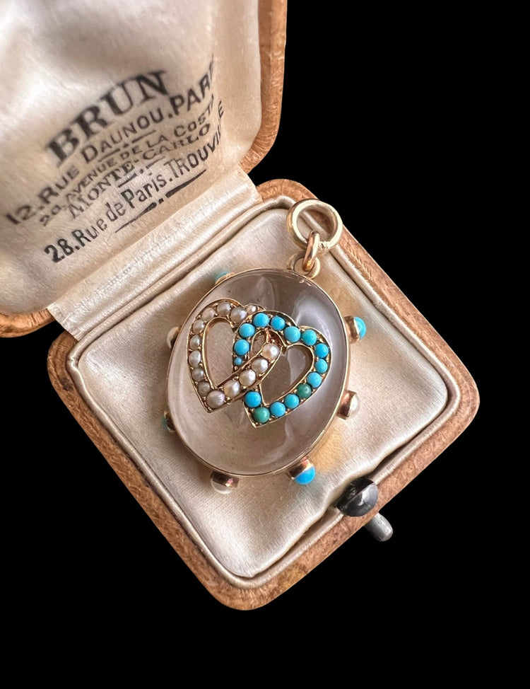 The chunky oval Rock Crystal has a double interlocking heart motif made of Turquoise and Pearls which are set in 15ct gold.