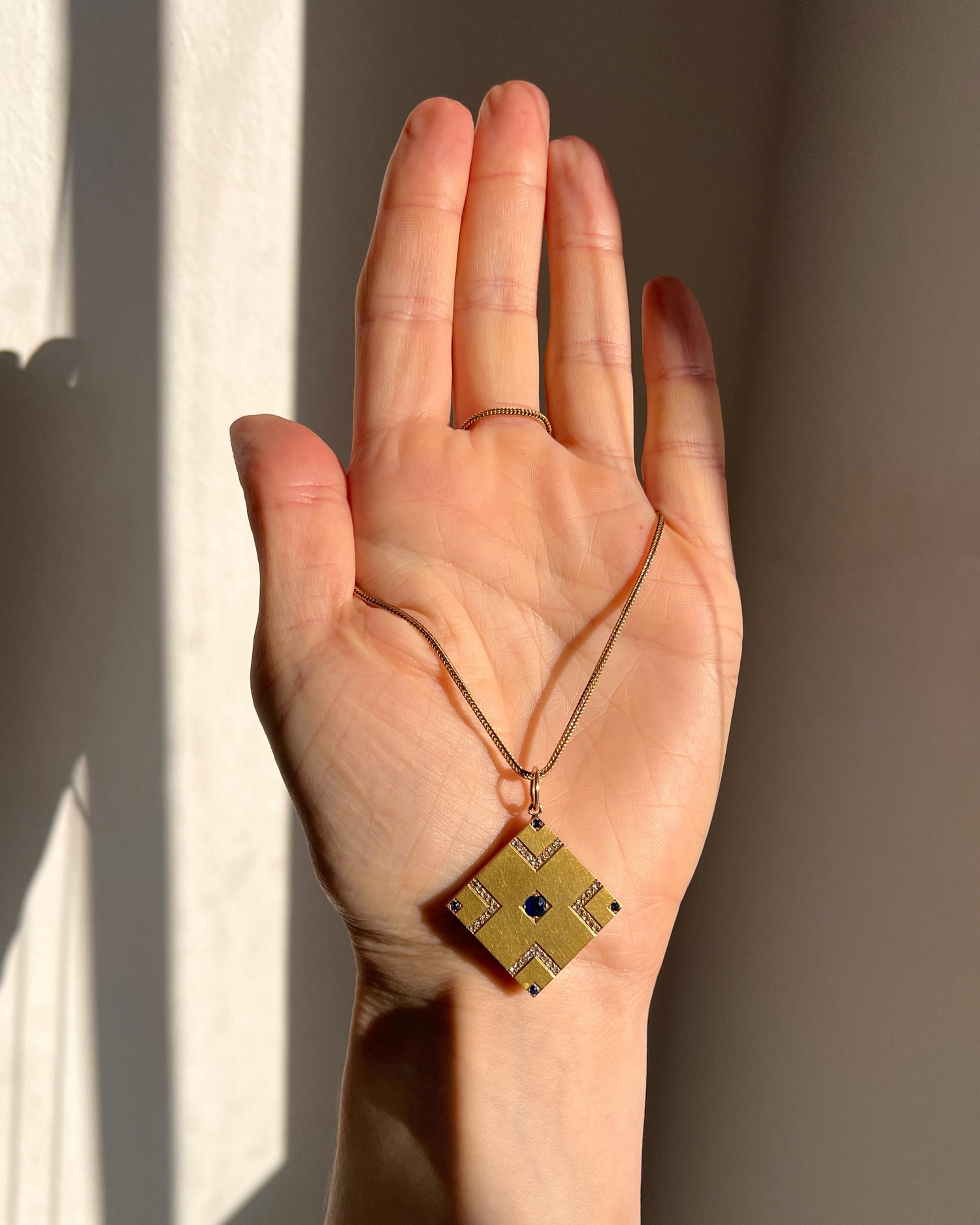 The square pendant hangs from a large gold jump ring, making it easy to add to most chains.