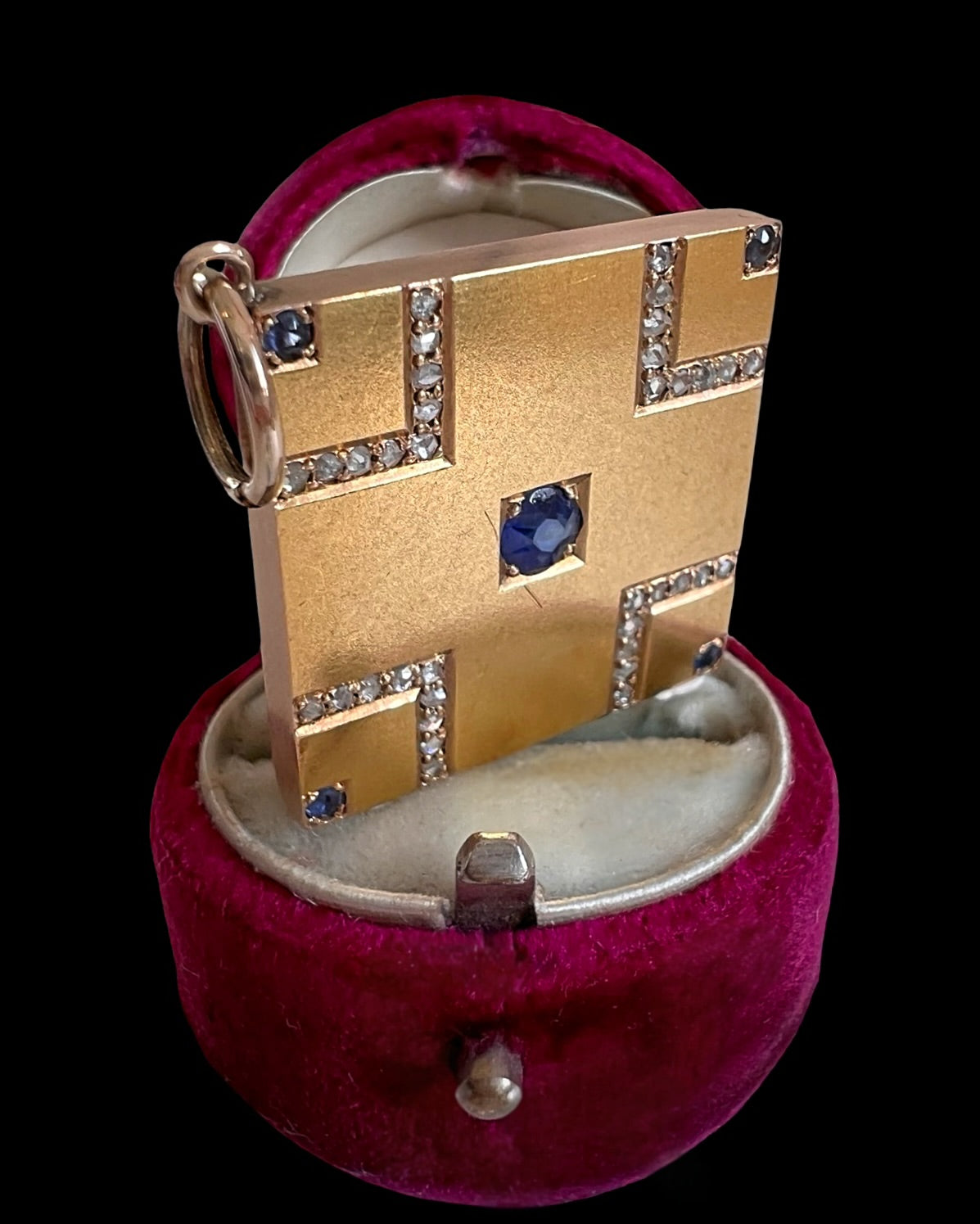 The square is set with a large central natural blue sapphire, with a further smaller sapphire in each corner.