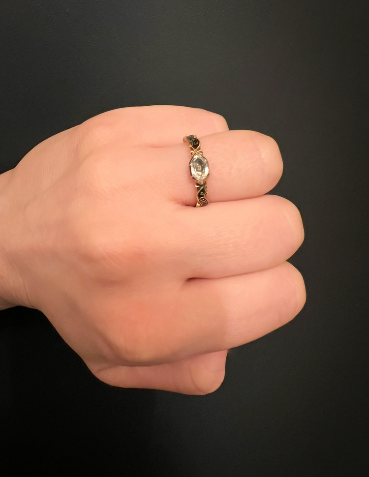 The ring has a wonderful hexagonal faceted rock crystal with a tiny enamel skull head beneath.