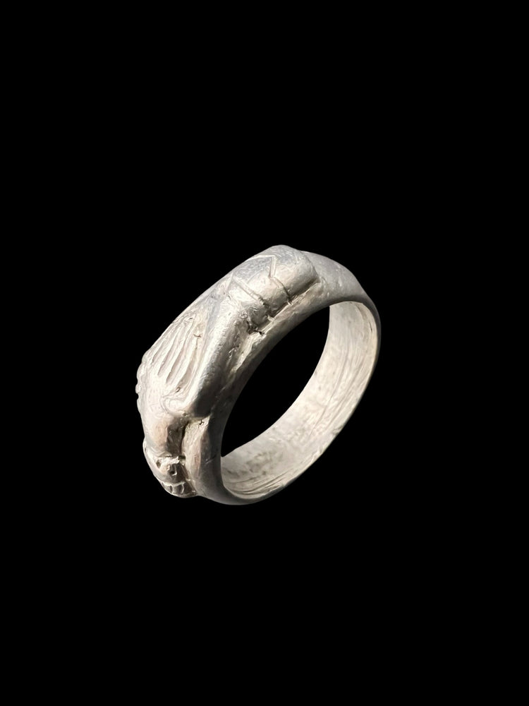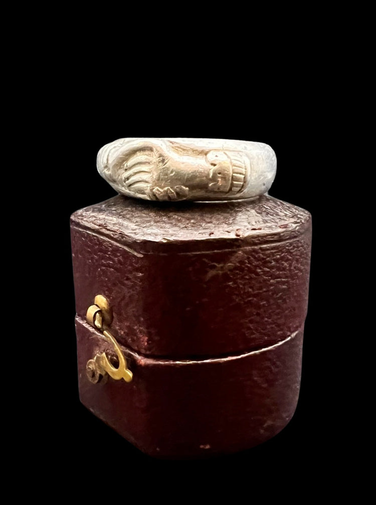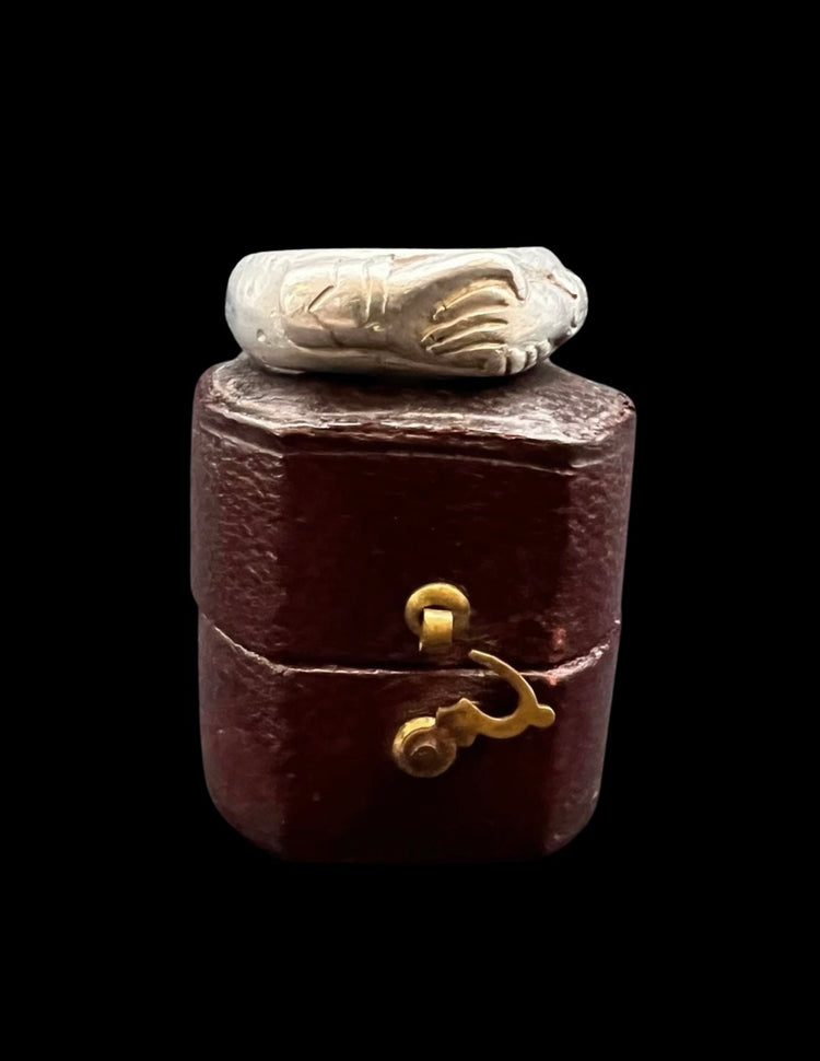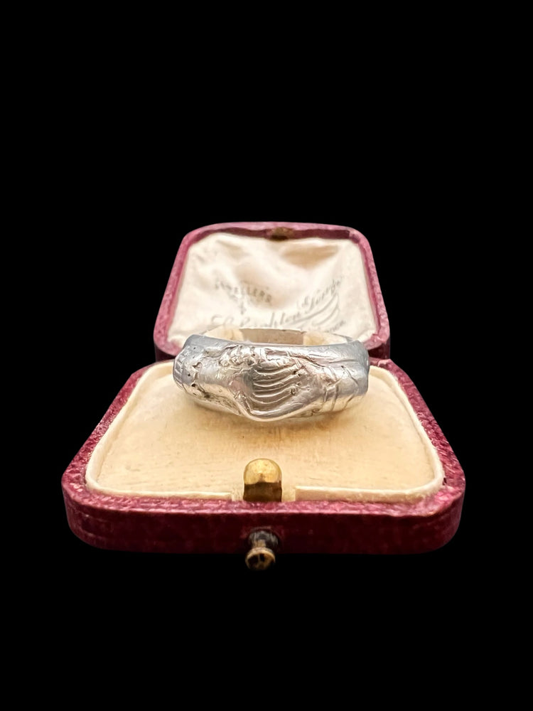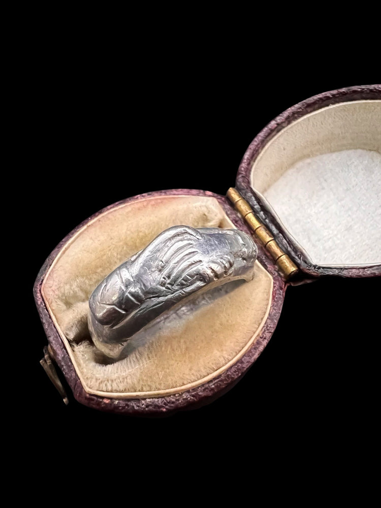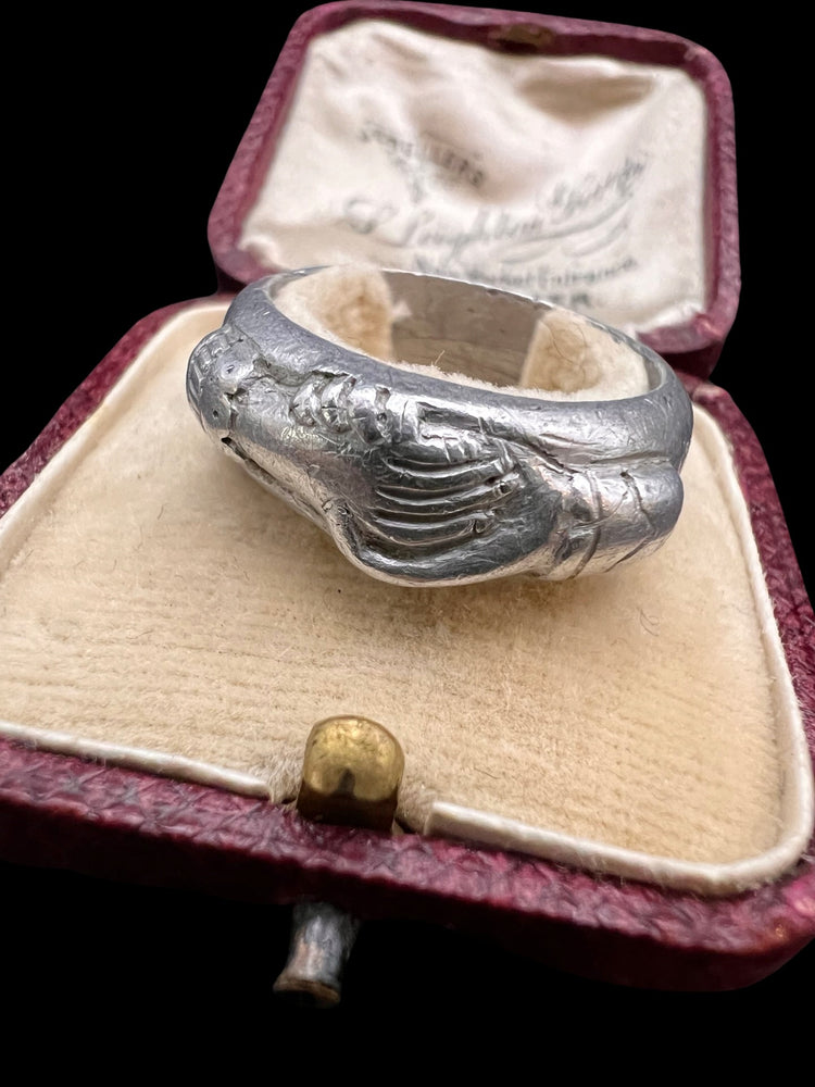 A fascinating trench art ring made of aluminium in the form of a Fede of clasped hands.