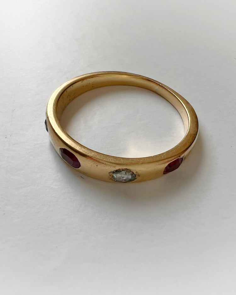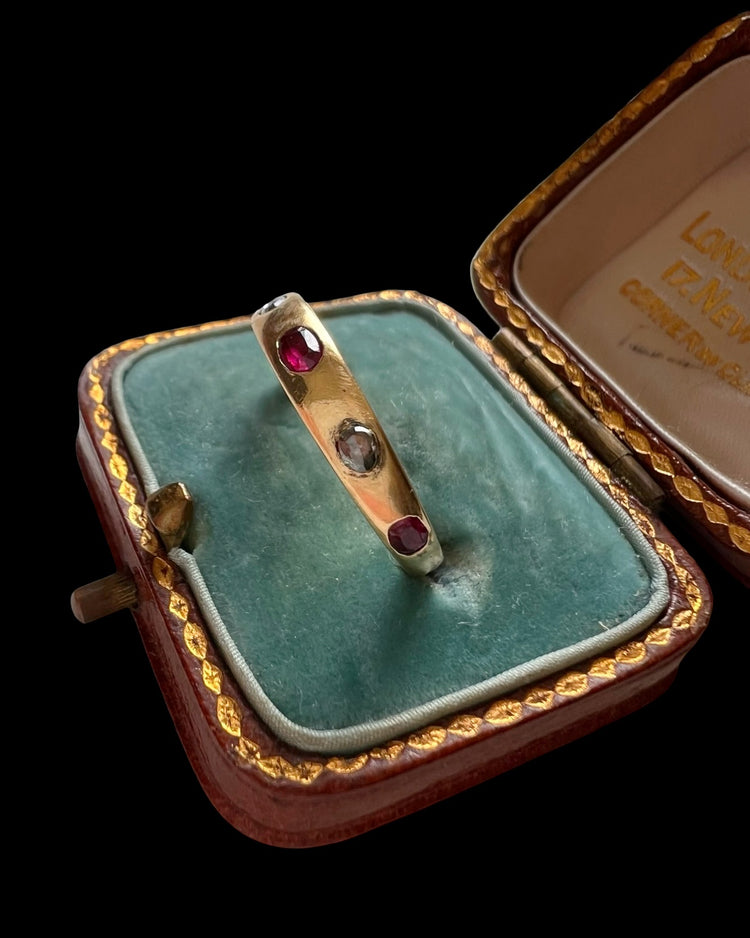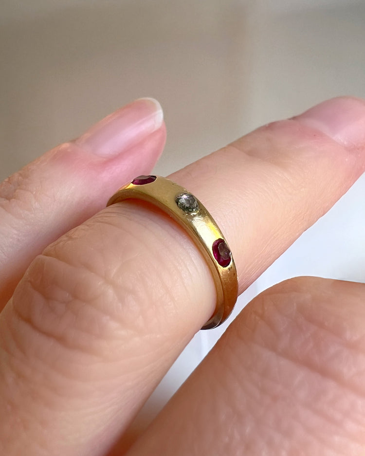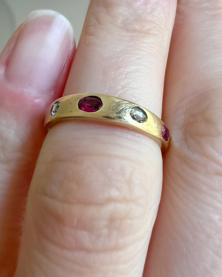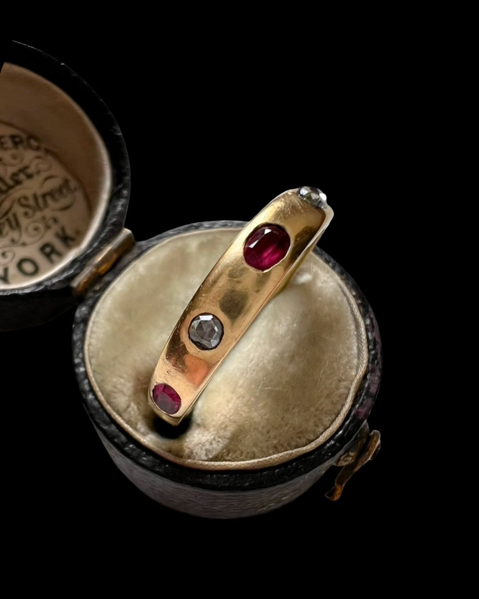The band is set with three faceted rubies alternating with two rosecut diamonds.