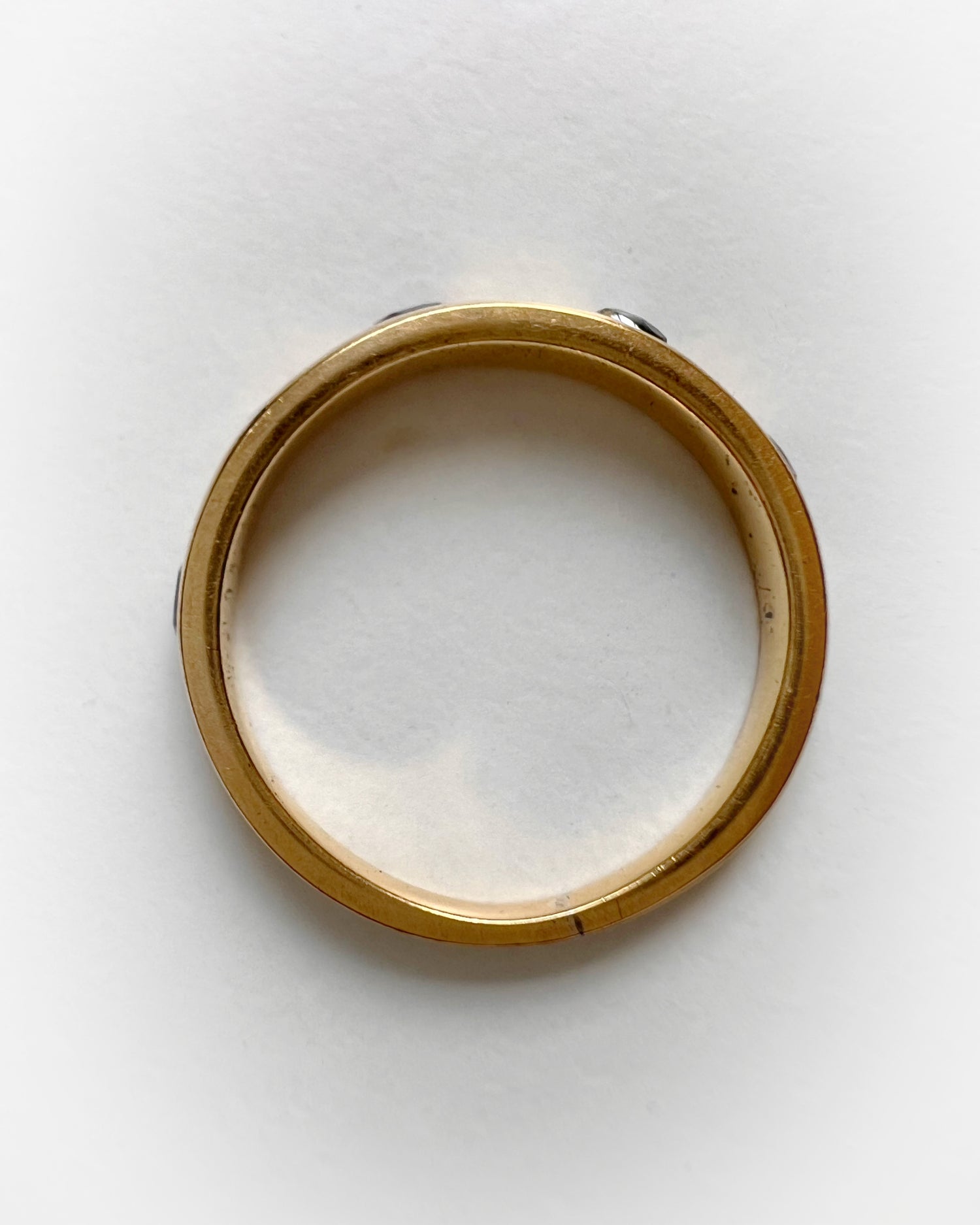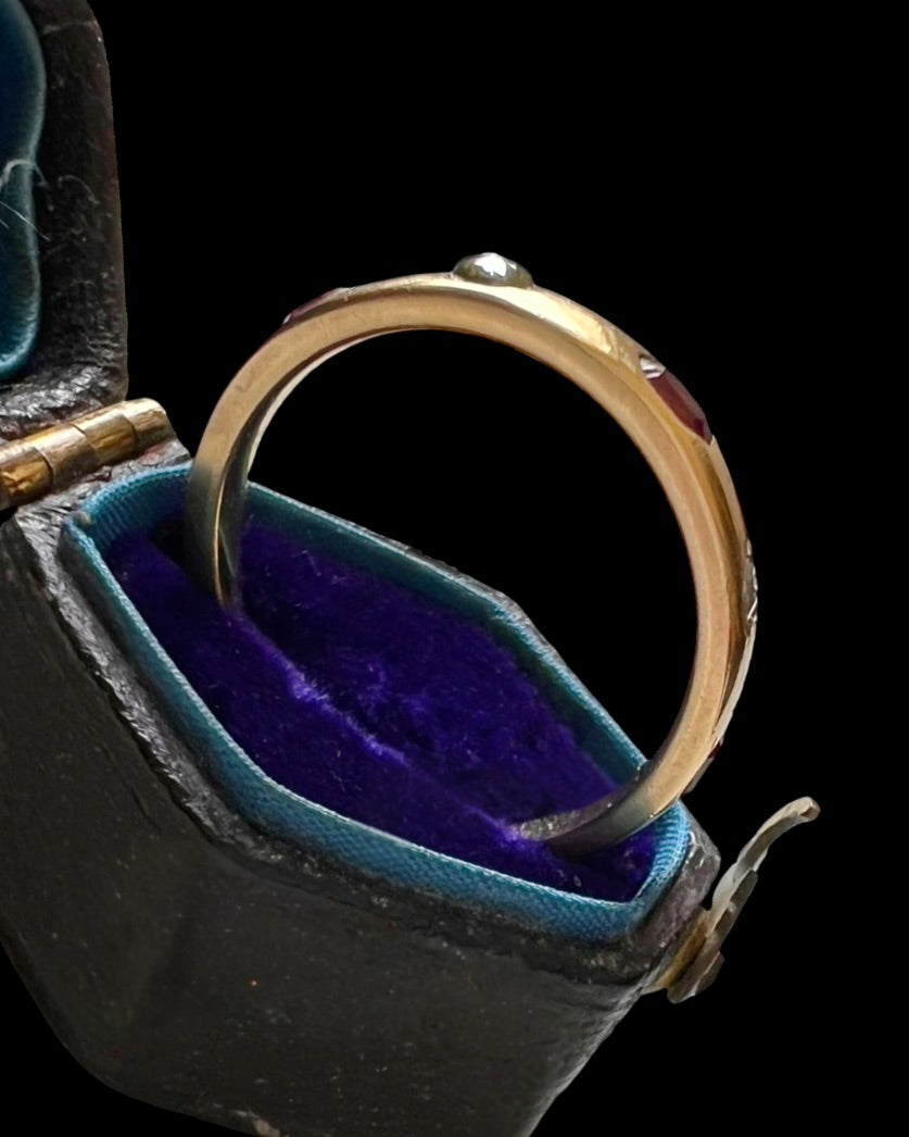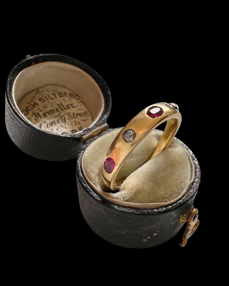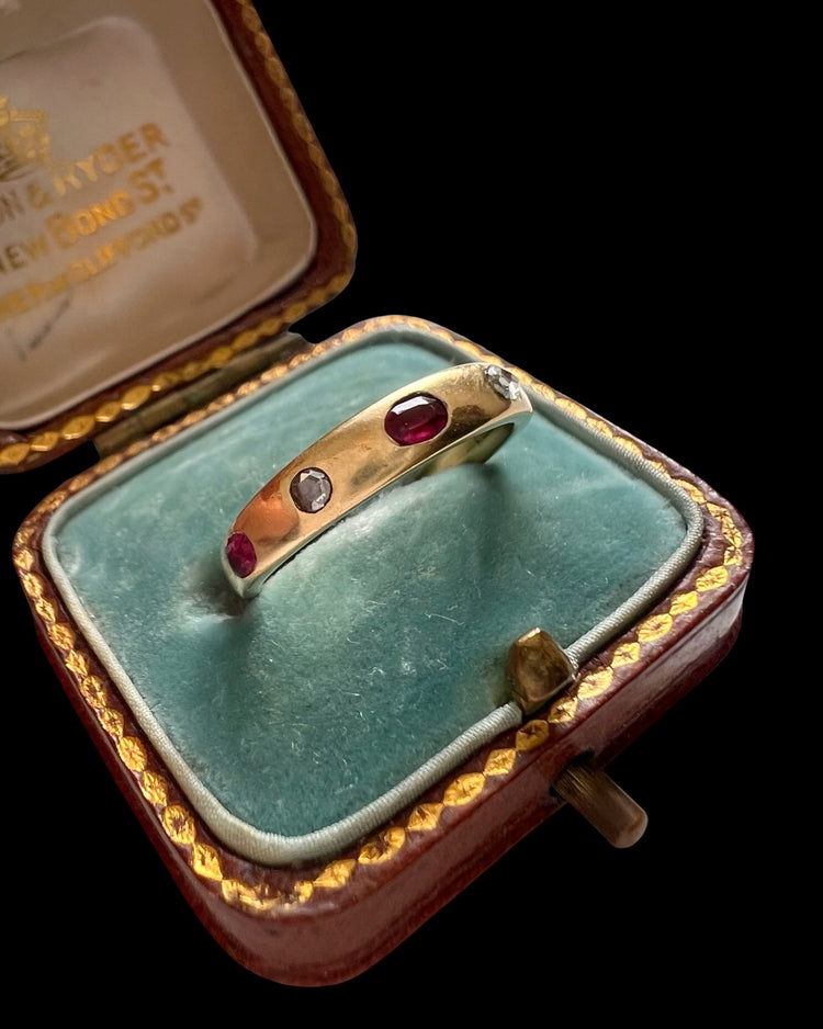 The band is set with three faceted rubies alternating with two rosecut diamonds.