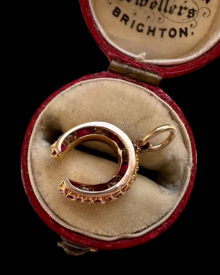 A super cute Victorian Ruby and Diamond horseshoe pendant set in 15ct gold.