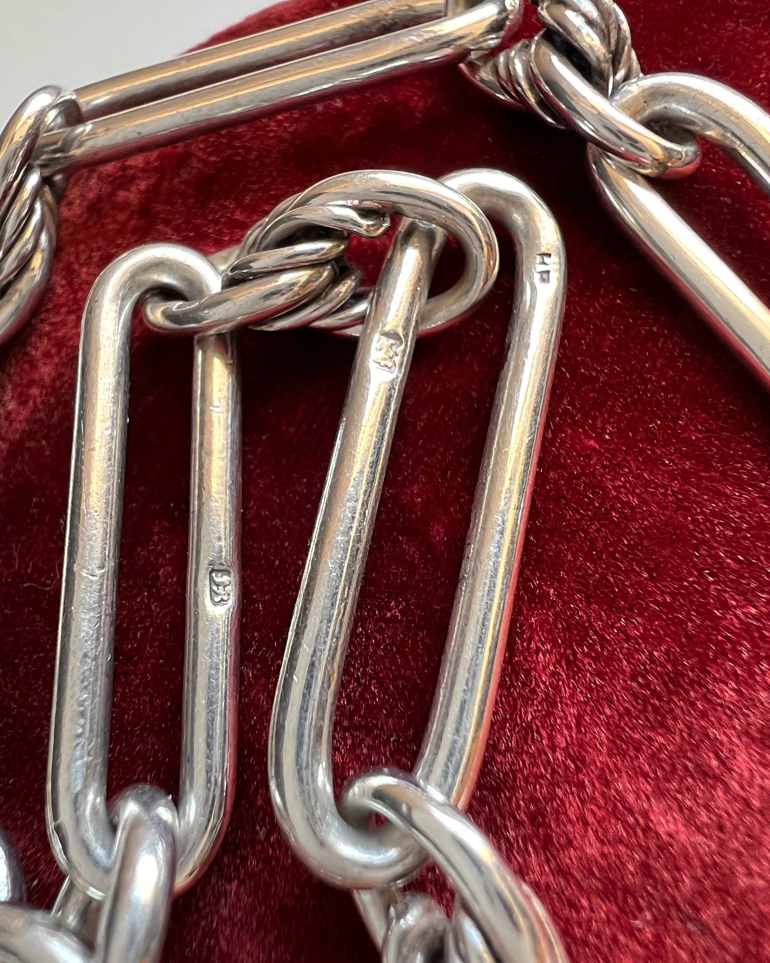 A Lion Passant is marked on nearly every link to indicate the silver is of sterling quality.