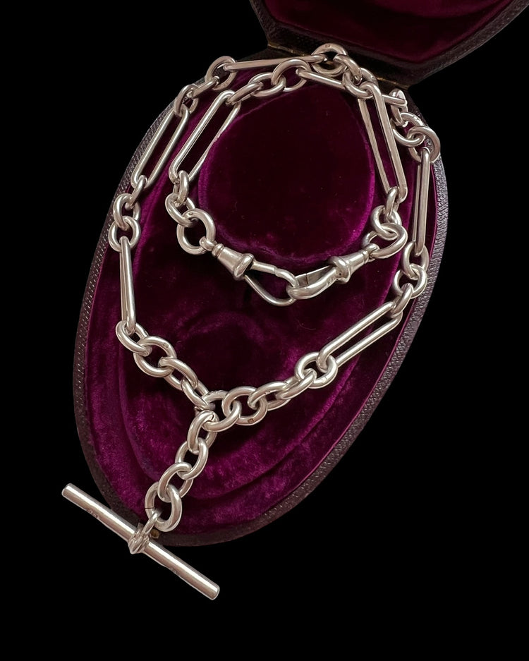 A gorgeous Victorian chunky silver paperclip Albert chain with T-bar.