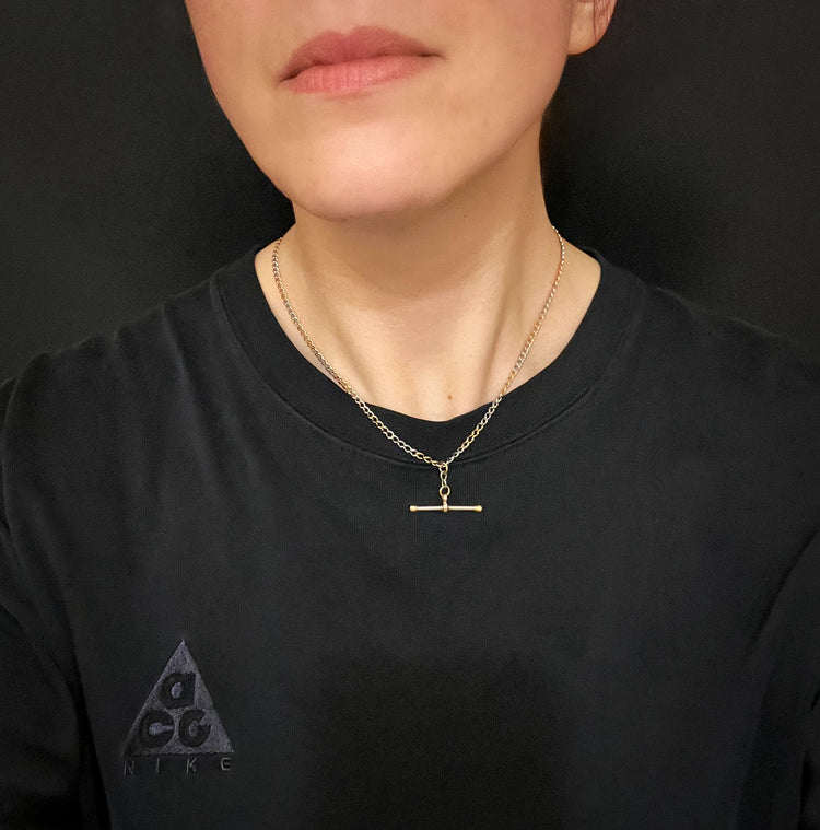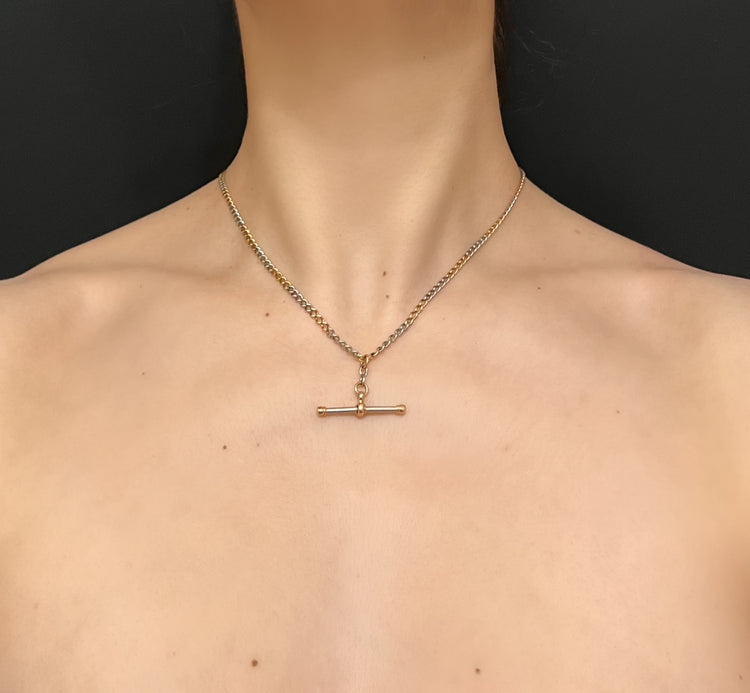 The two coloured t-bar is not fixed, so can move up and down the chain, ensuring that it always sits centrally when worn.