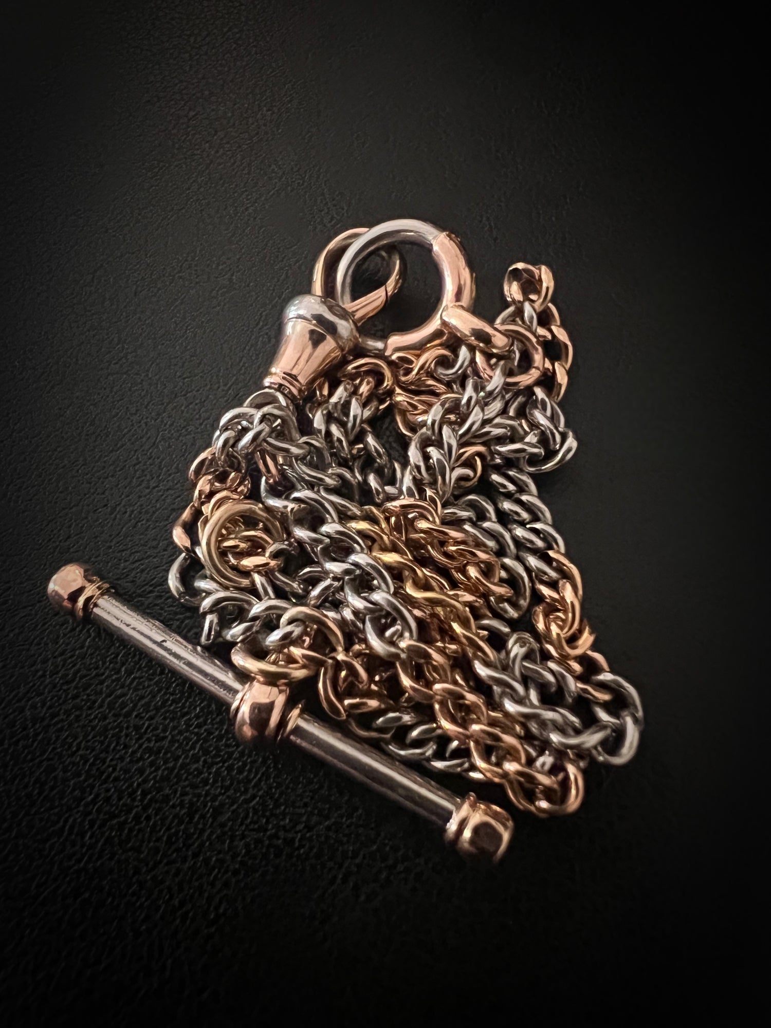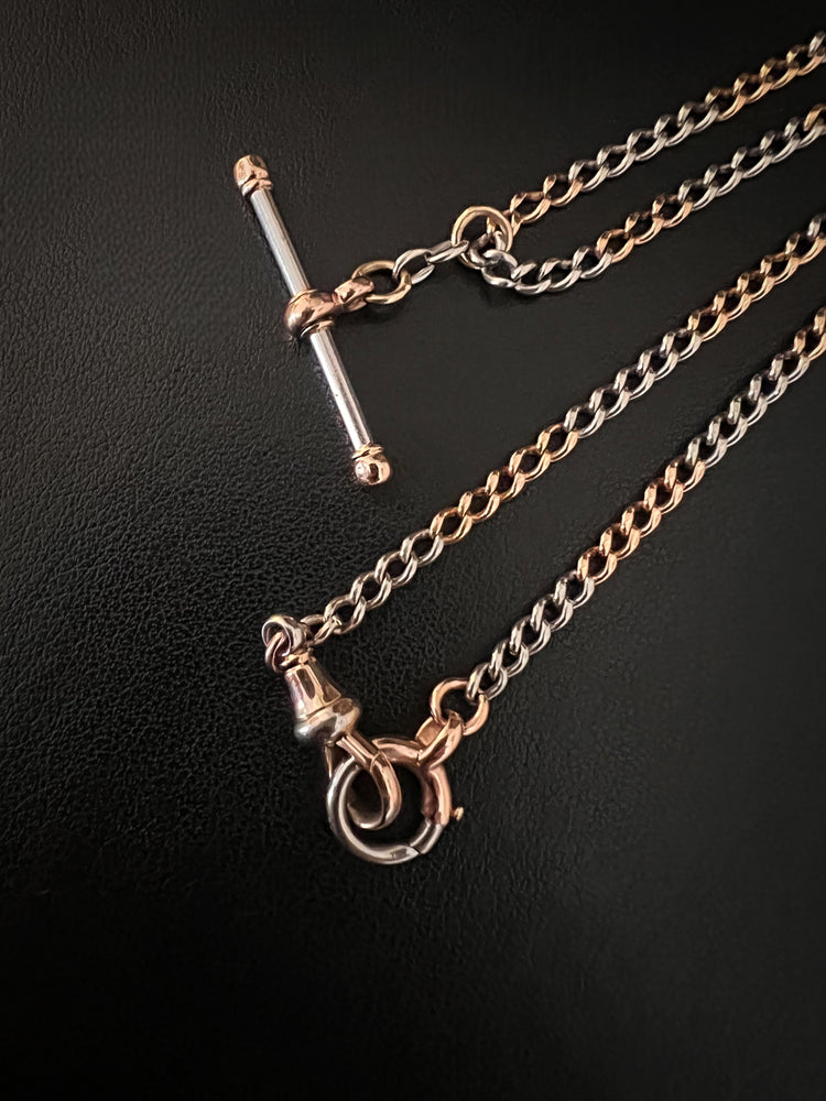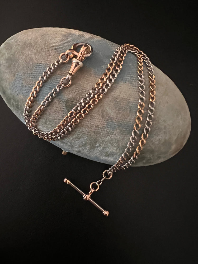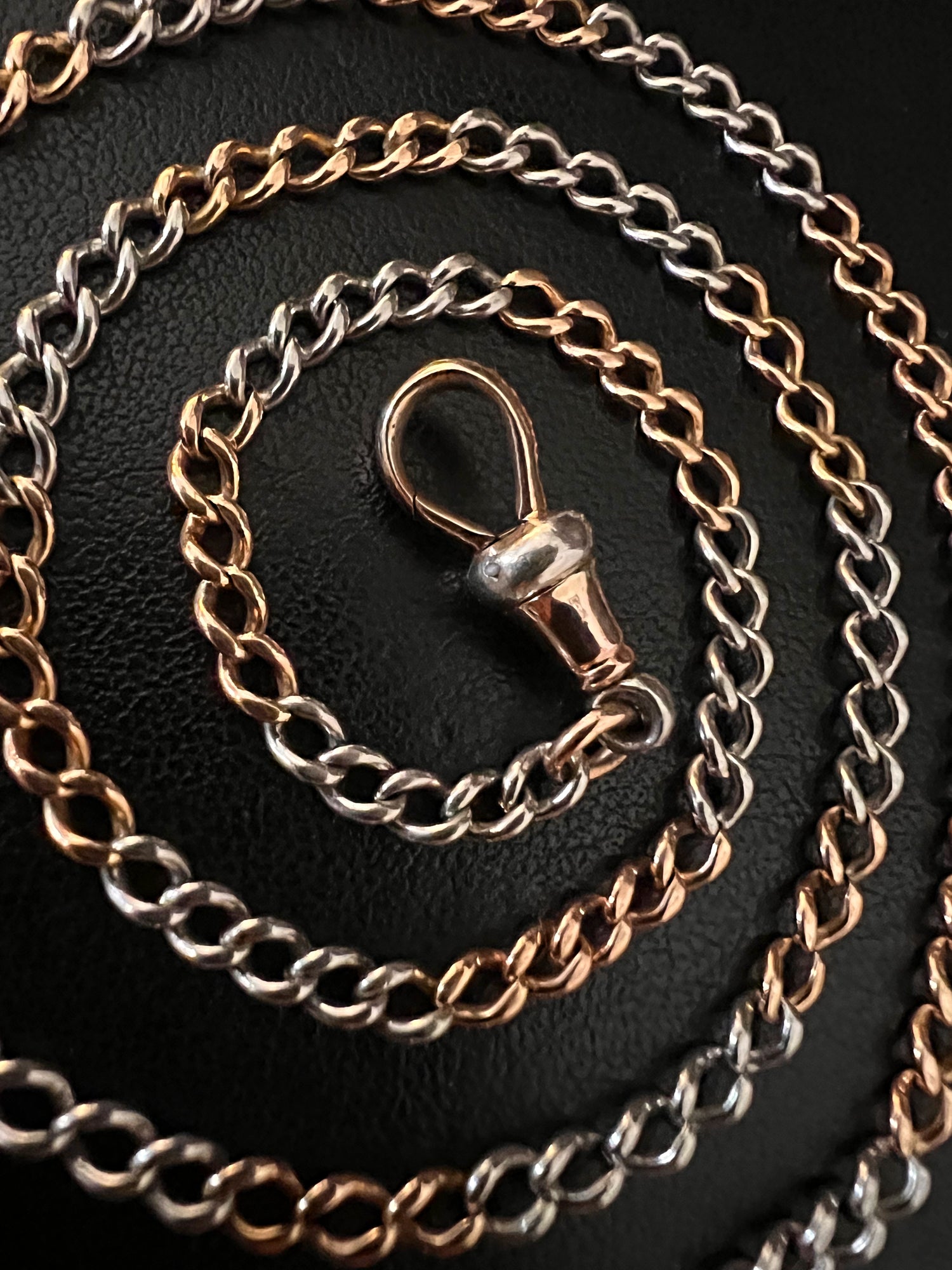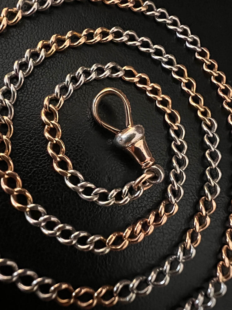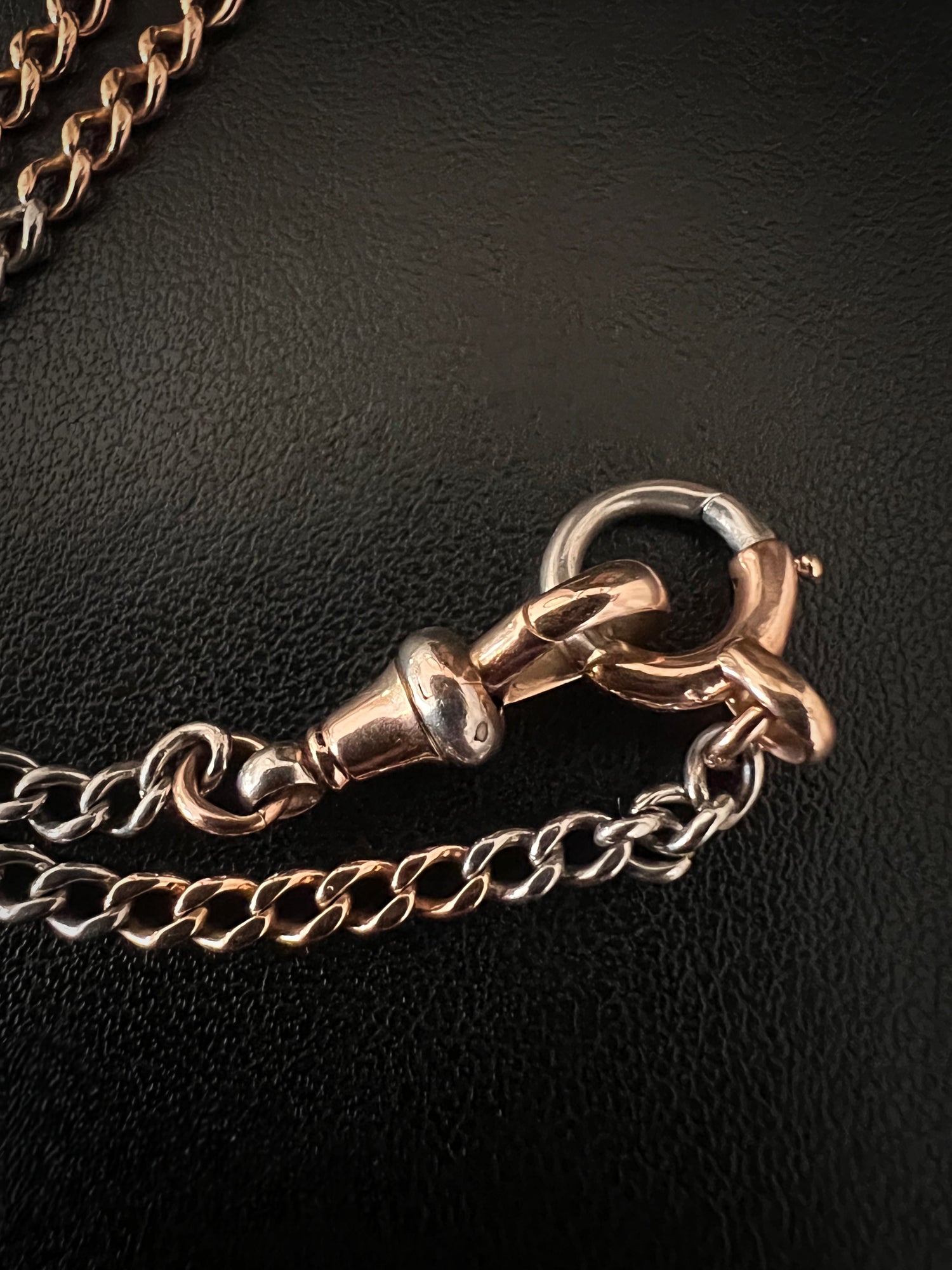 The chain has sections of rose gold and platinum and closes with a chunky two colour dog clip and solid two colour spring bolt.