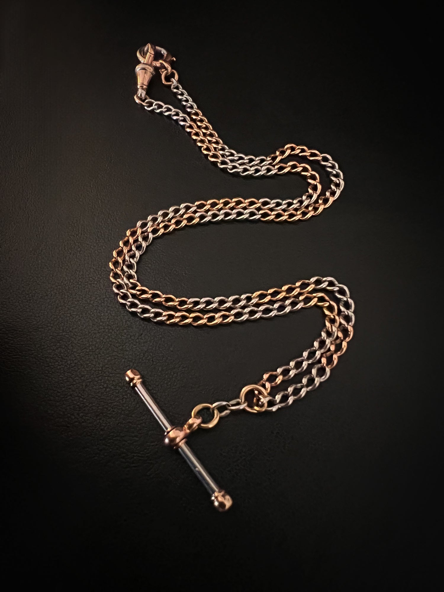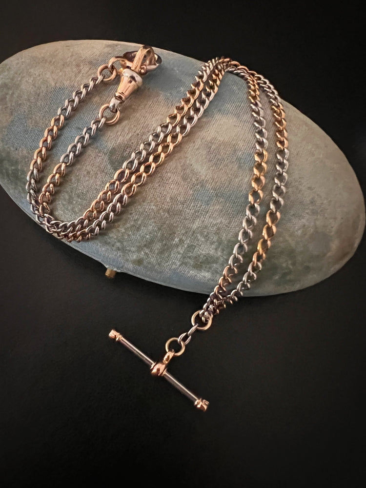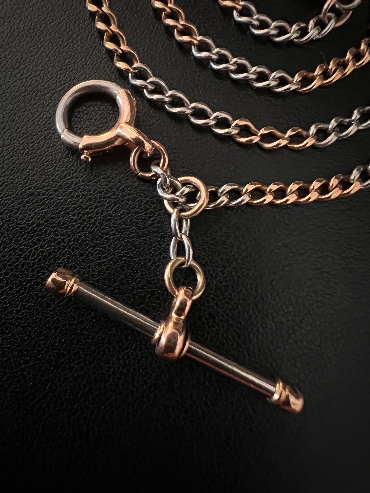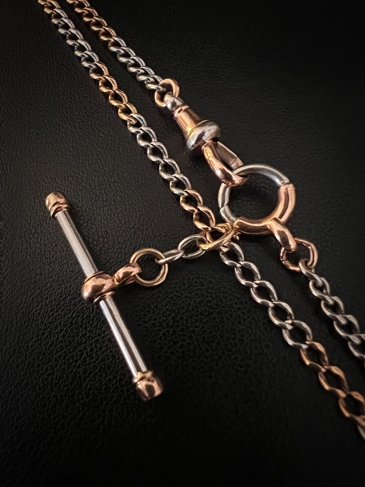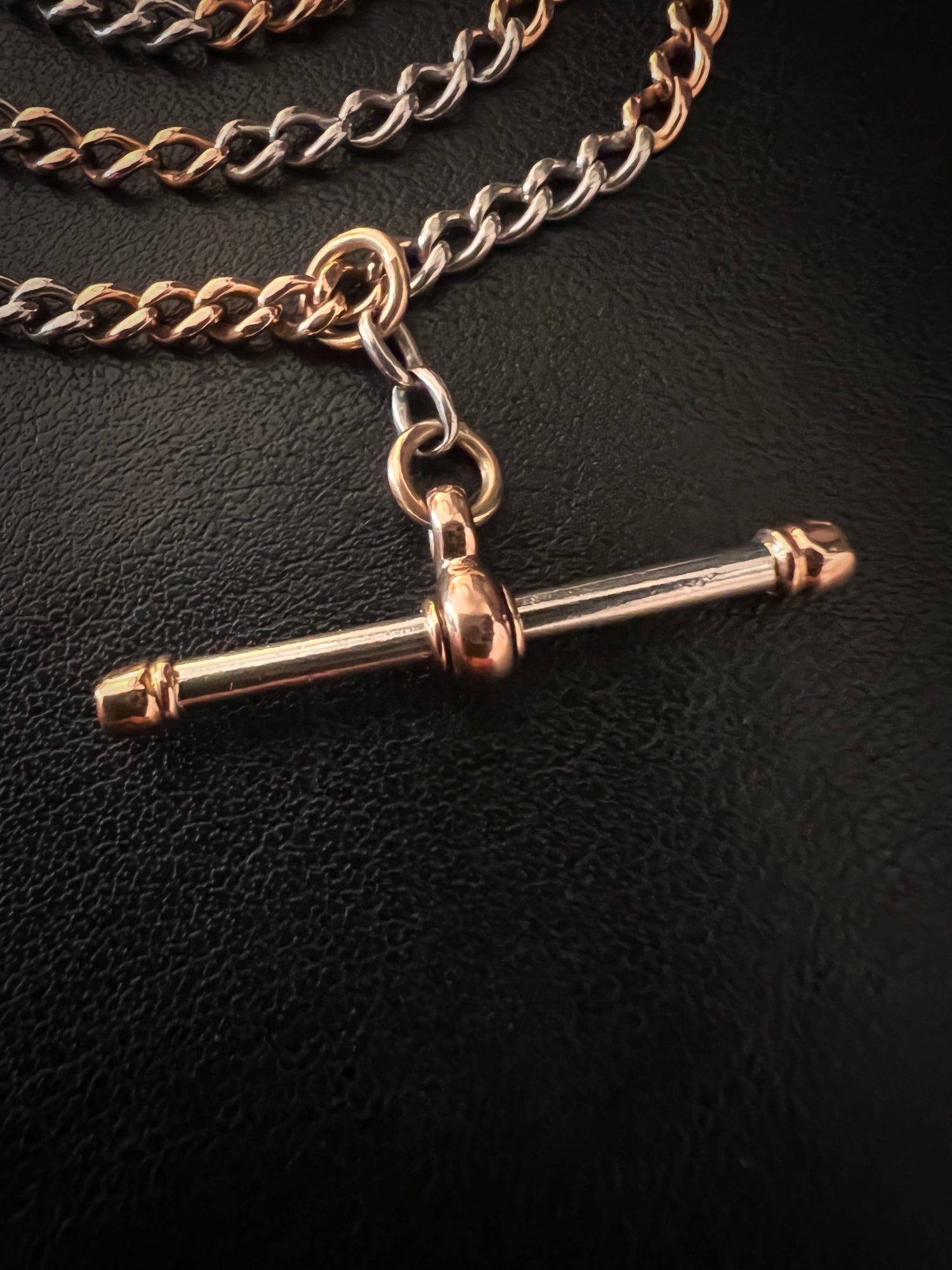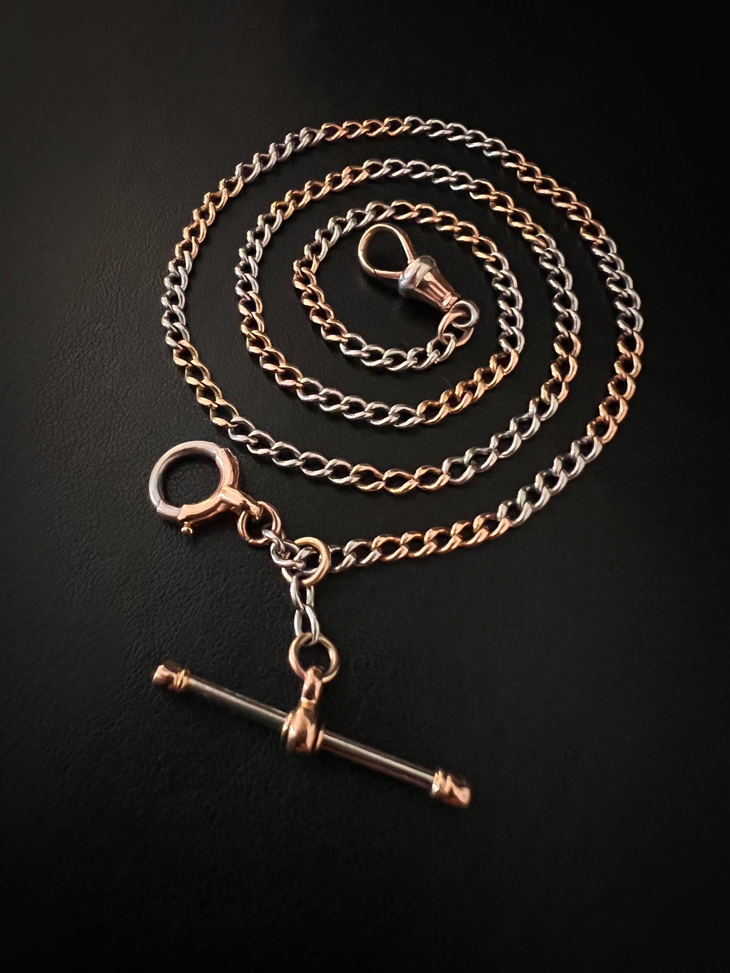 The chain has sections of rose gold and platinum and closes with a chunky two colour dog clip and solid two colour spring bolt.