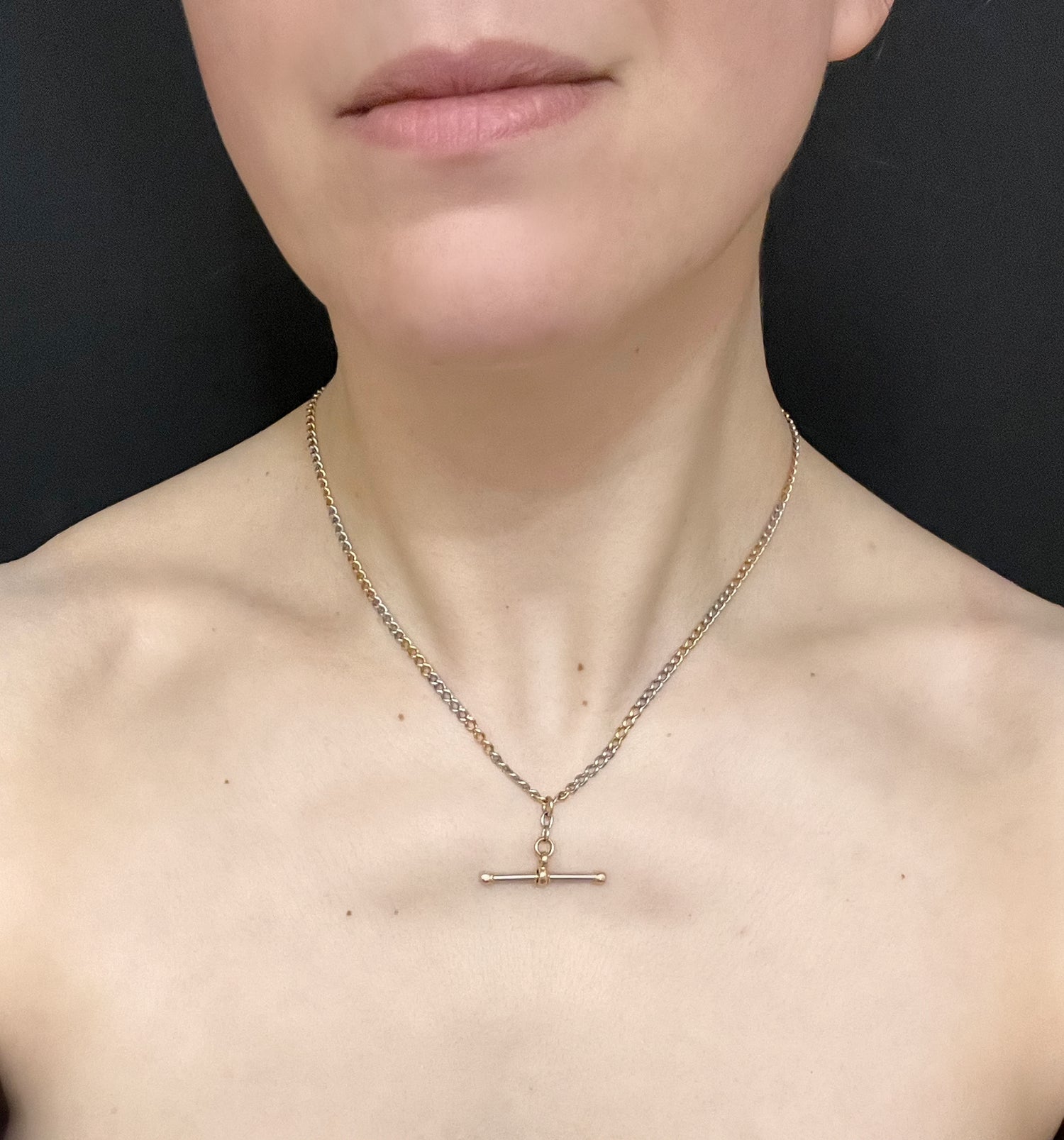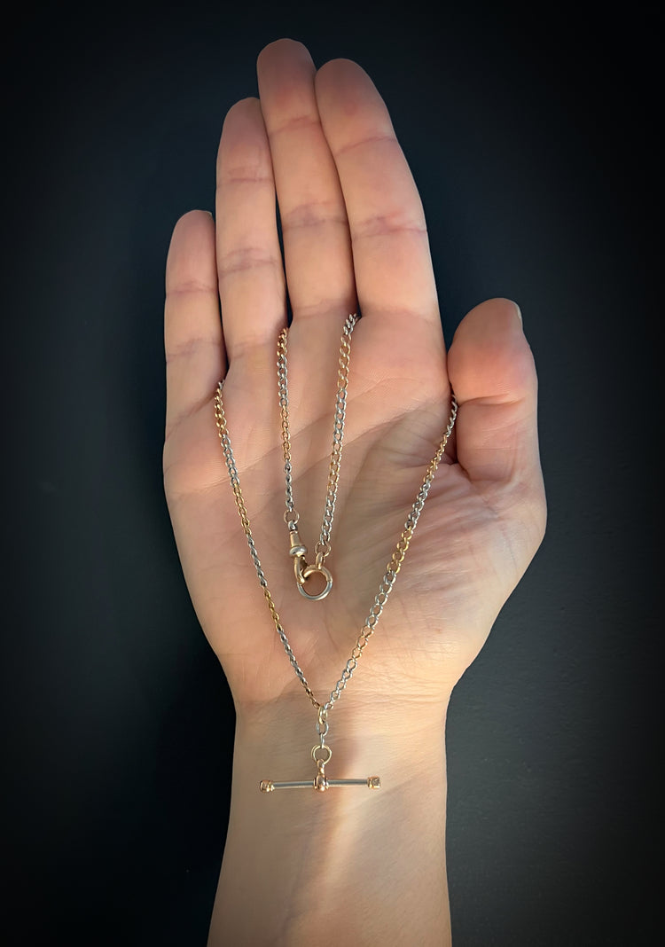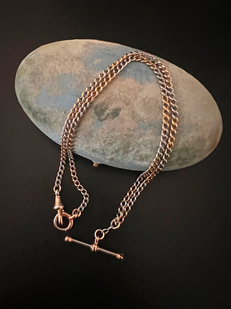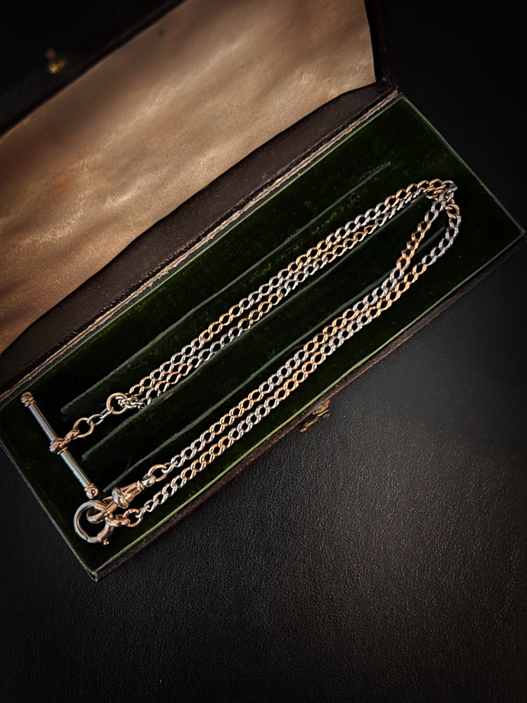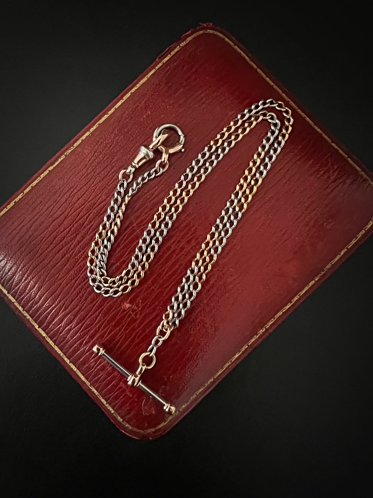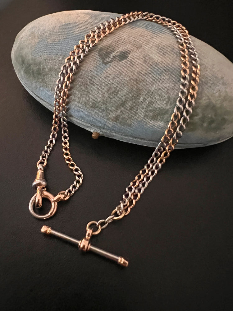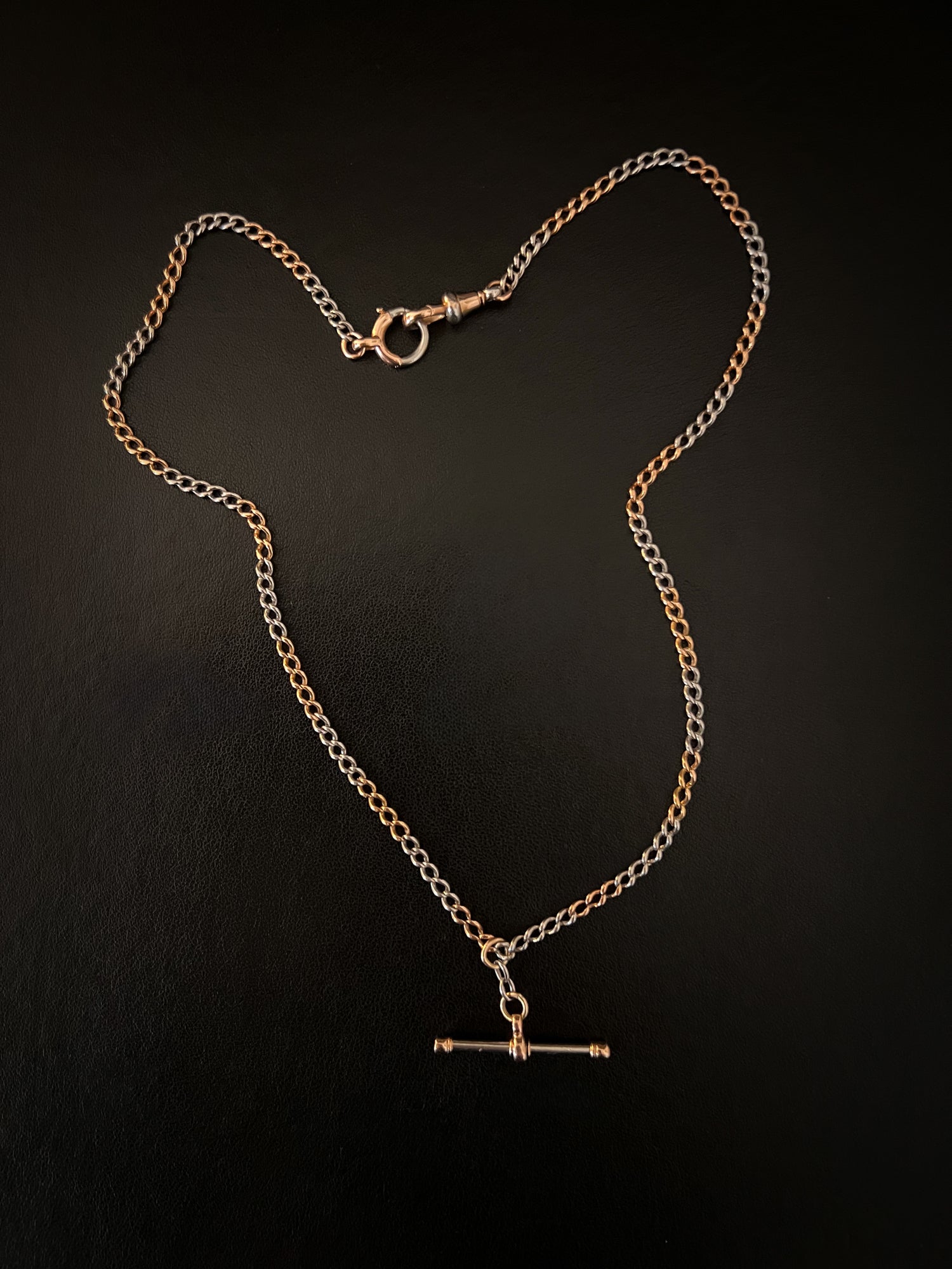 The chain has sections of rose gold and platinum and closes with a chunky two colour dog clip and solid two colour spring bolt.