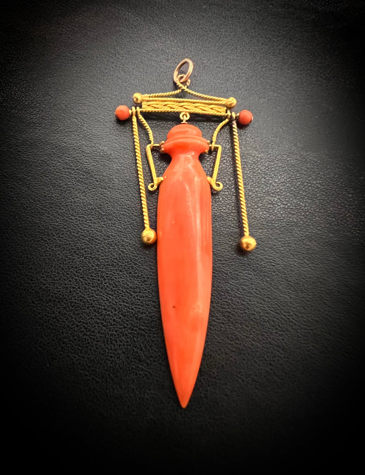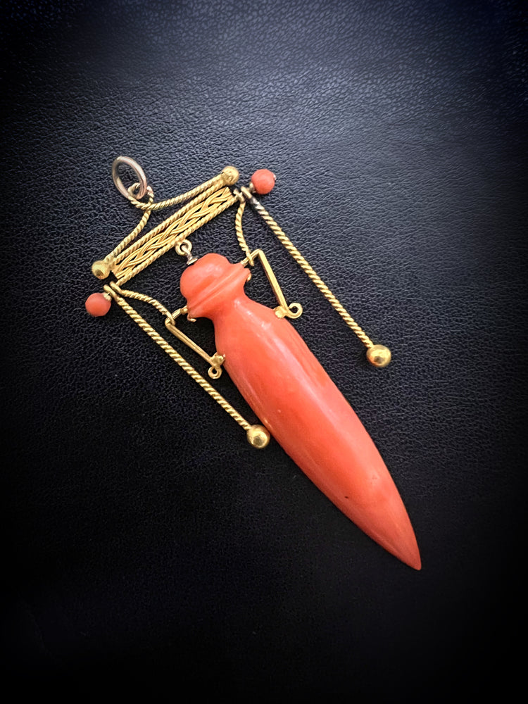 Exquisite Italian Coral Etruscan Revival Amphora pendant with high carat gold wire work! Circa1860.