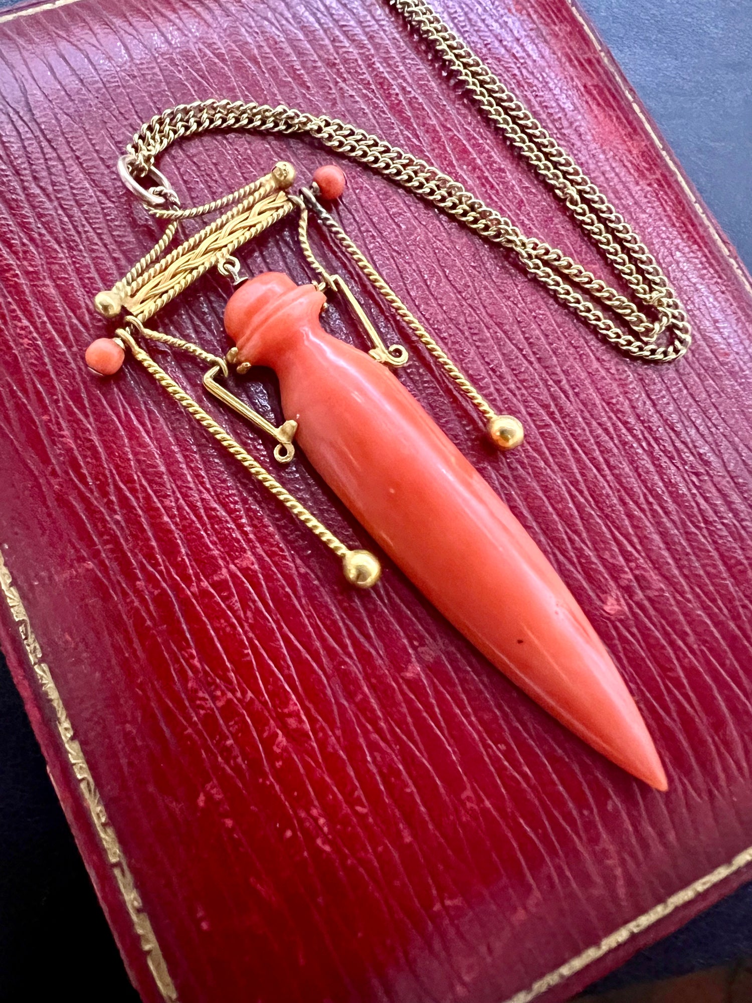 The beautifully carved coral urn is suspended from plaited and rope high carat gold work.