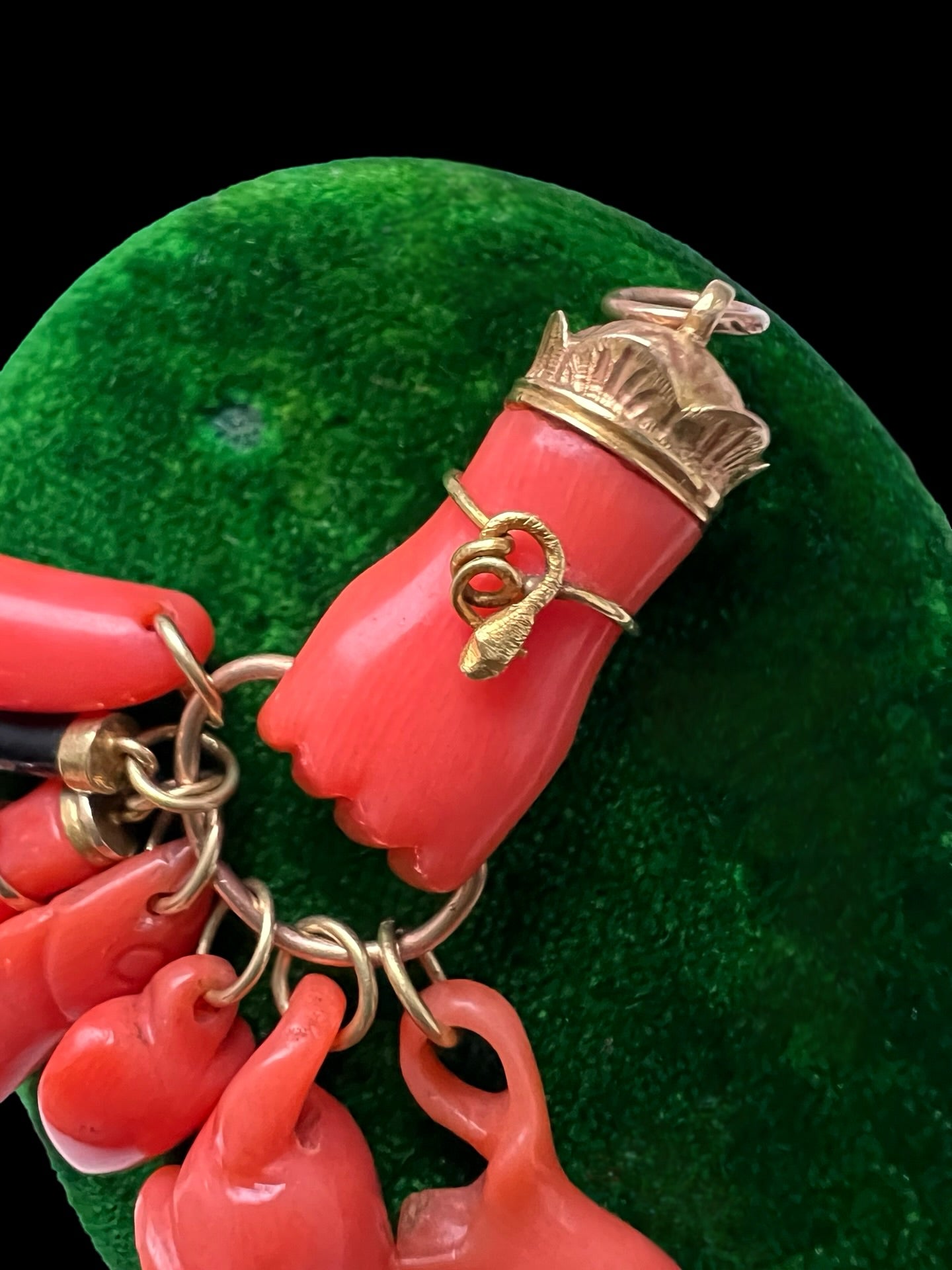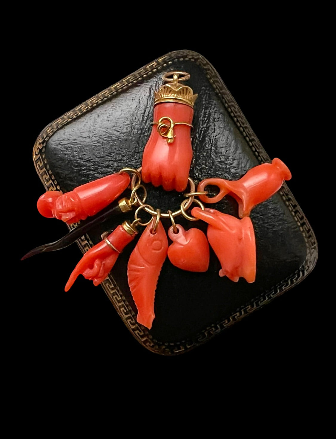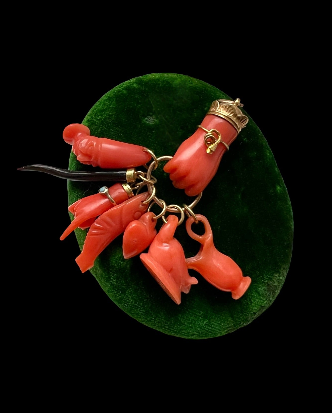The hand, which is beautifully carved with superb detail down to the fingertips, is clasping seven coral amulets, including a chubby mouse, a fish, a puffy heart and a mini Figa hand wearing a turquoise set bracelet!
