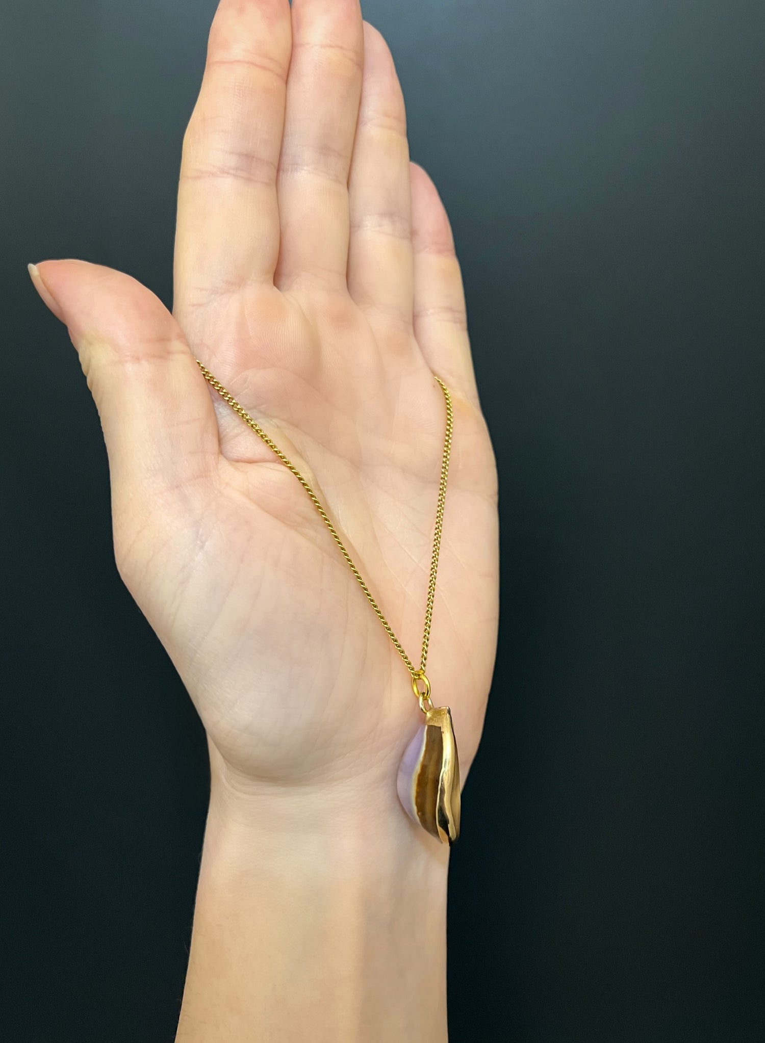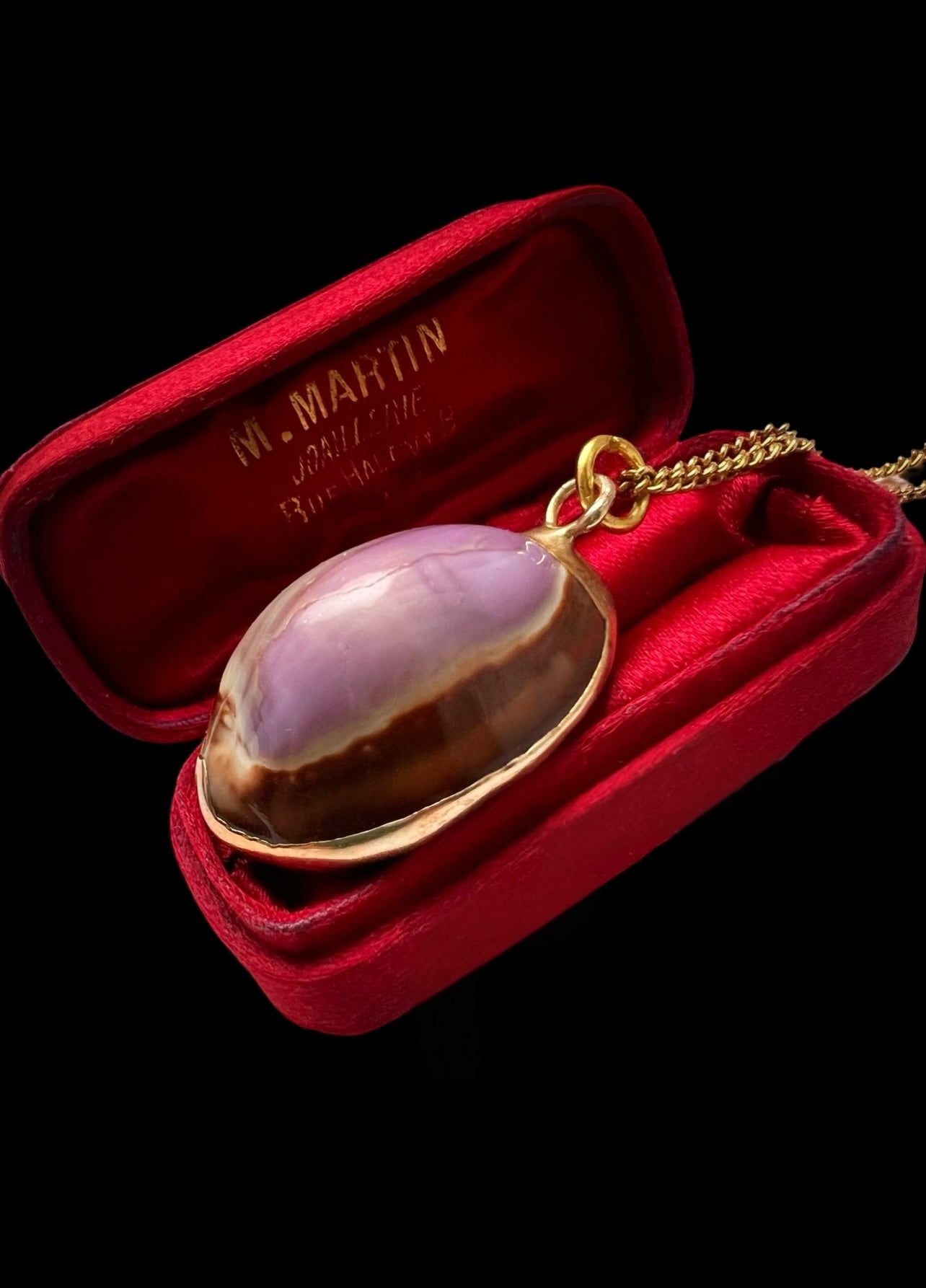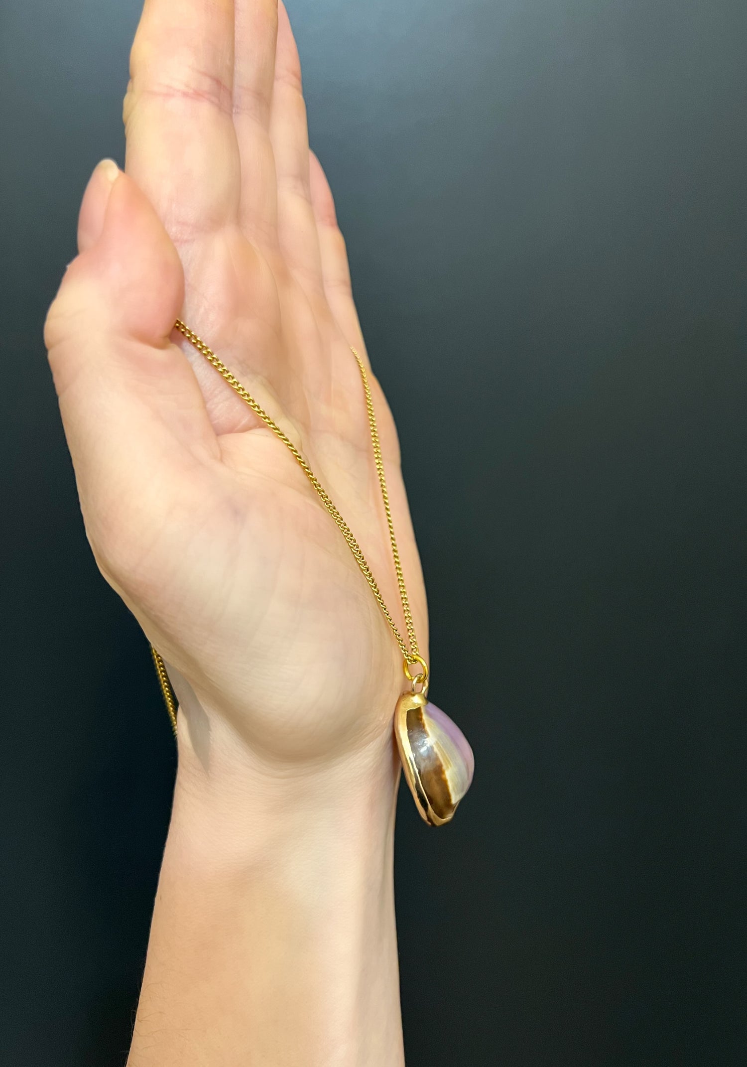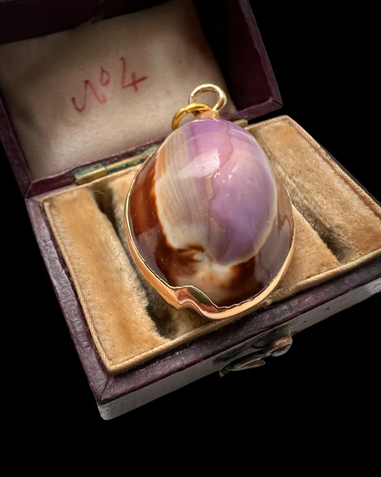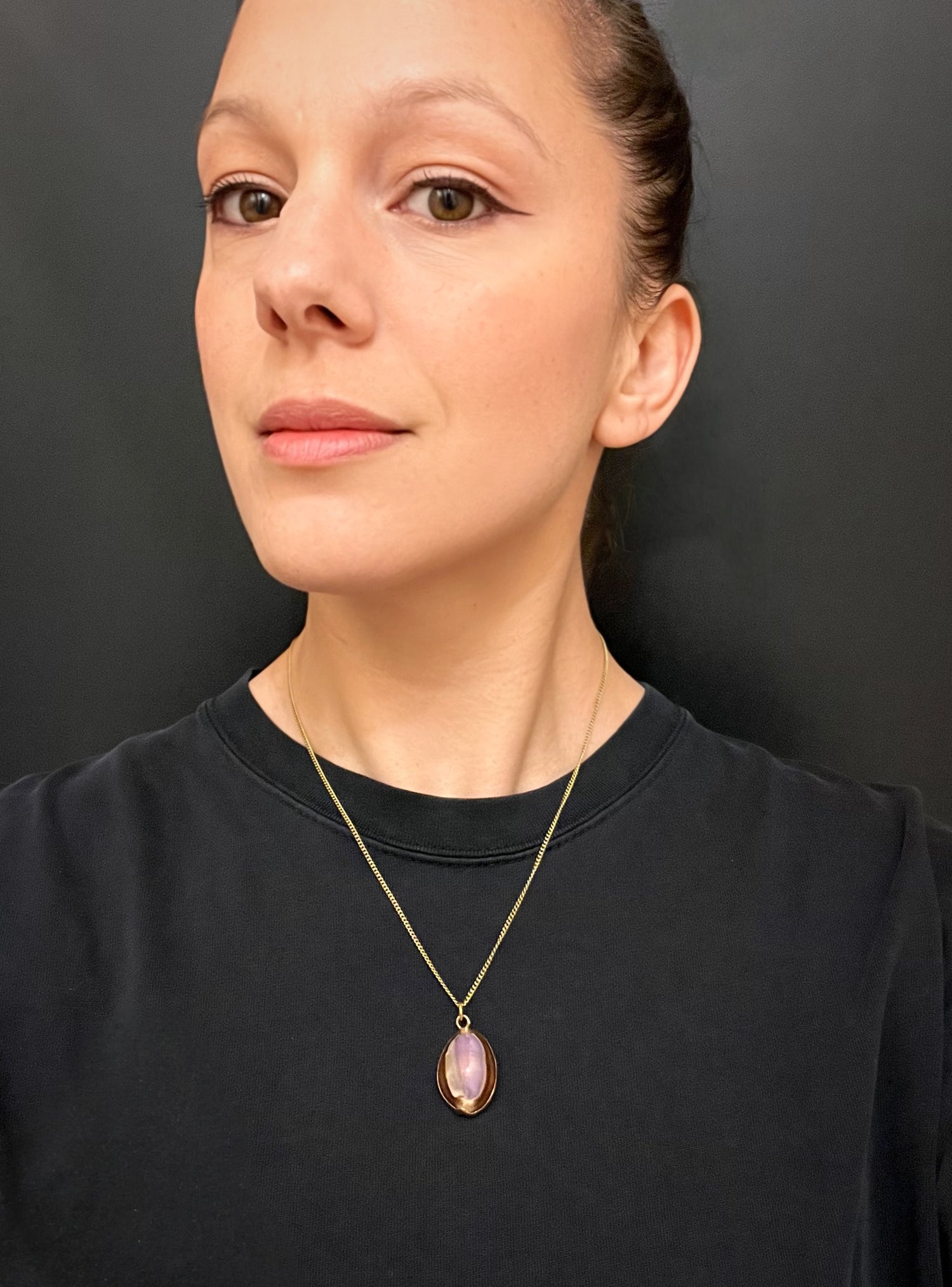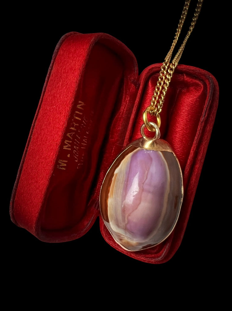 The pendant can be worn either way round, with the purple and tan shades at the front or, with the shell opening at the front.
