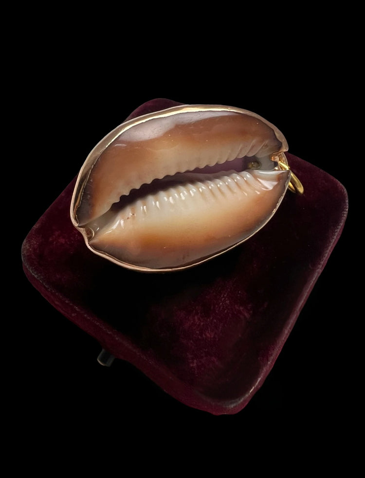 Likely made in the early 19th century, the cowrie shell has been set in a beautifully smooth high carat gold rub over setting that follows the organic form of the shell edge perfectly.