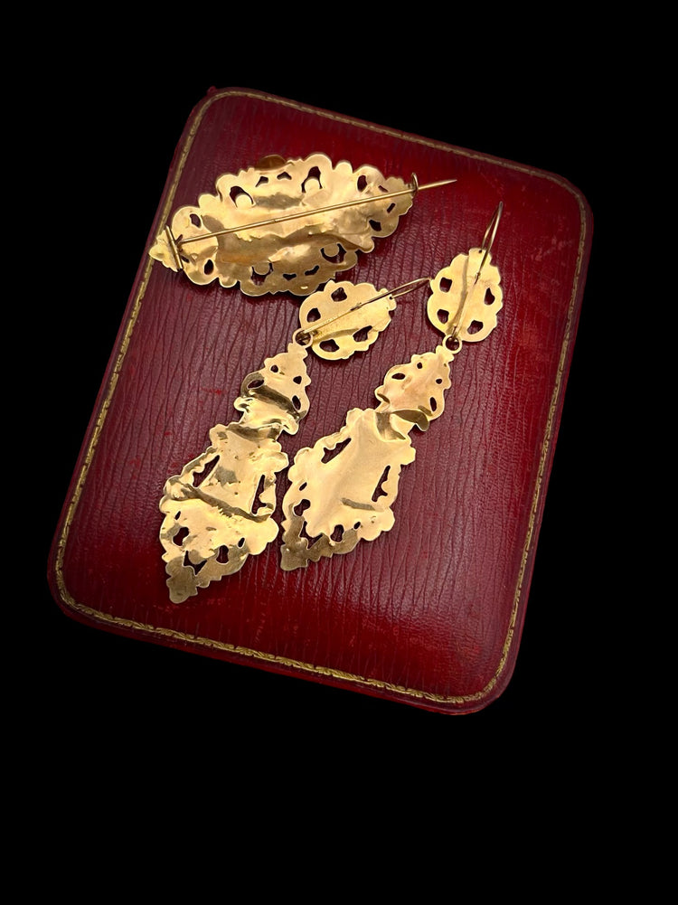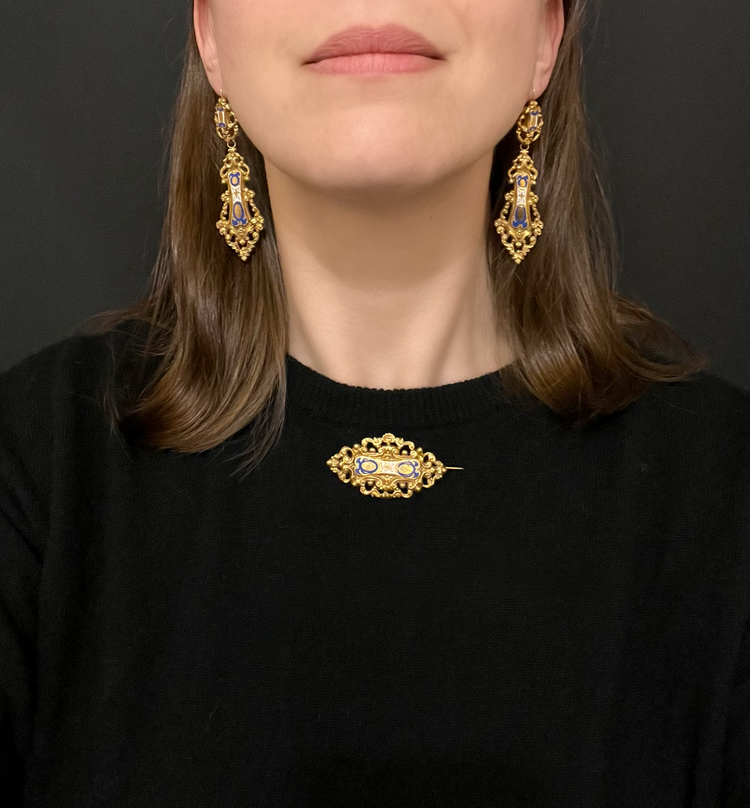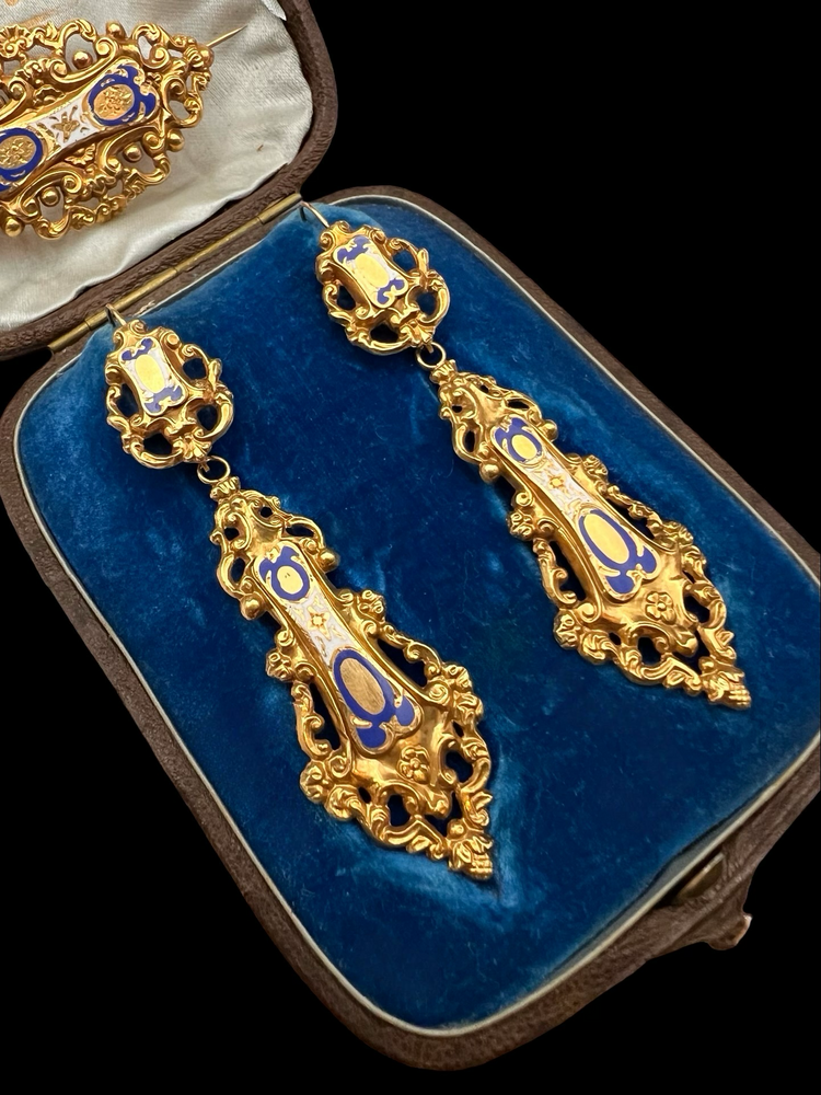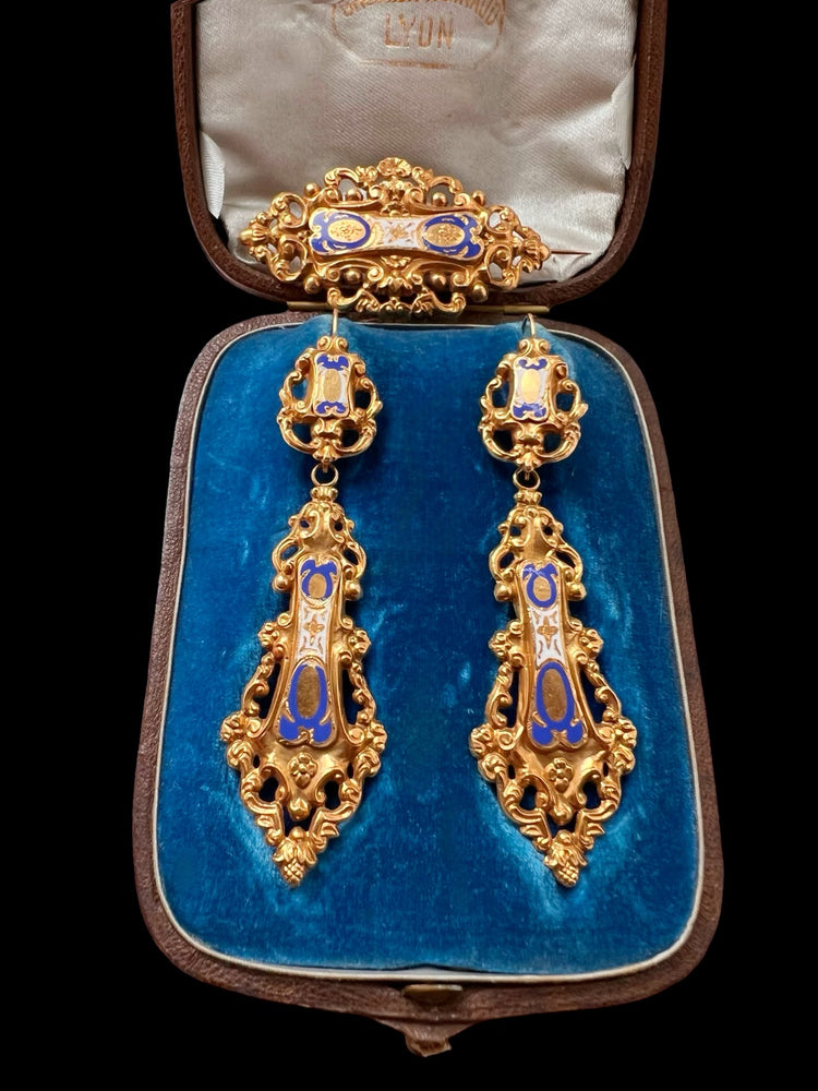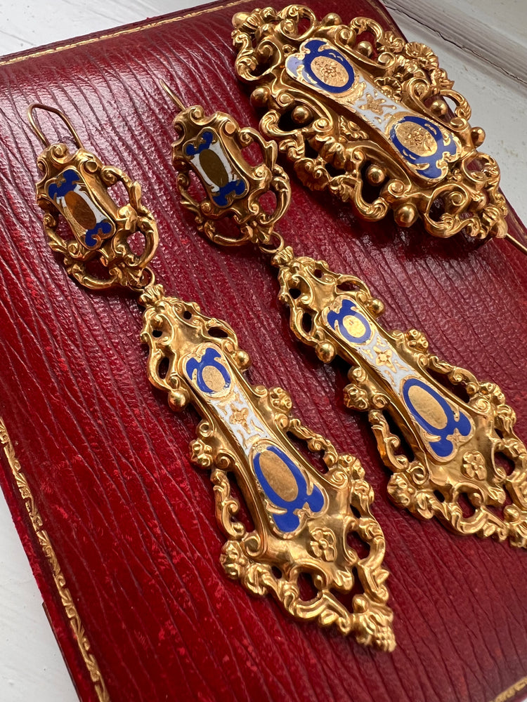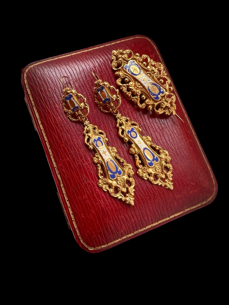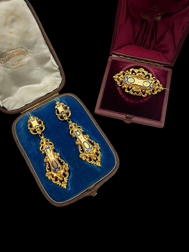 19TH CENTURY FRENCH 18CT GOLD & ENAMEL EARRINGS & BROOCH DEMI PARURE