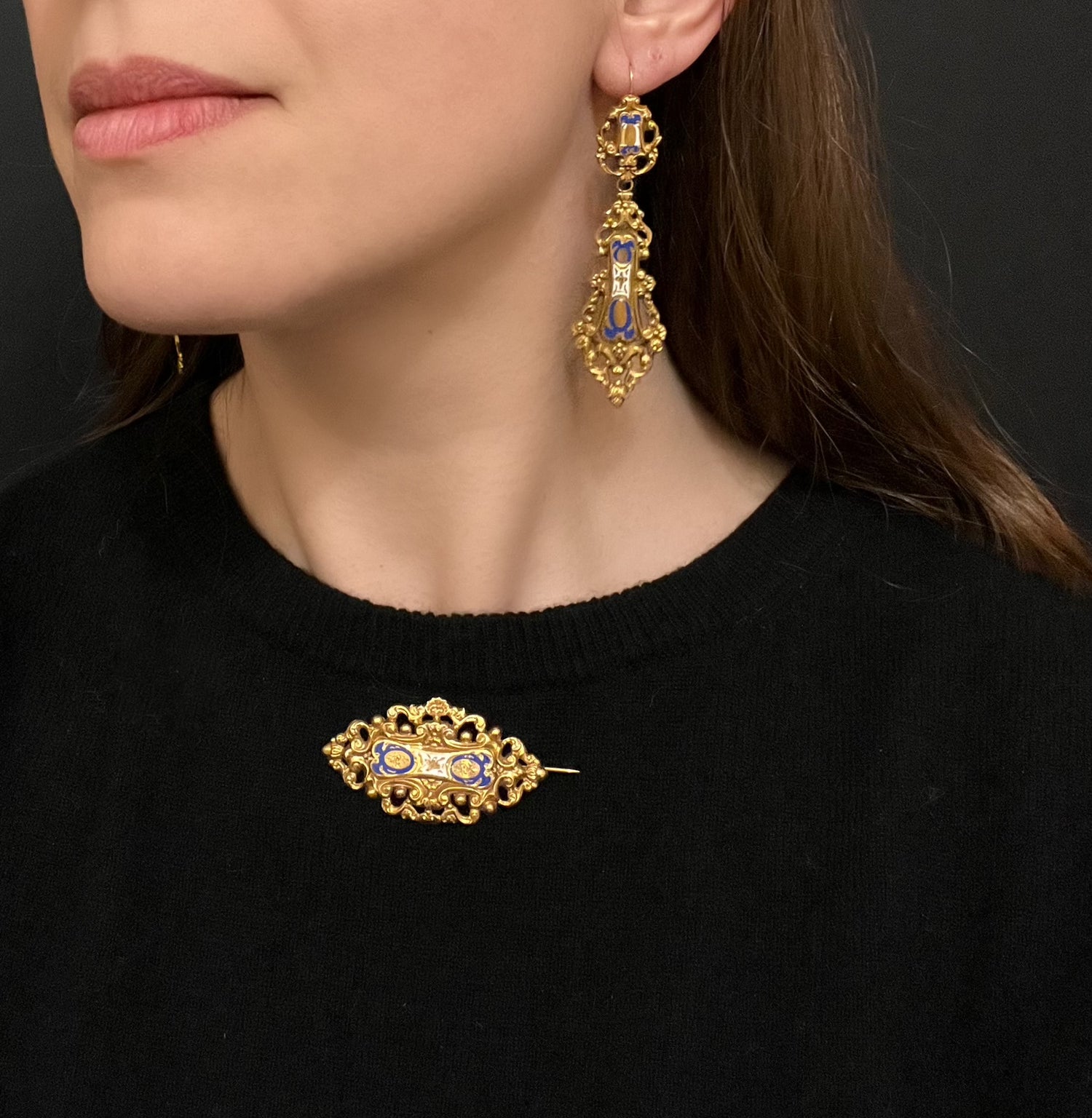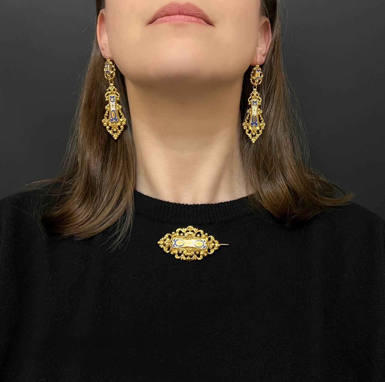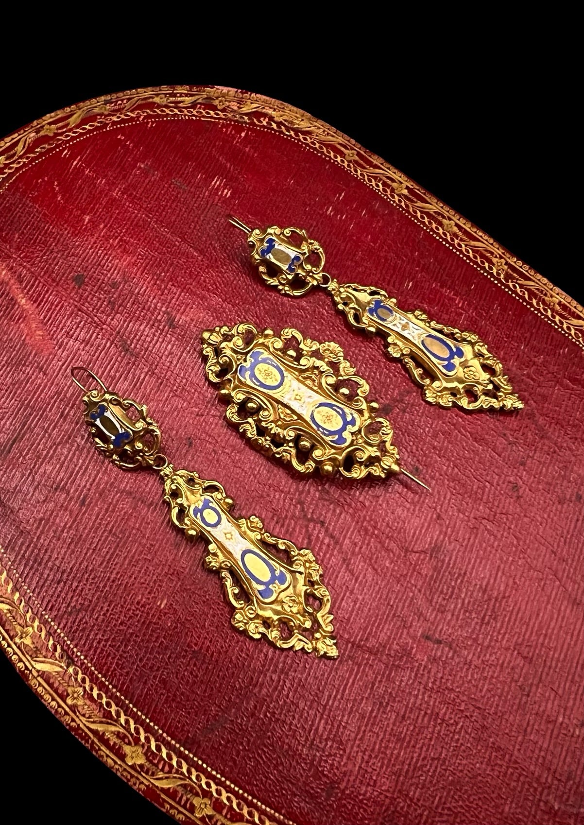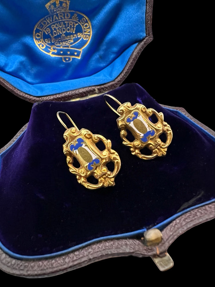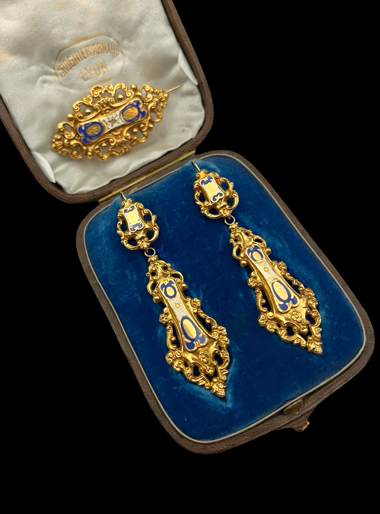 19TH CENTURY FRENCH 18CT GOLD & ENAMEL EARRINGS & BROOCH DEMI PARURE