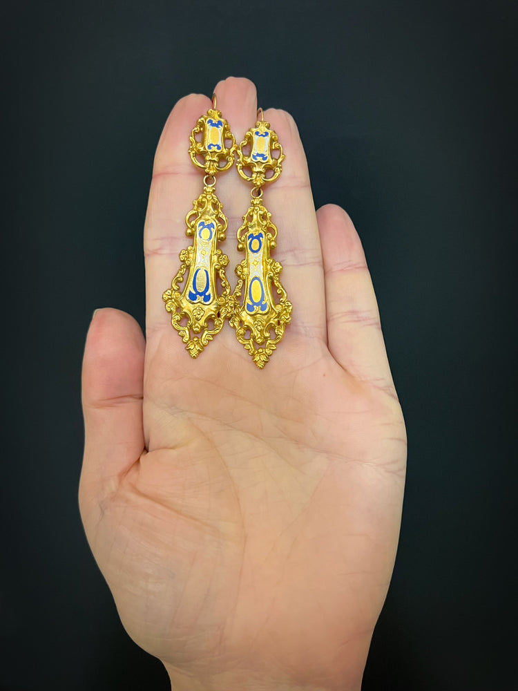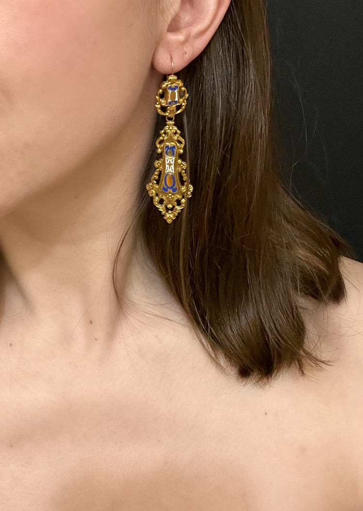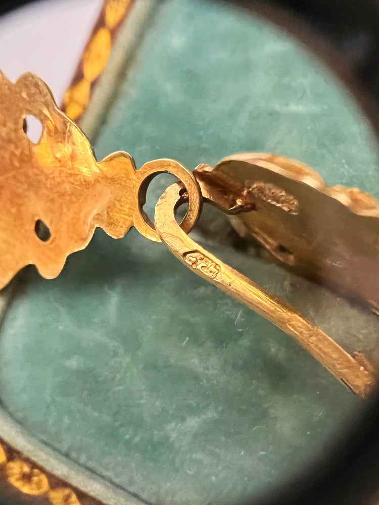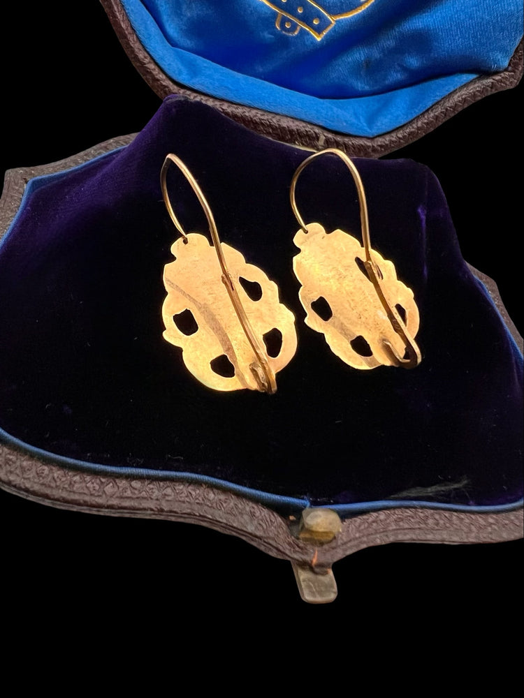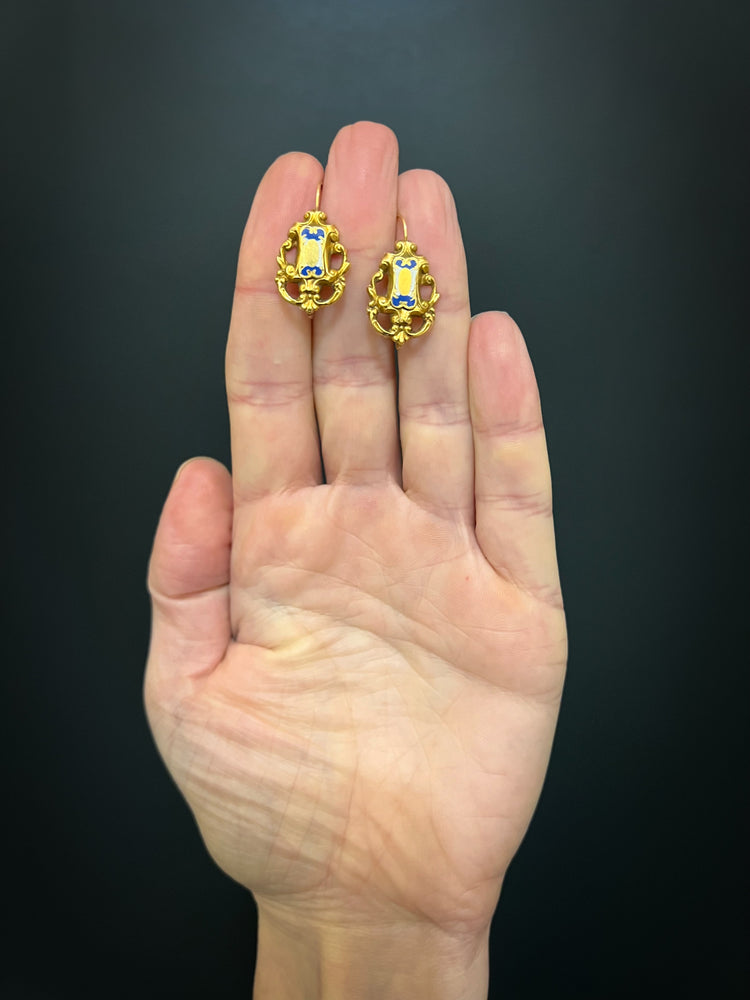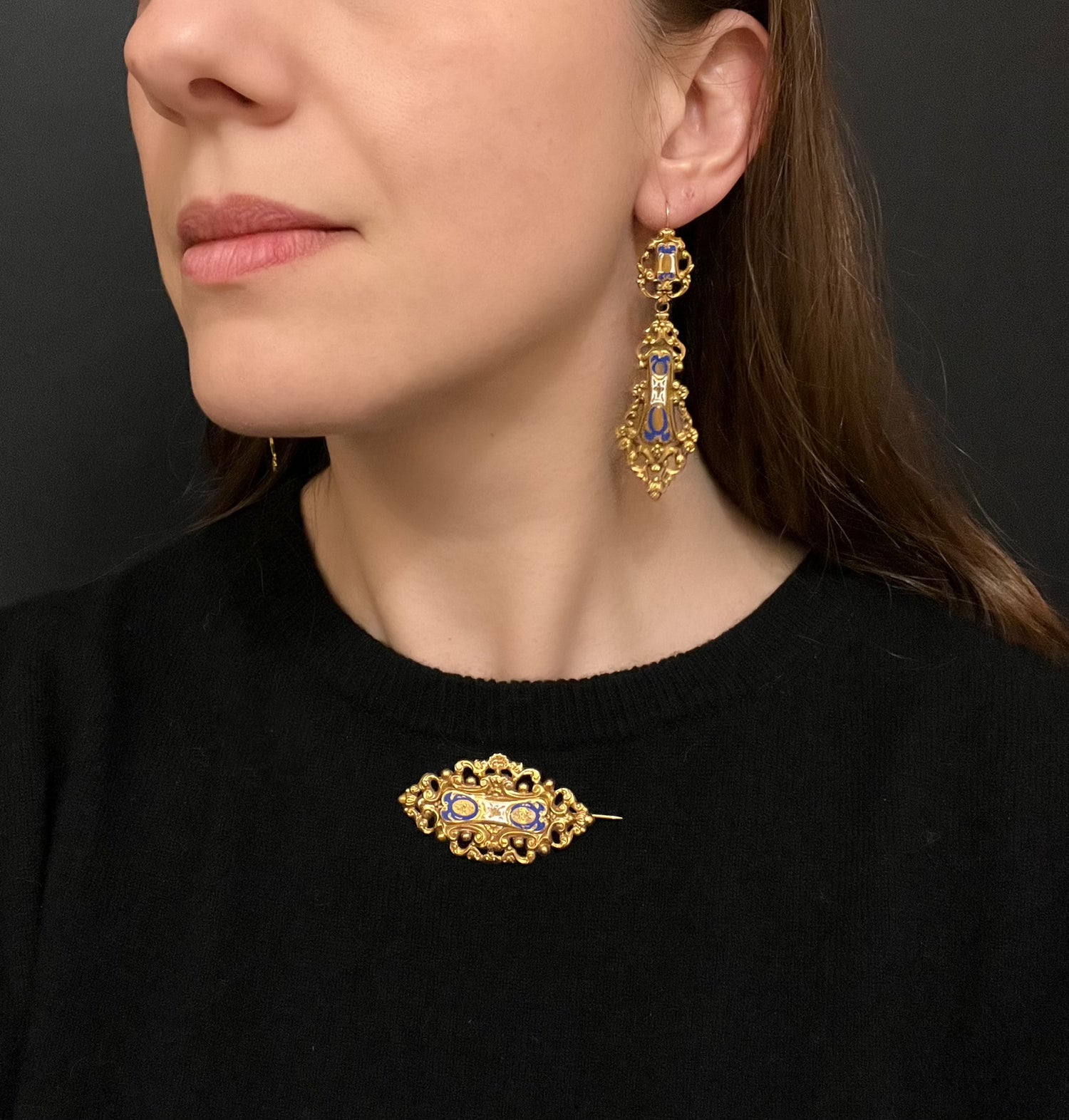 19TH CENTURY FRENCH 18CT GOLD & ENAMEL EARRINGS & BROOCH DEMI PARURE