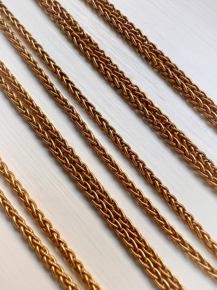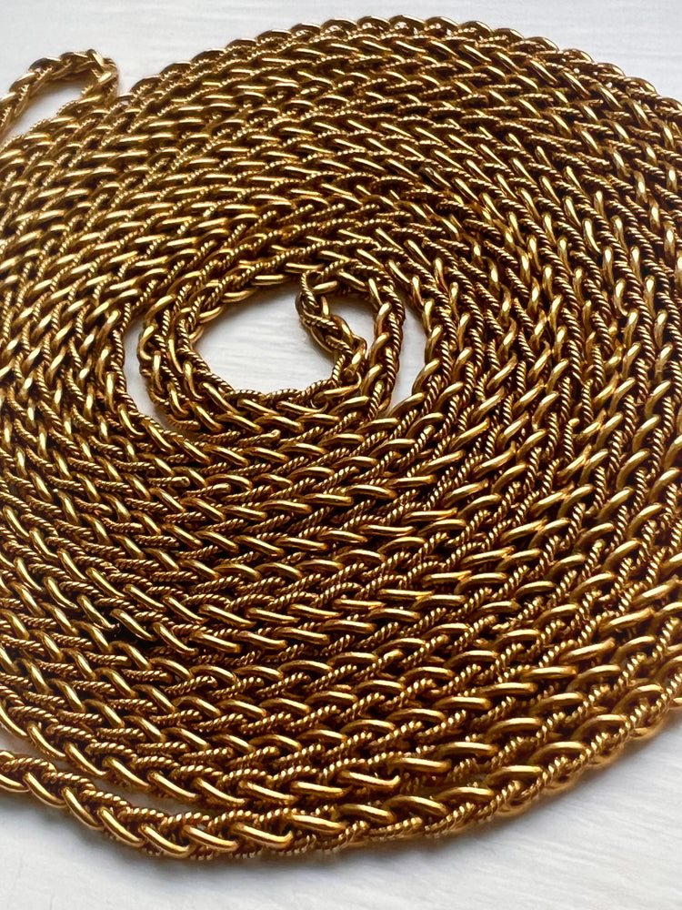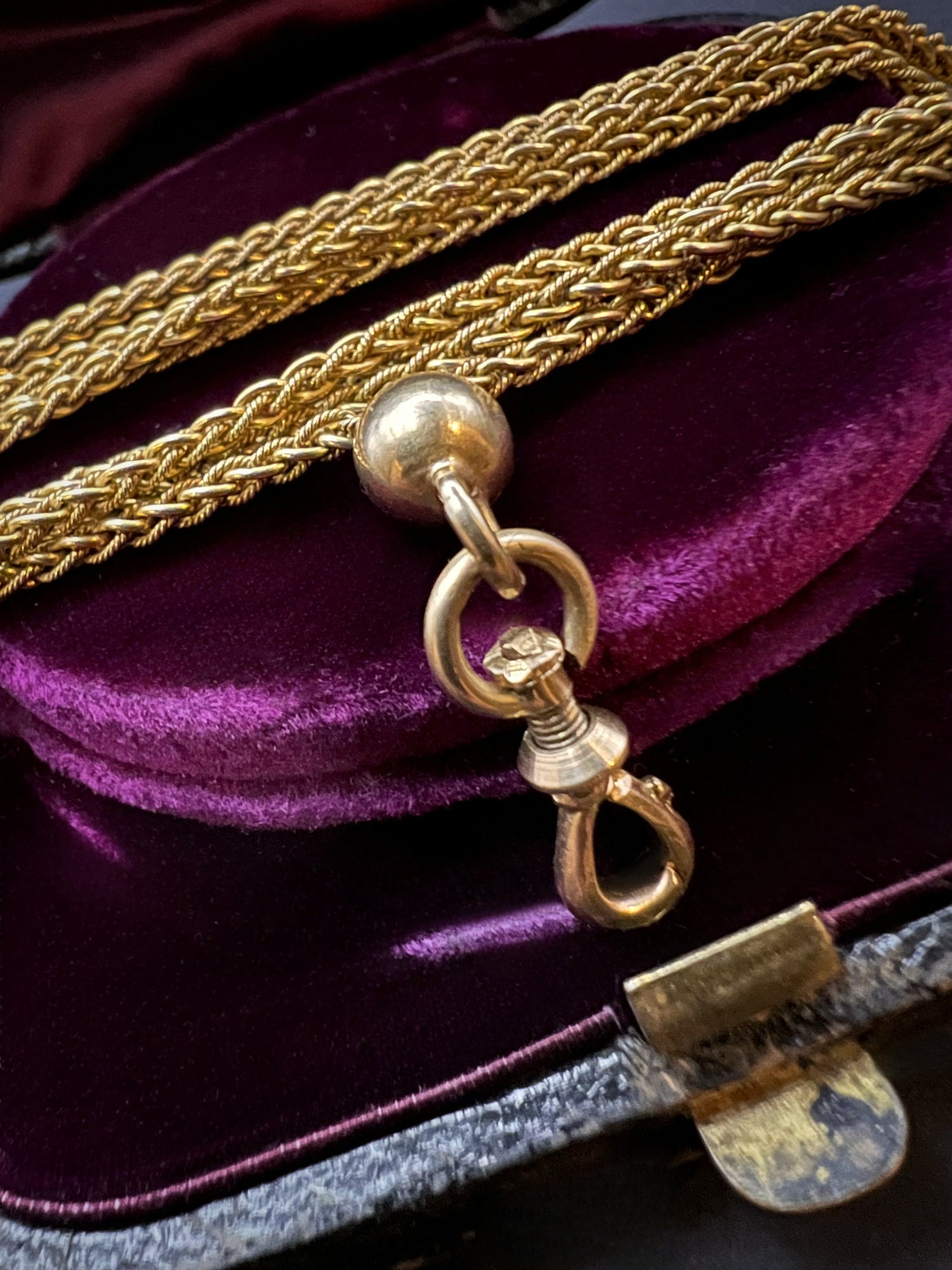 Usually a foxtail link is made of many strands of plain gold plaited / twisted together, but this chain is unique as one of the strands is a rope twist which had been plaited in with the plain strands.