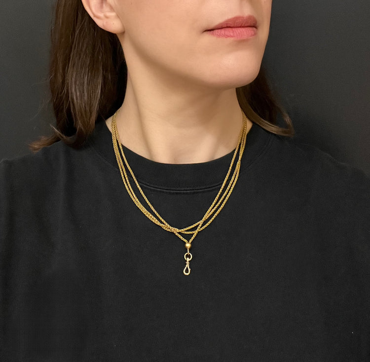 The chain has an 18ct gold sphere finial from which a French dogclip is suspended. This is perfect for adding pendants.
