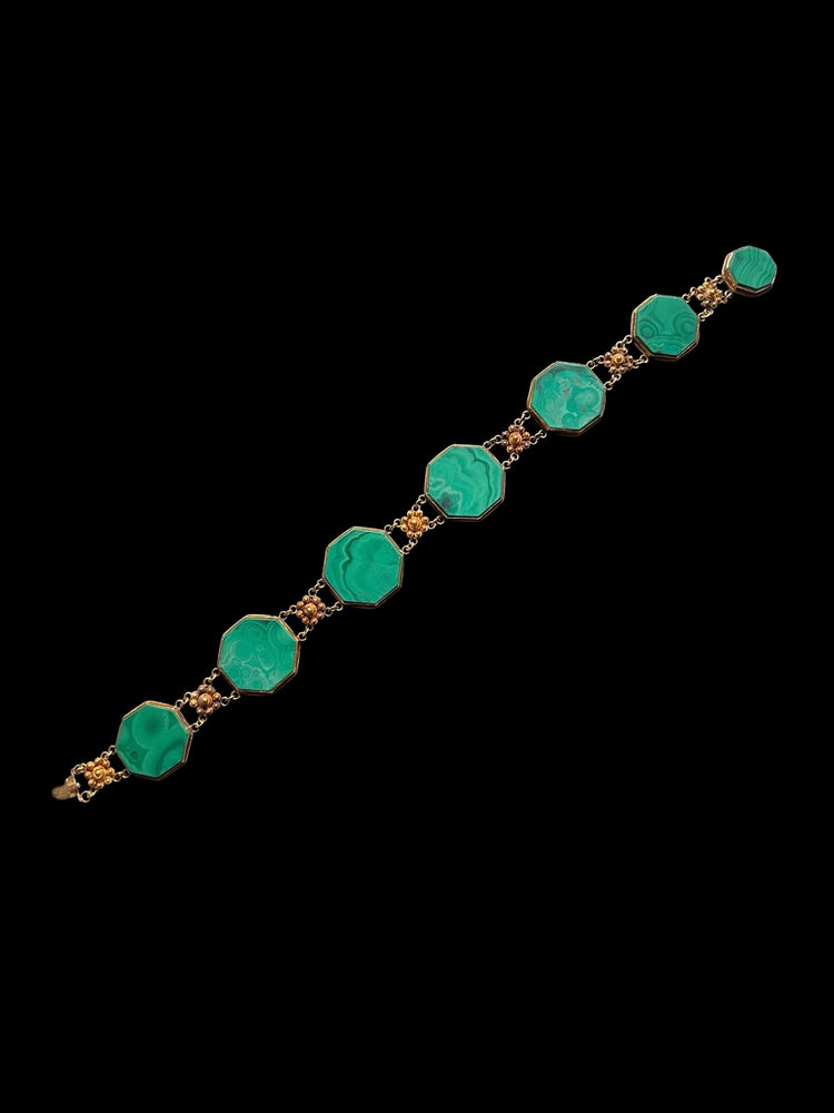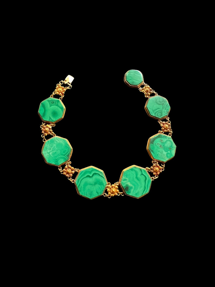 The bracelet closes with a hidden clasp made of a smaller octagonal malachite.