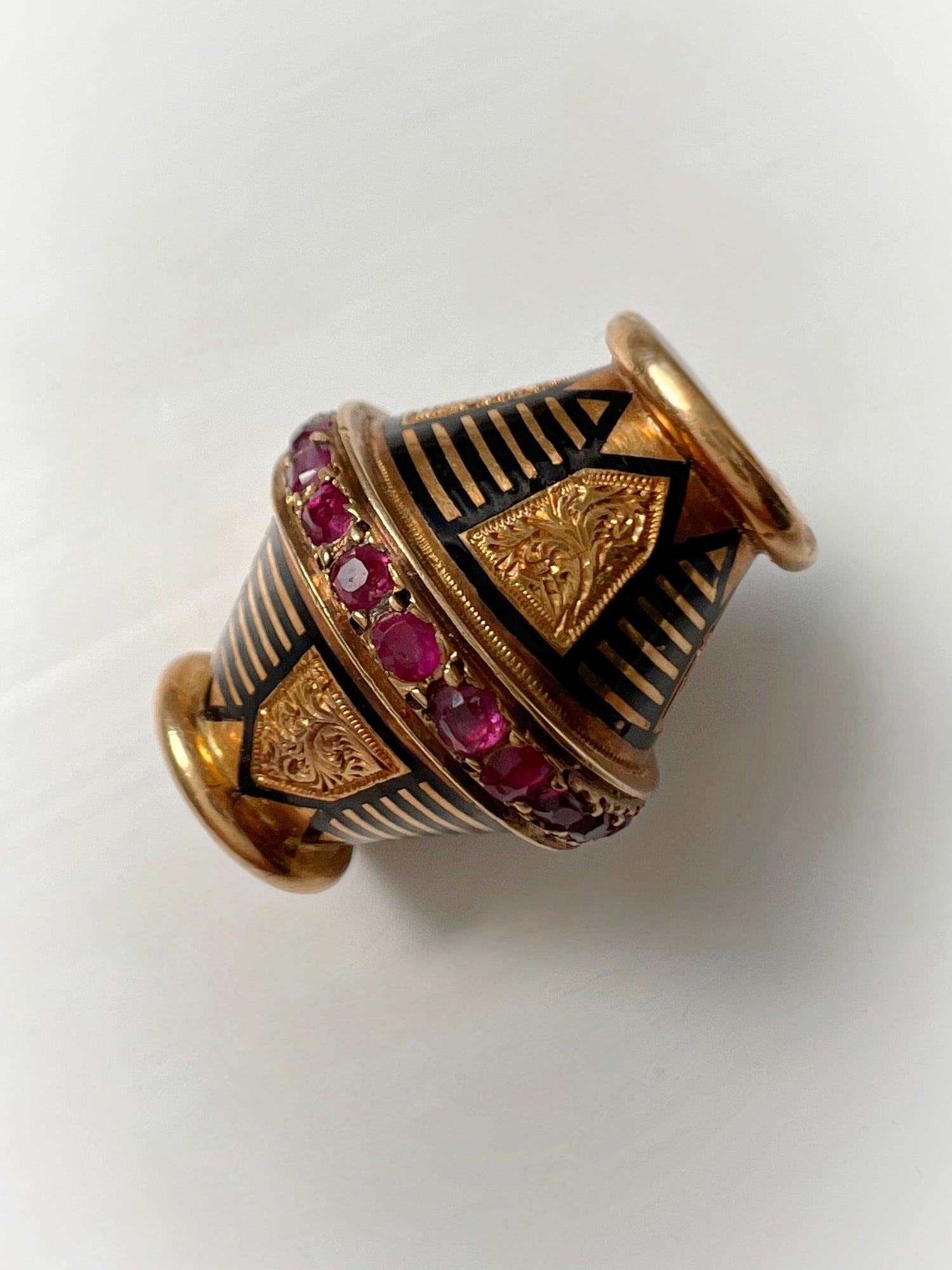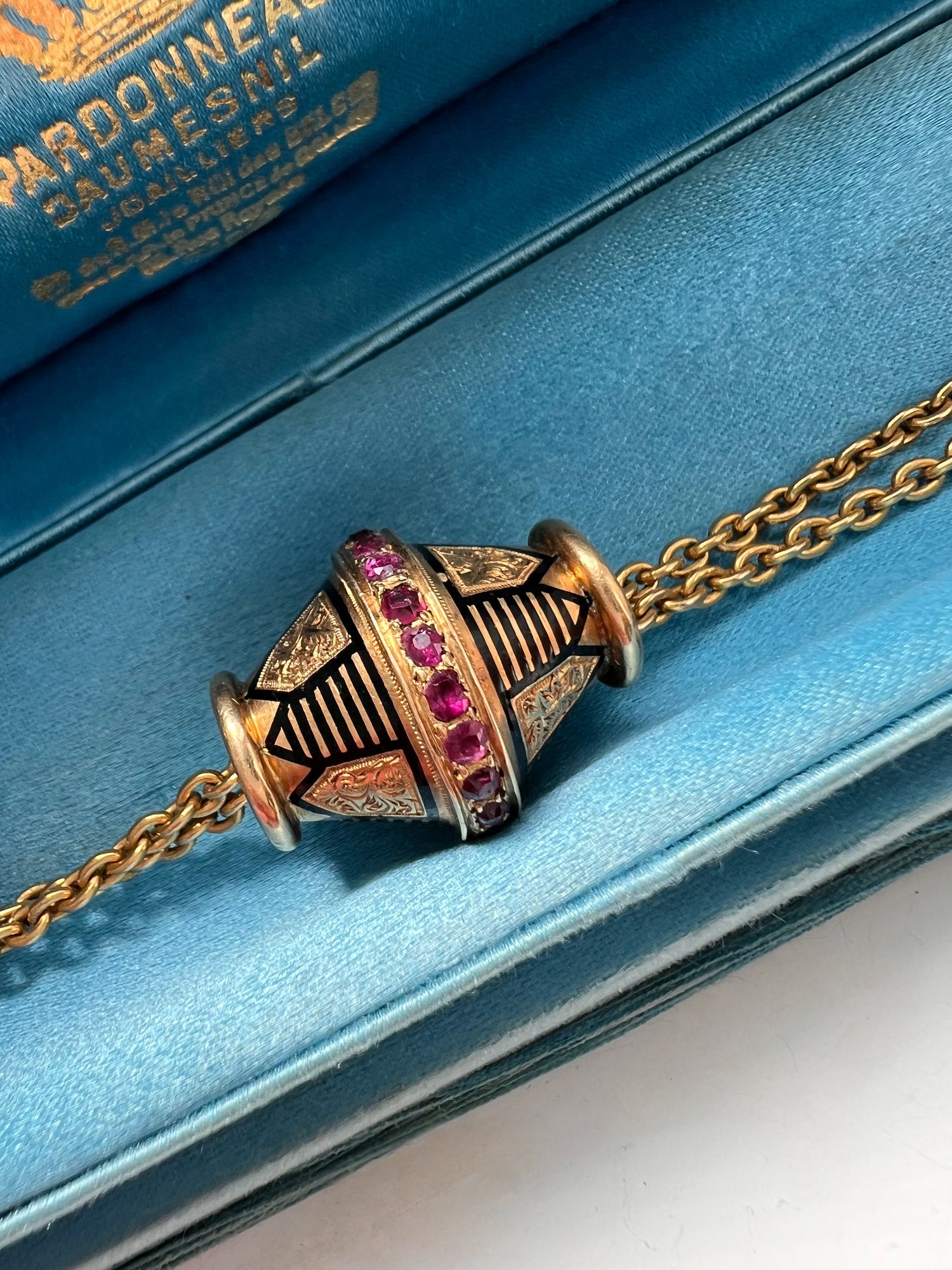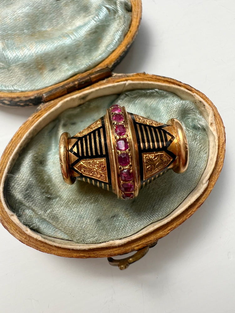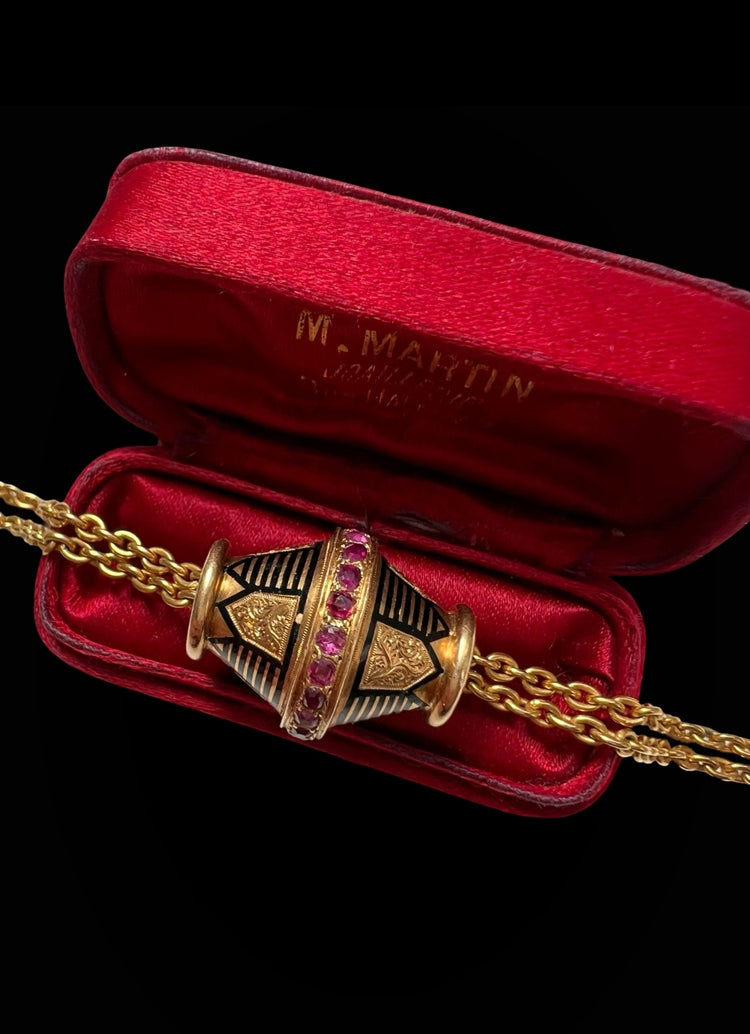 A super cool 19th century ruby and enamel slider pendant.