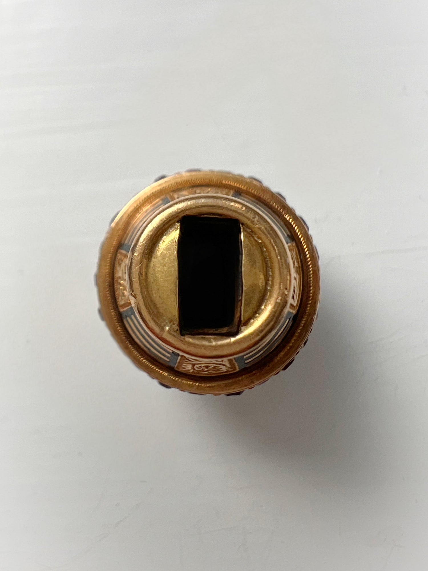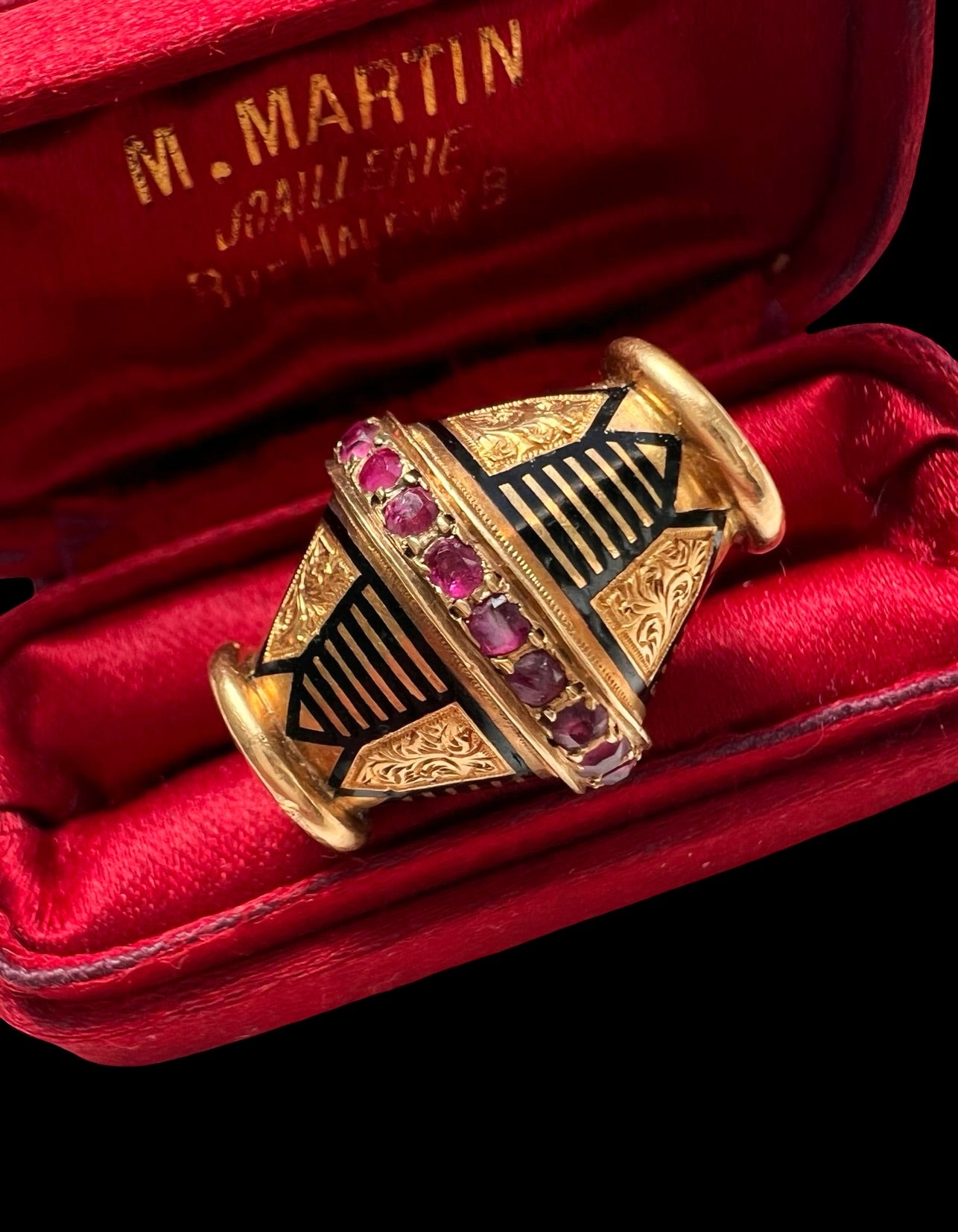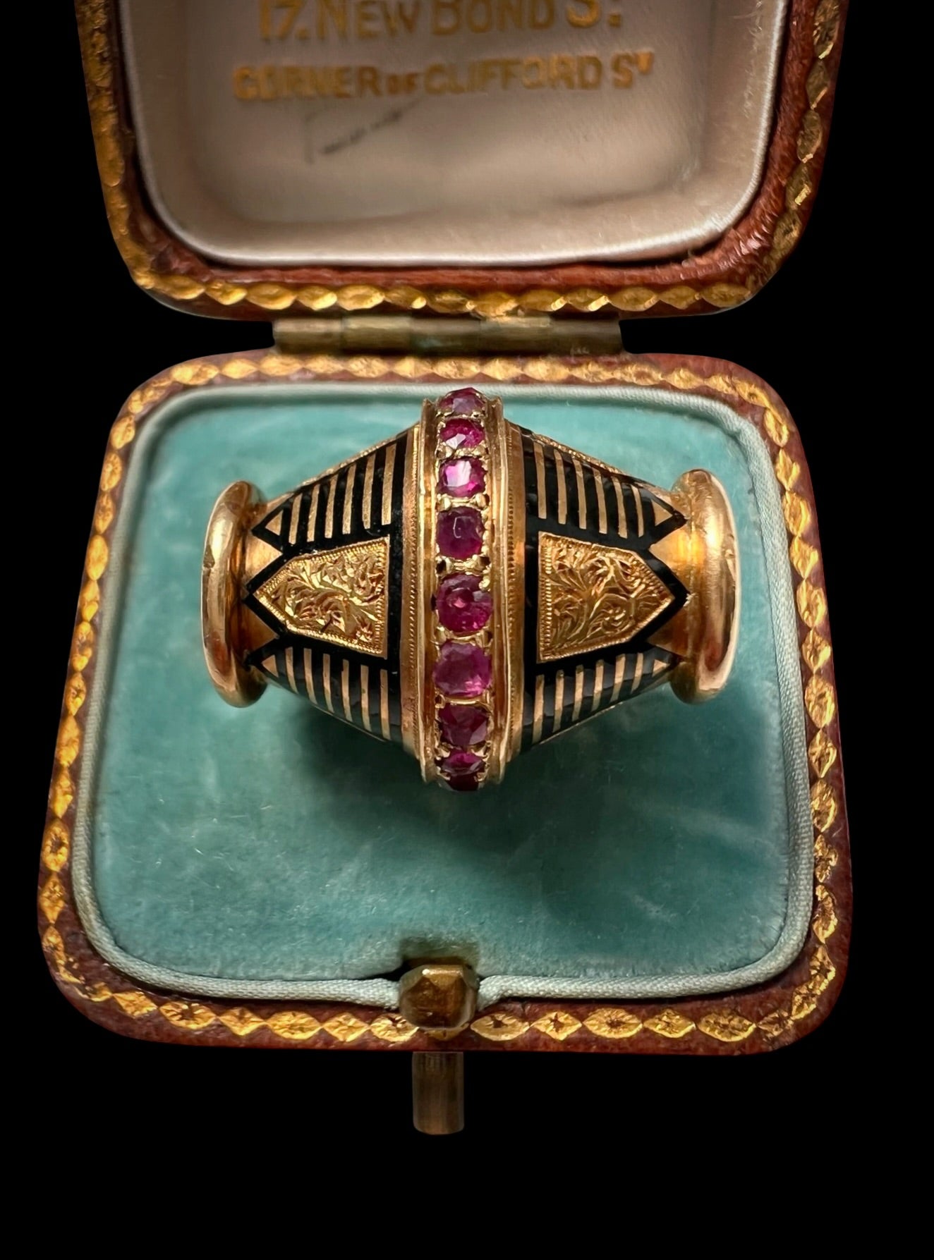 The combination of the bright gold, the pink rubies and the geometric black lines looks so modern, even though it was made over 100 years ago.
