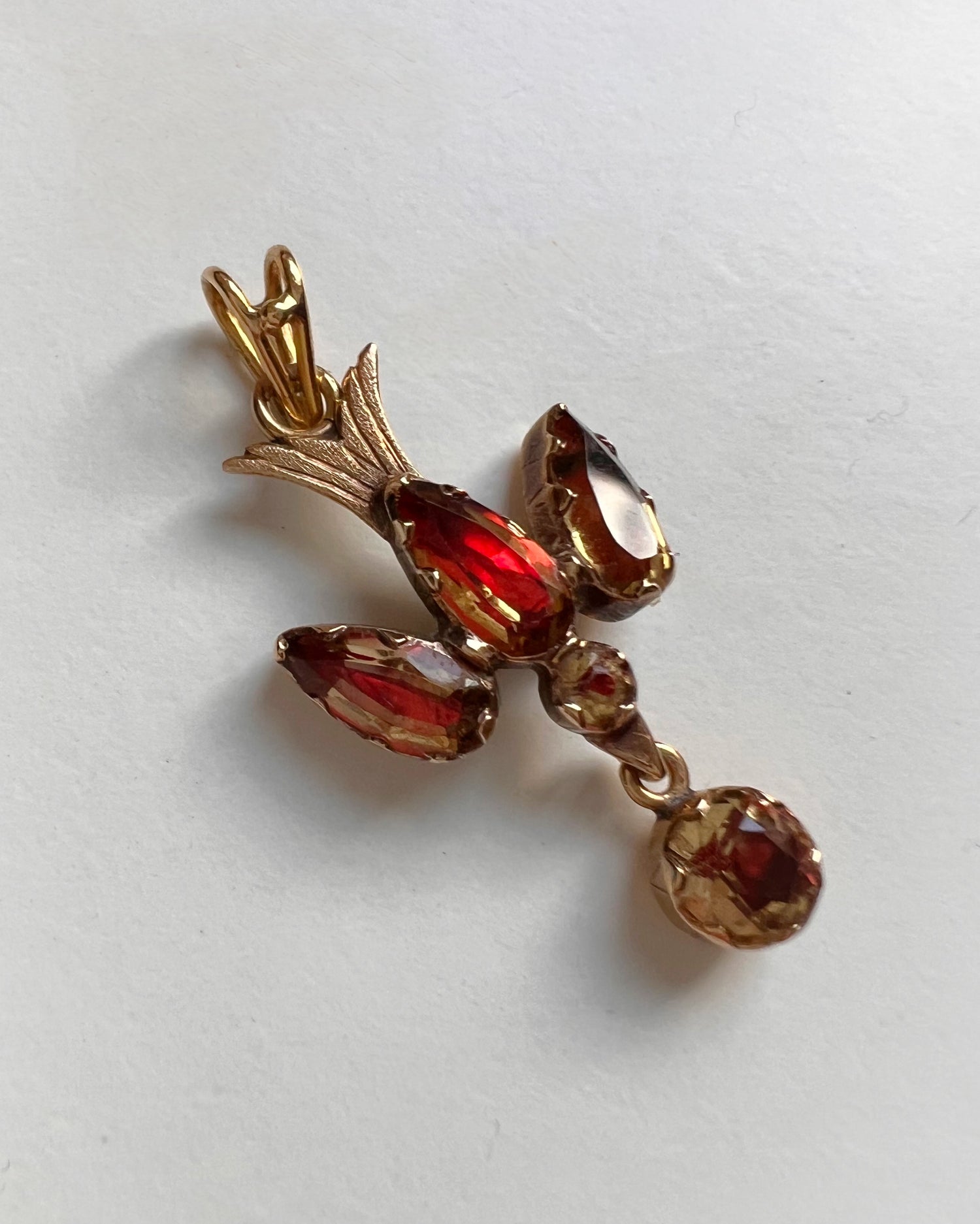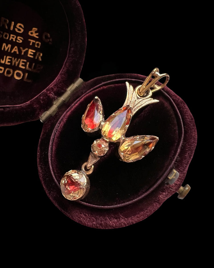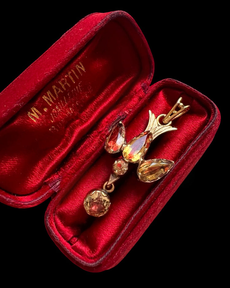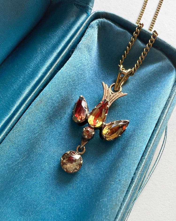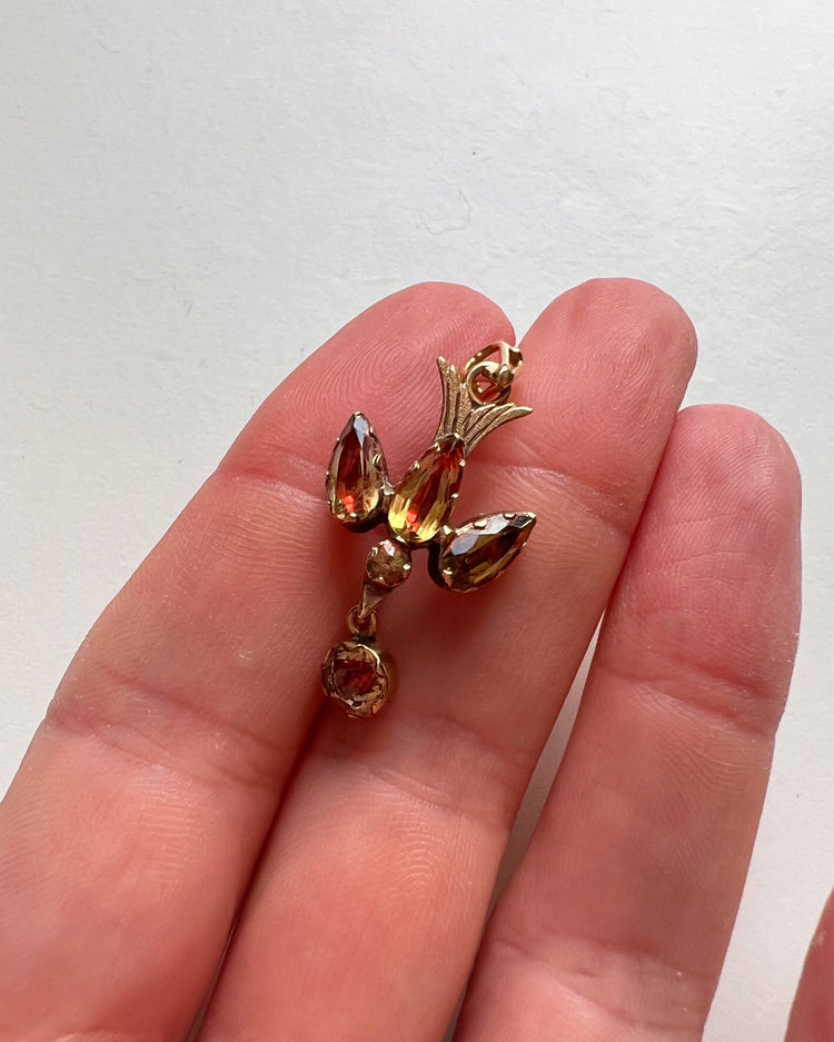 The dove is made of foiled citrine stones, giving the natural yellow stones flashes of pinky / red when the light hits.