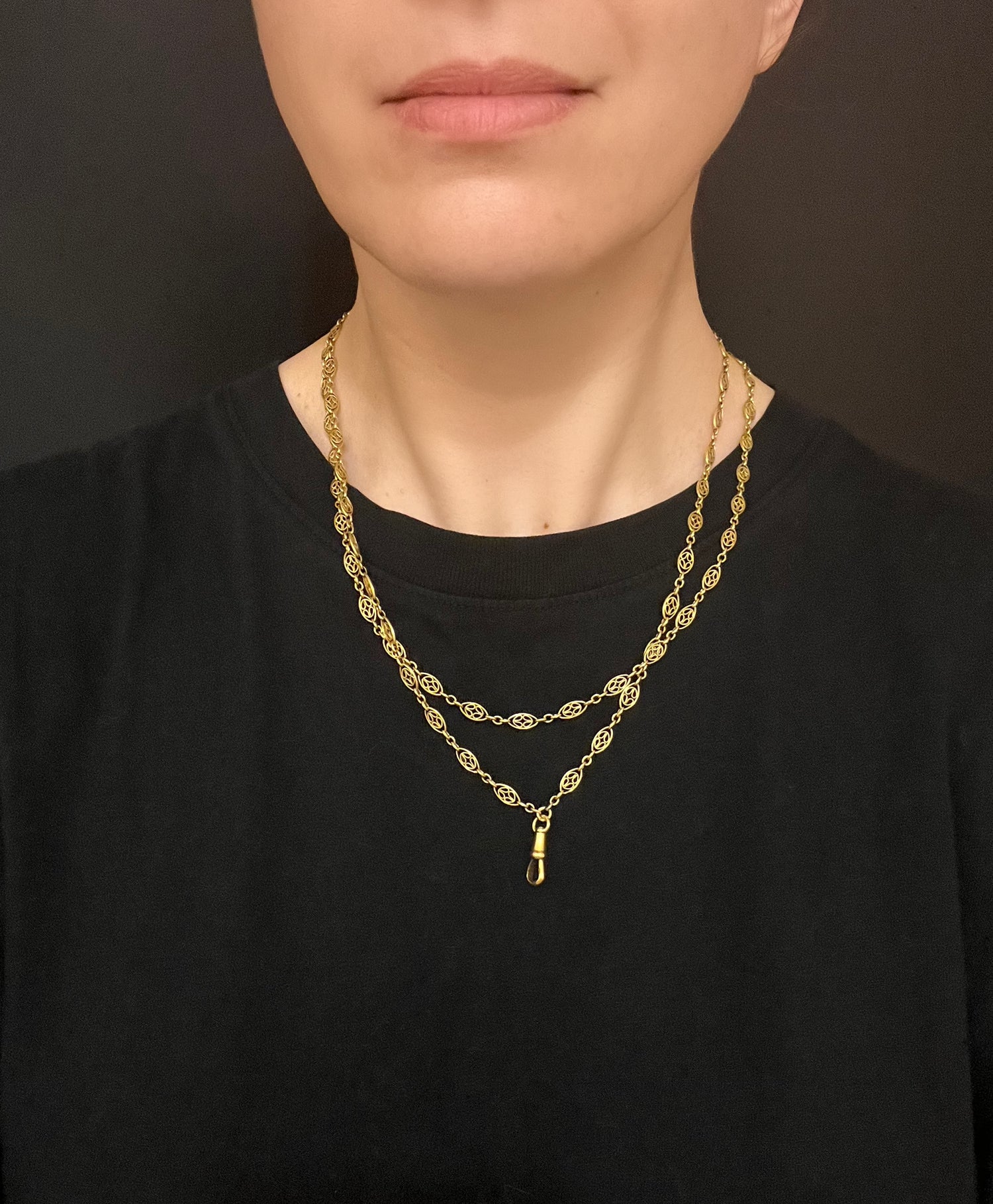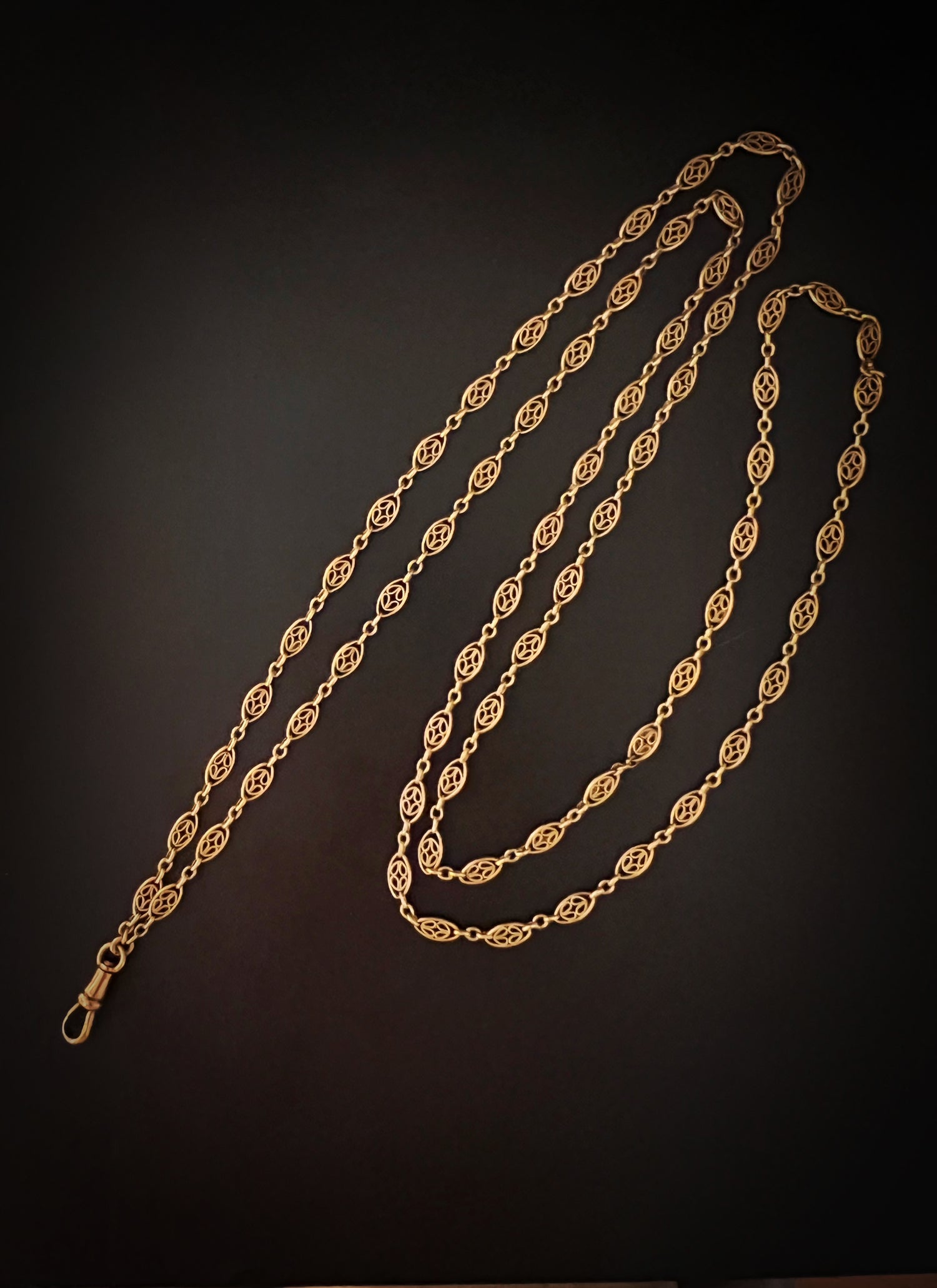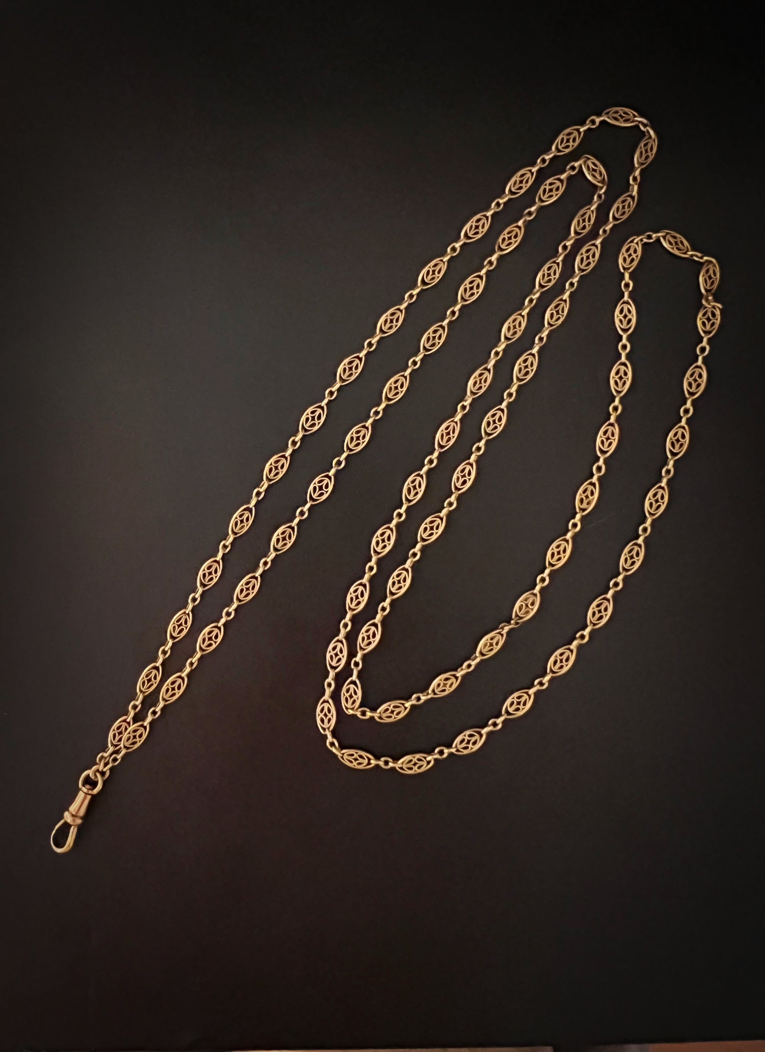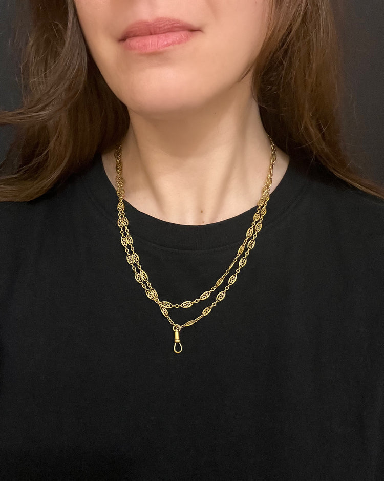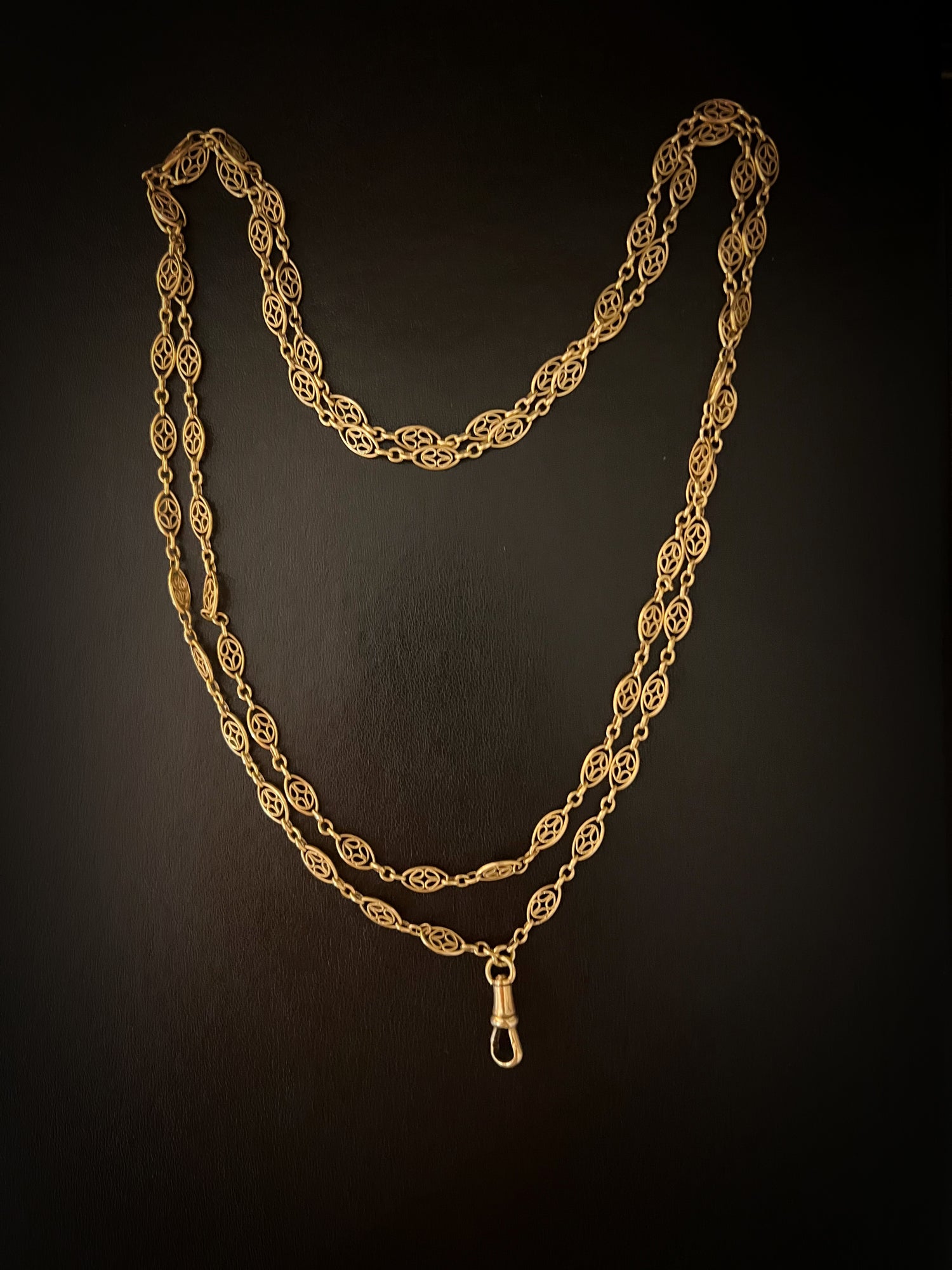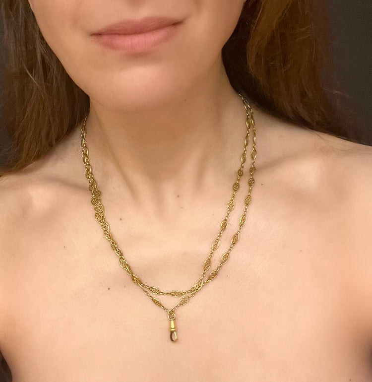 Circa 1890, the chain can be worn once or twice around the neck for different looks, and pendants can be added to the dog clip for more versatility.
