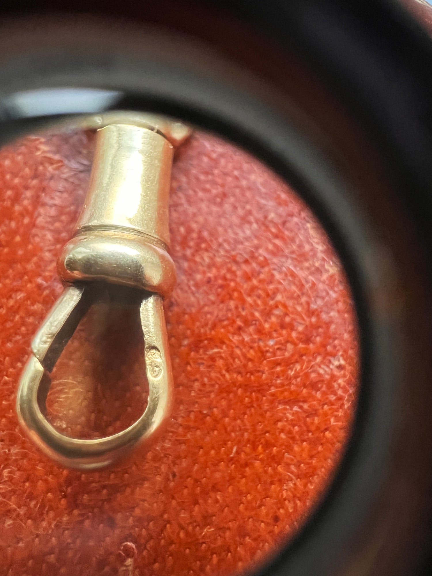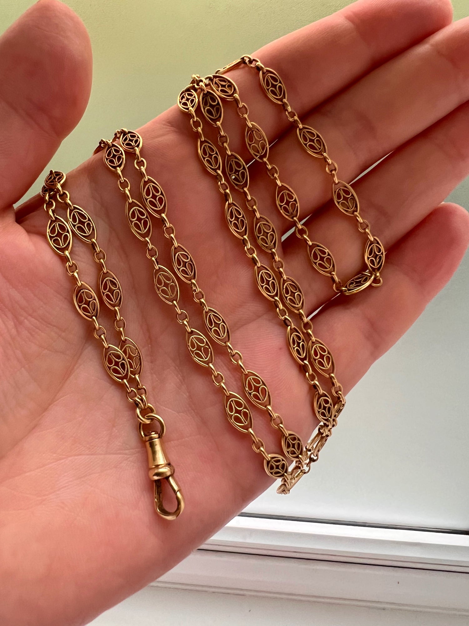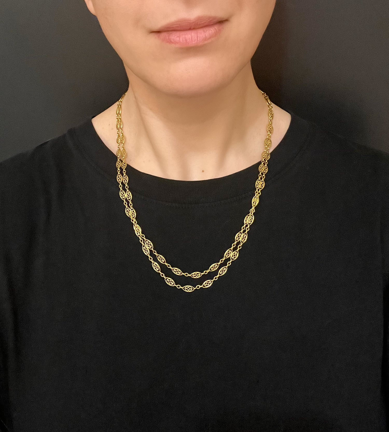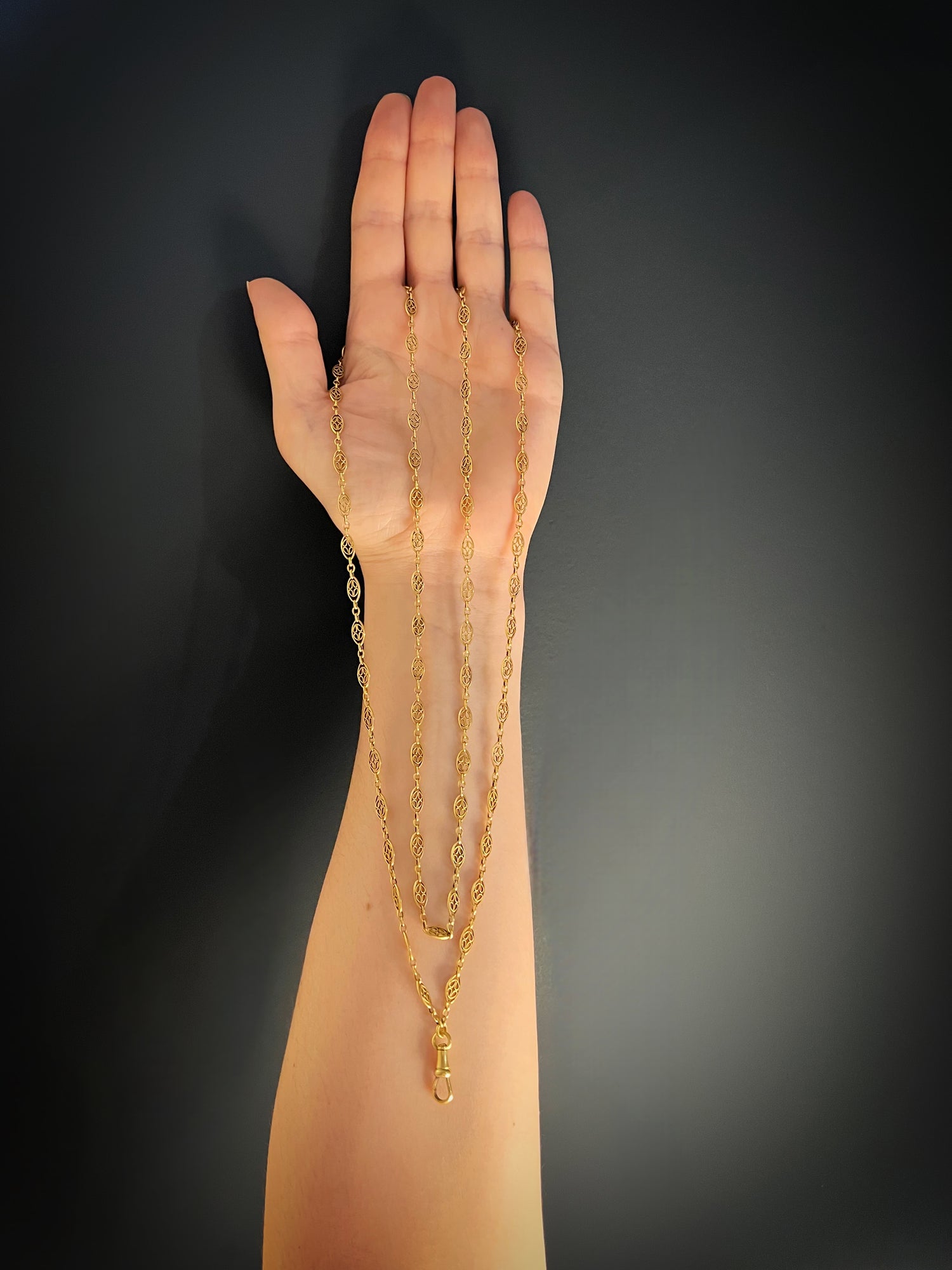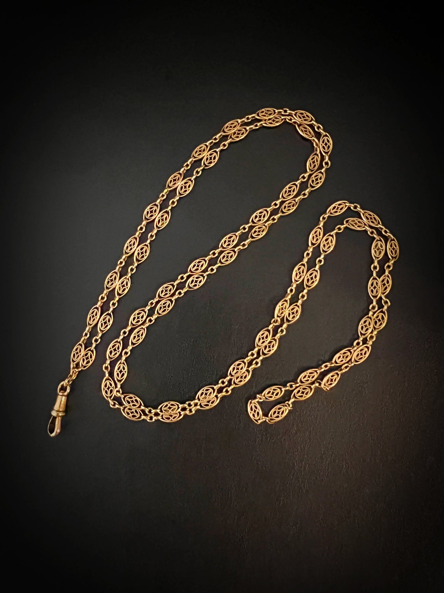 Circa 1890, the chain can be worn once or twice around the neck for different looks, and pendants can be added to the dog clip for more versatility.