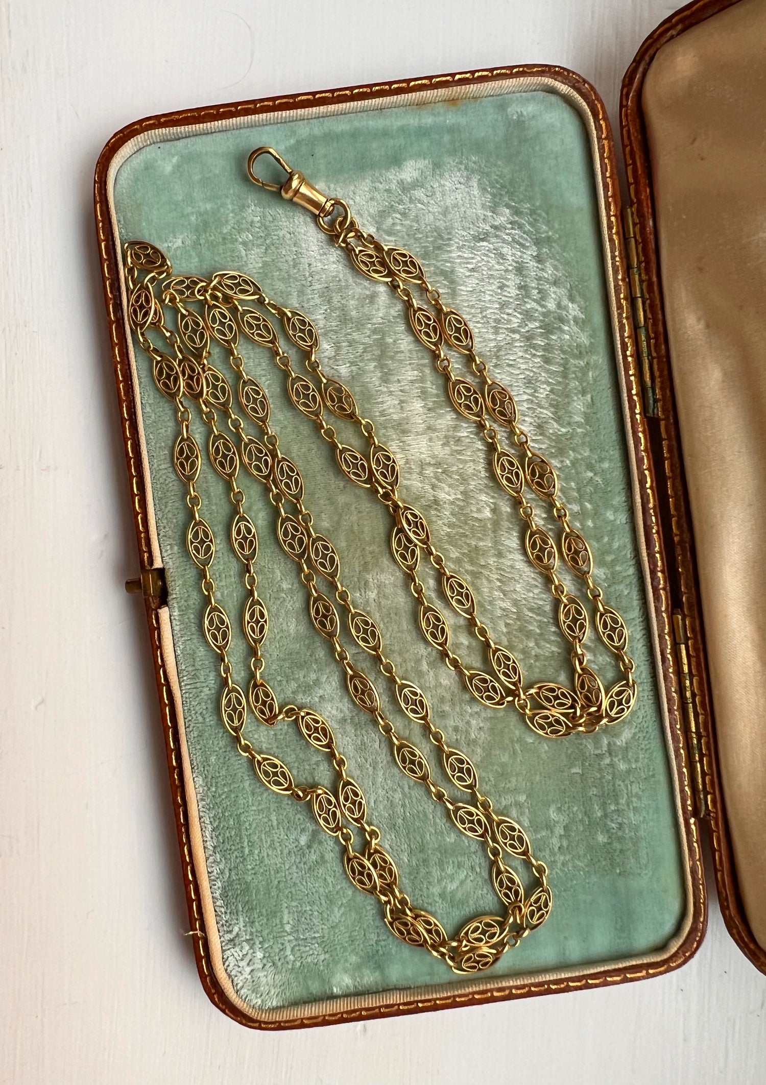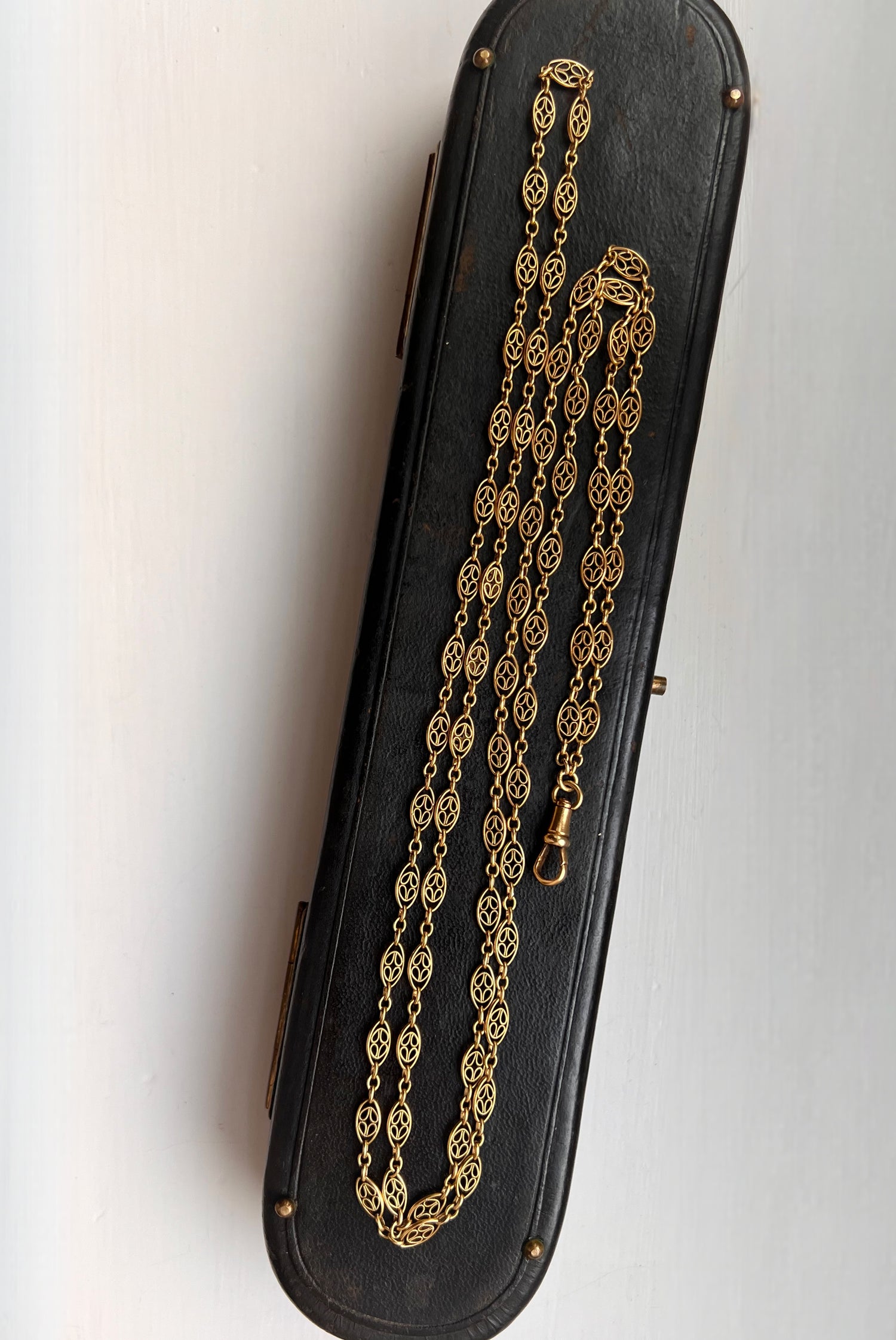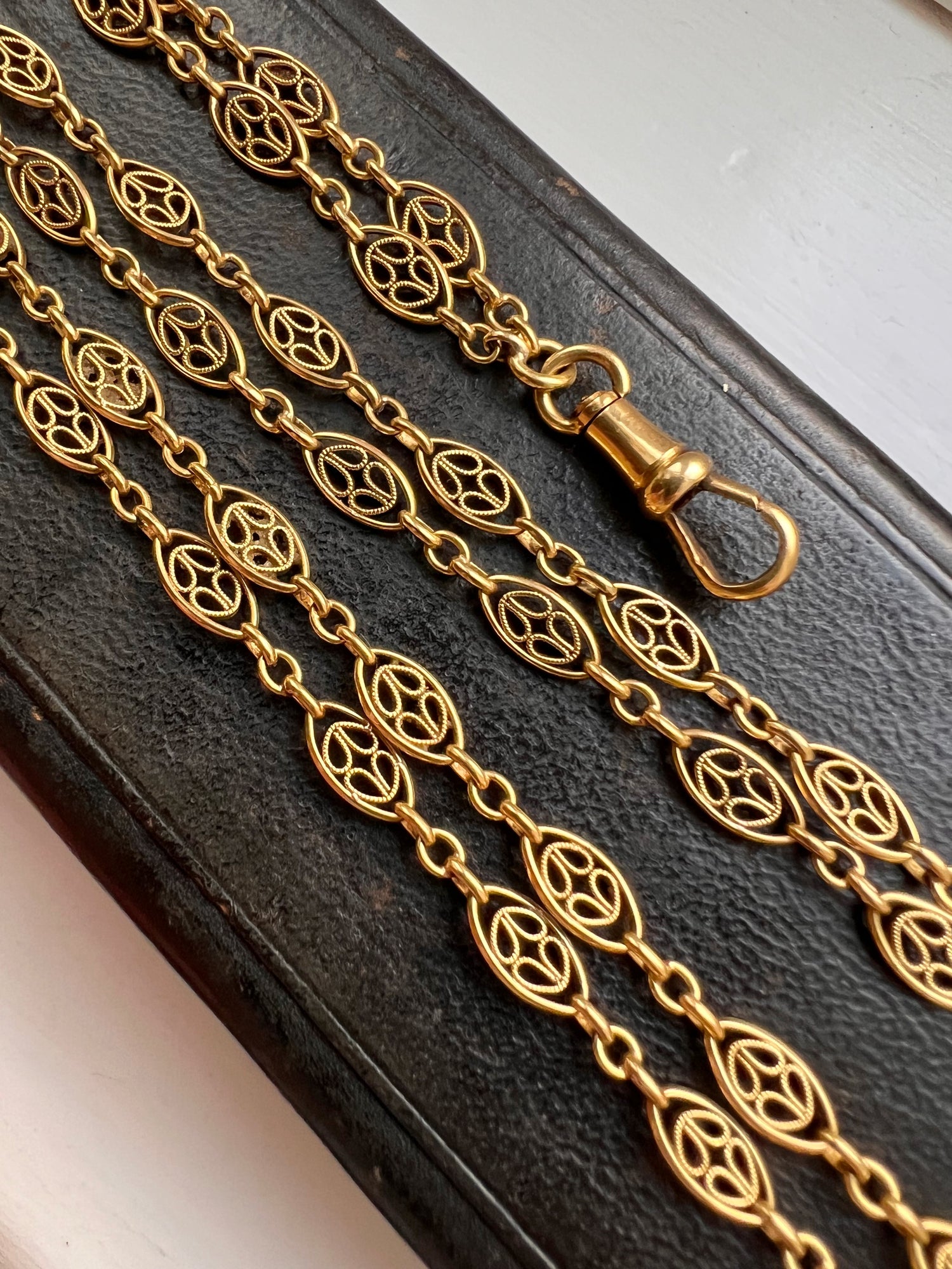 A French 18ct fancy filigree sautoir chain with an 18ct suspended dog clip.