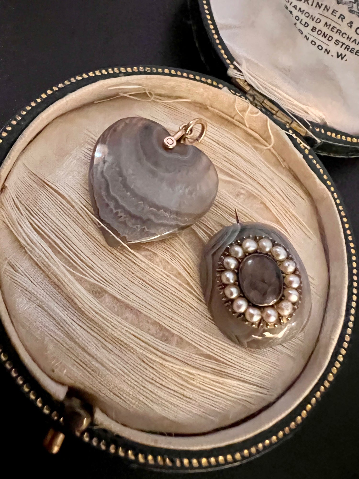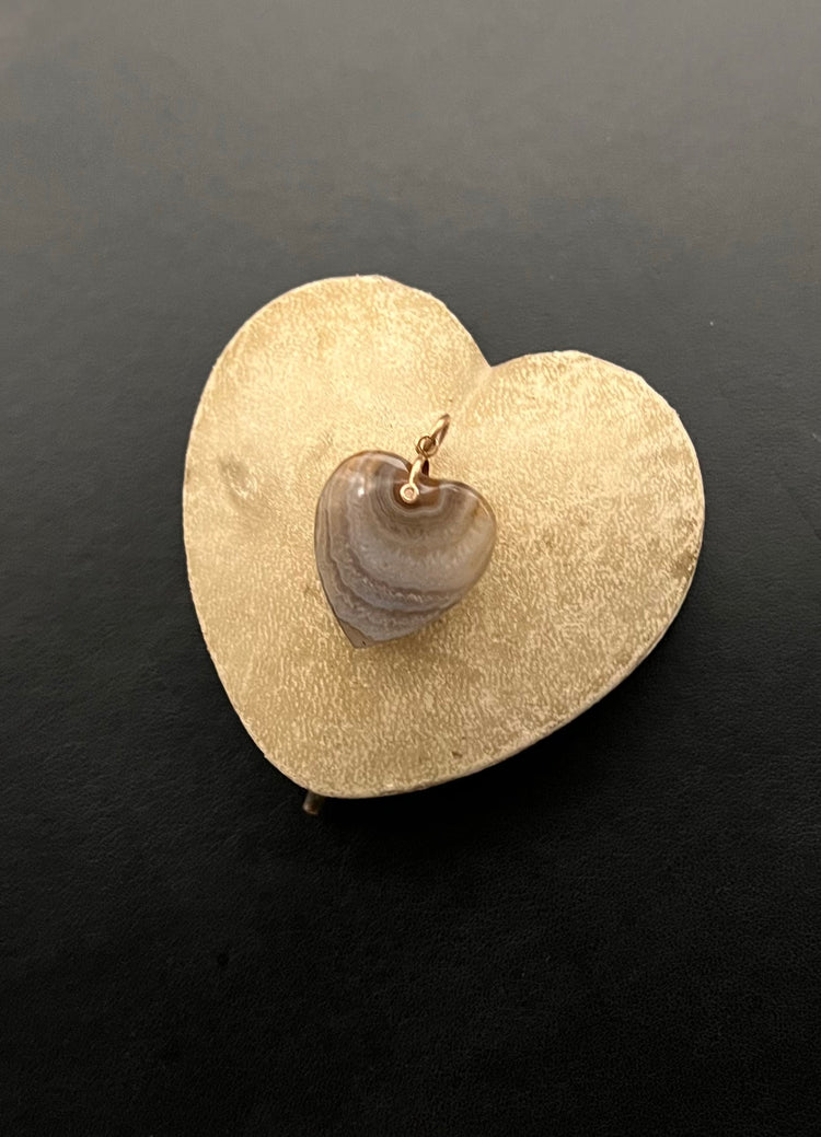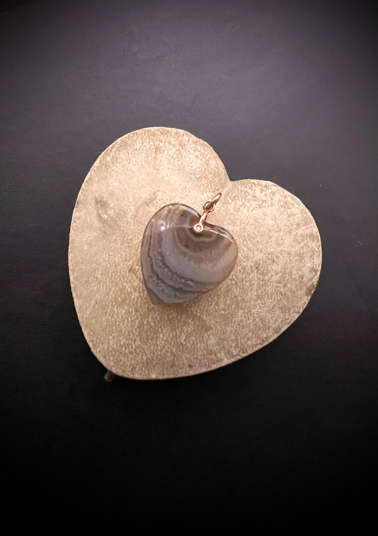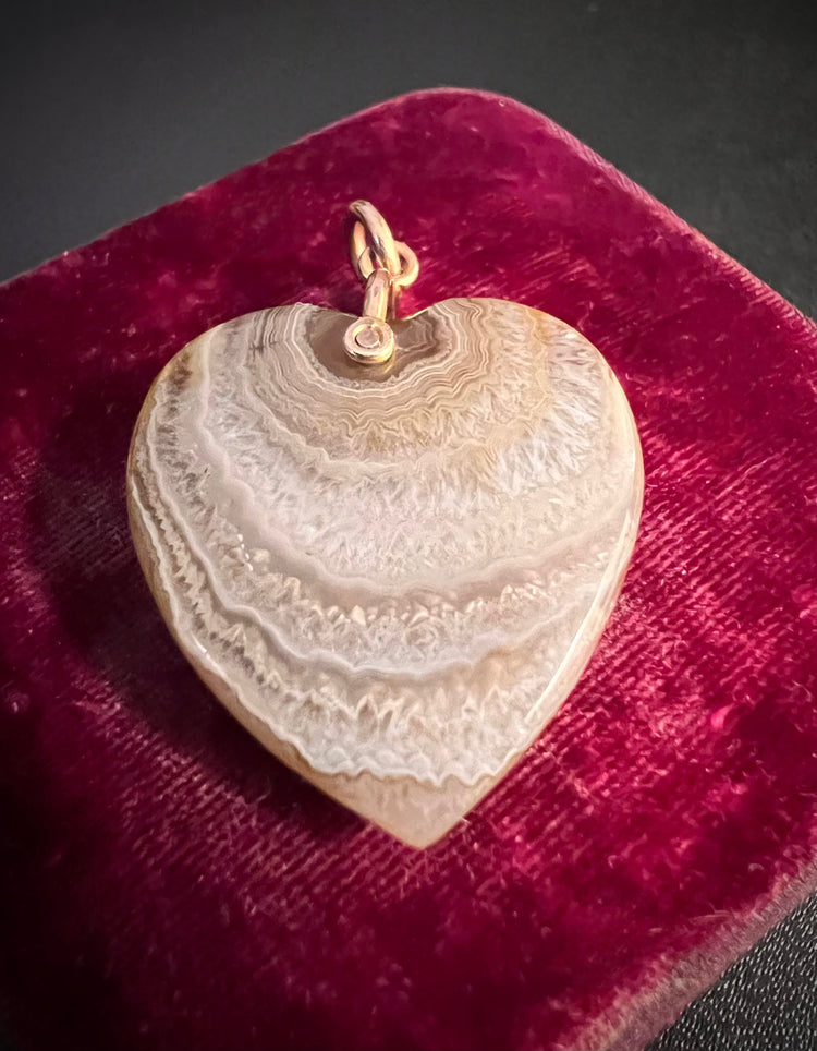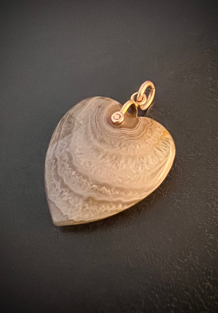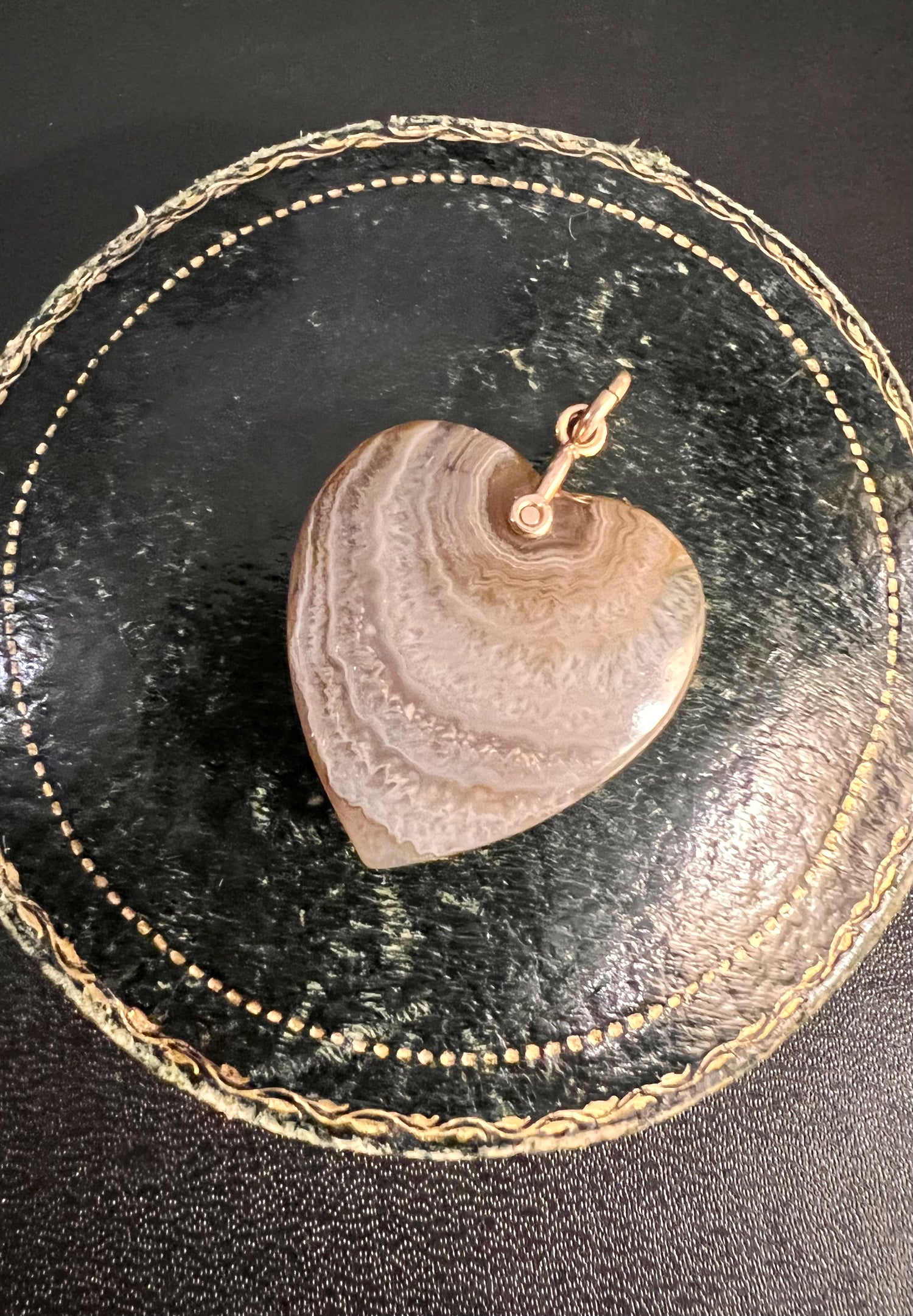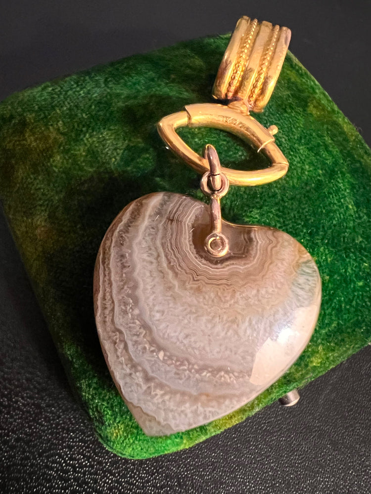 This is a gorgeous late Georgian, grey banded agate heart with a gold fitting and bail.