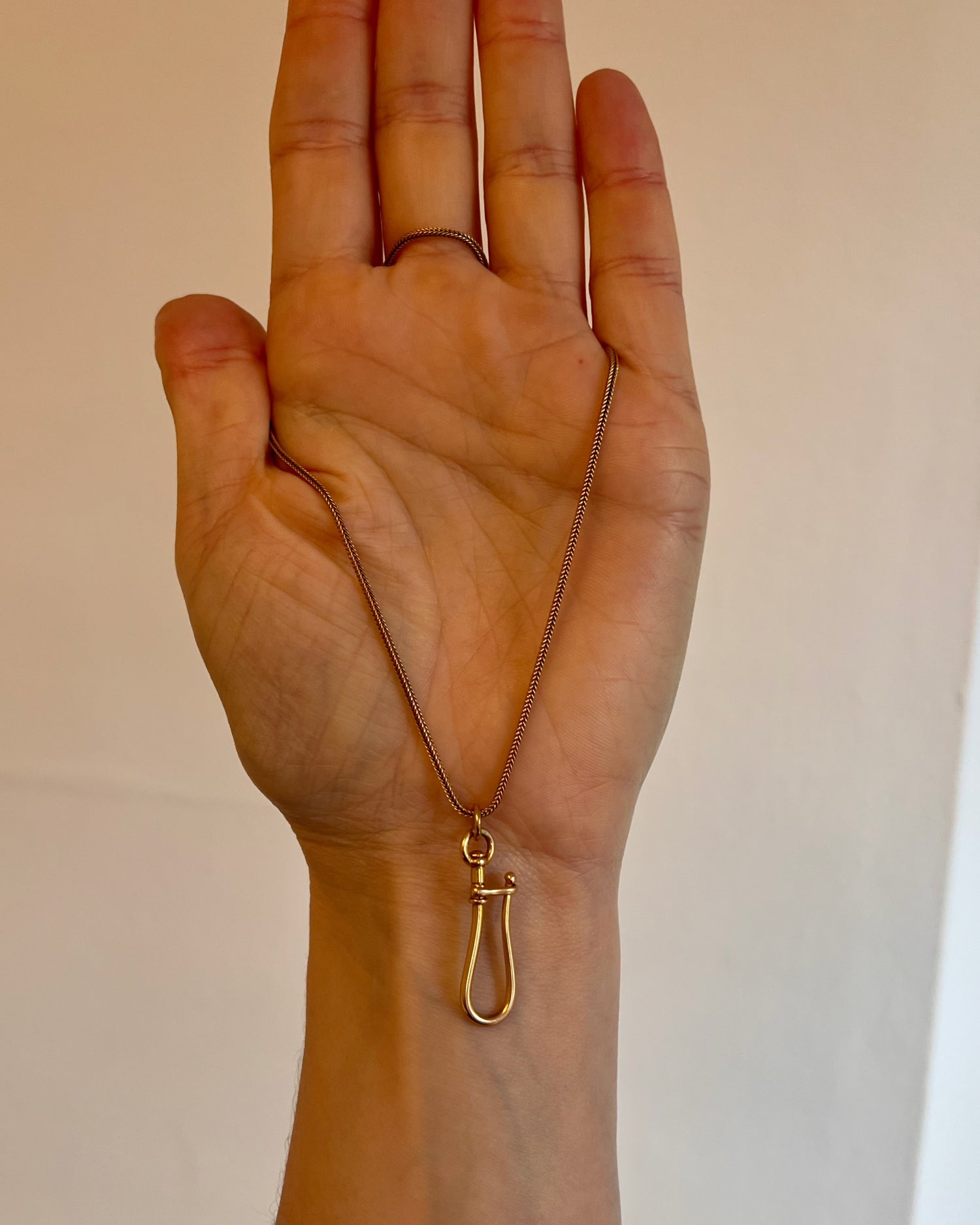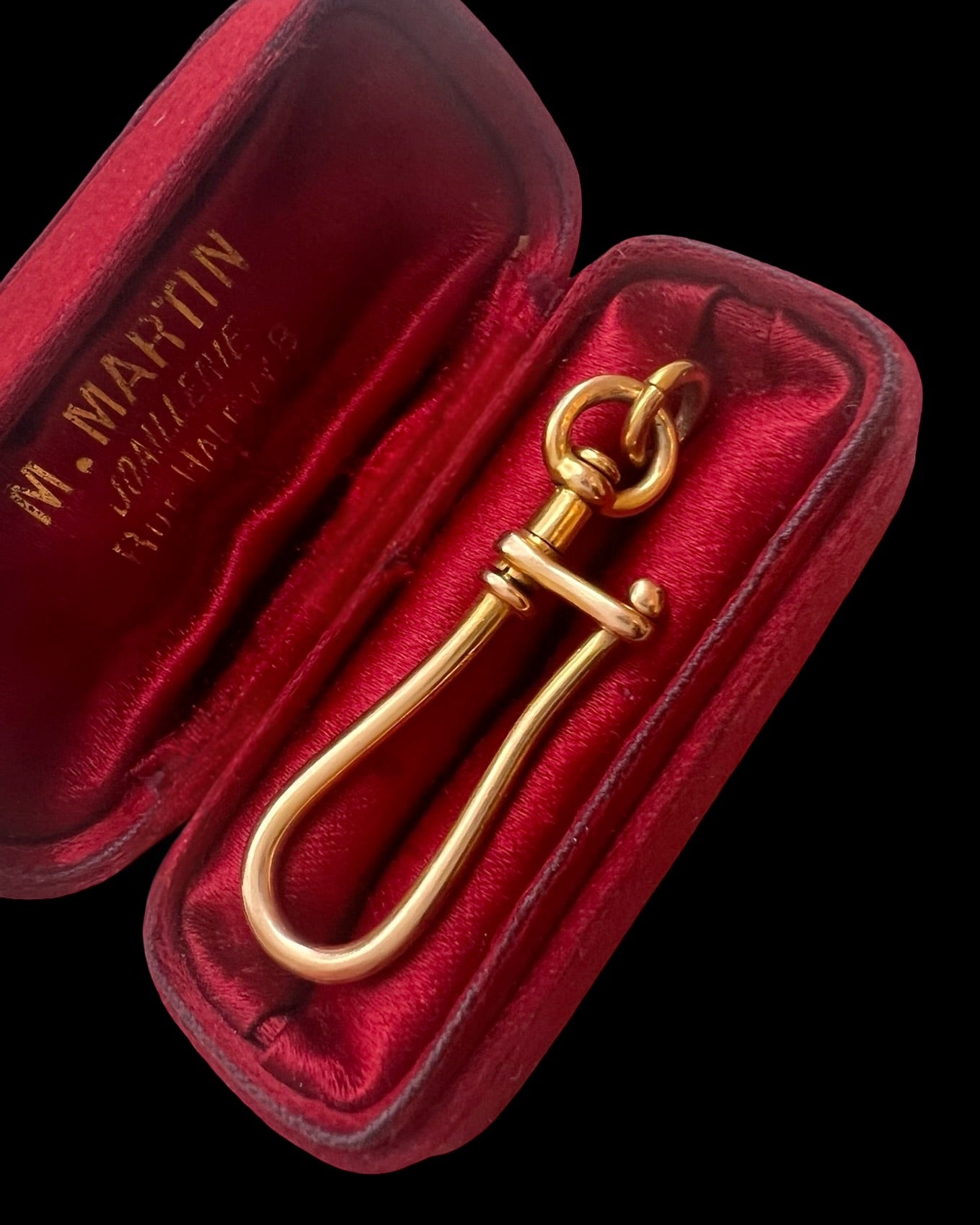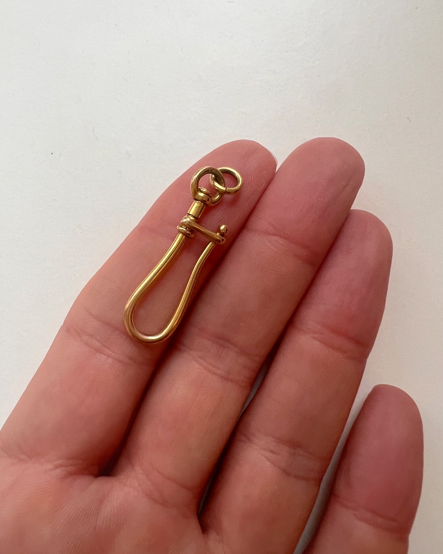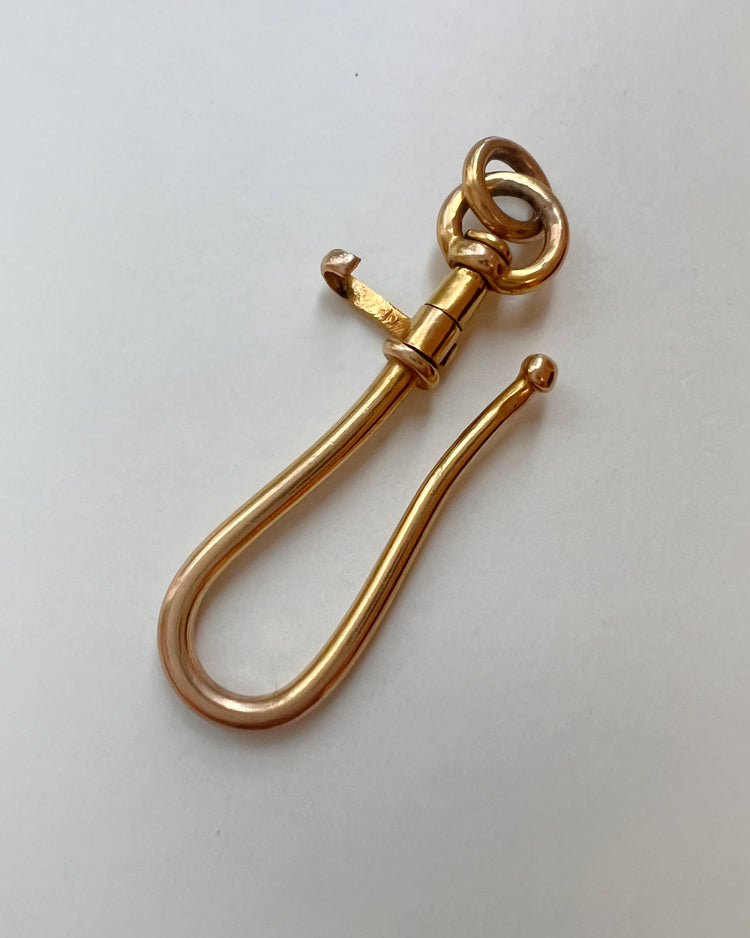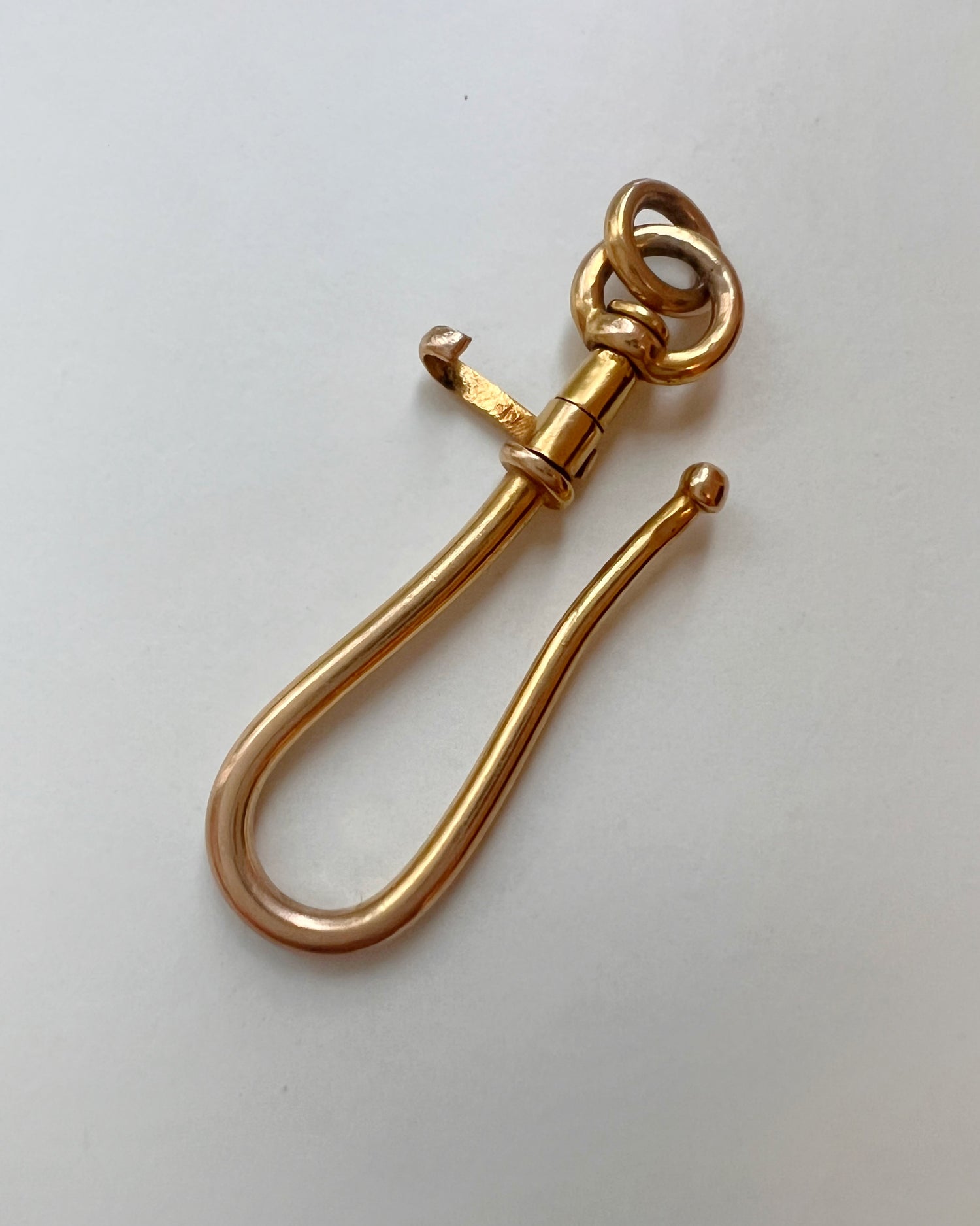 Made of 15ct solid gold, the hook has a lovely rich patina. The hook has a swivel catch that clips over the hook, ensuring any pendant or chain attached is completely secure.