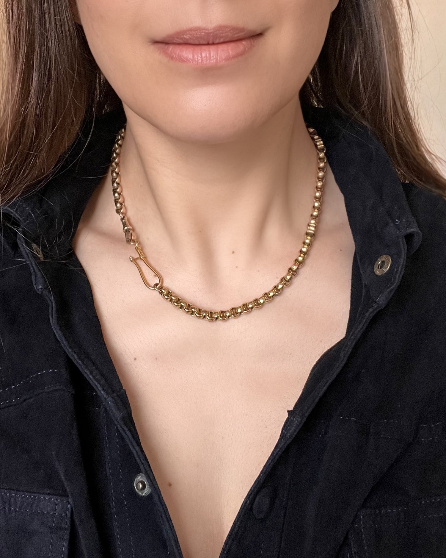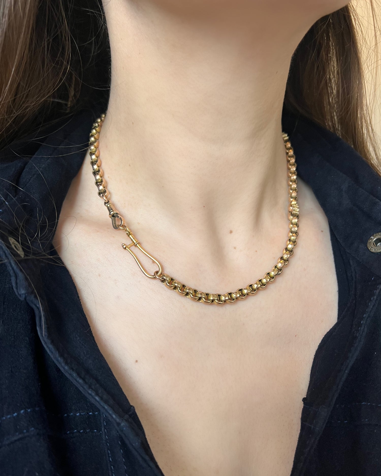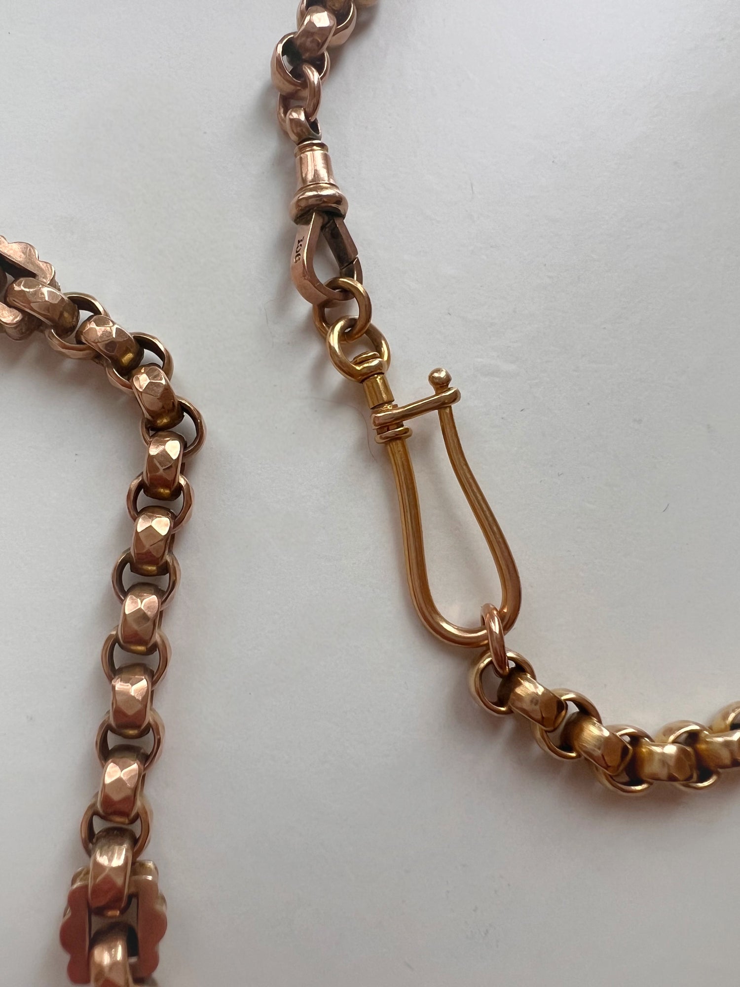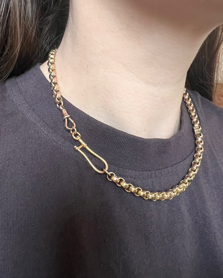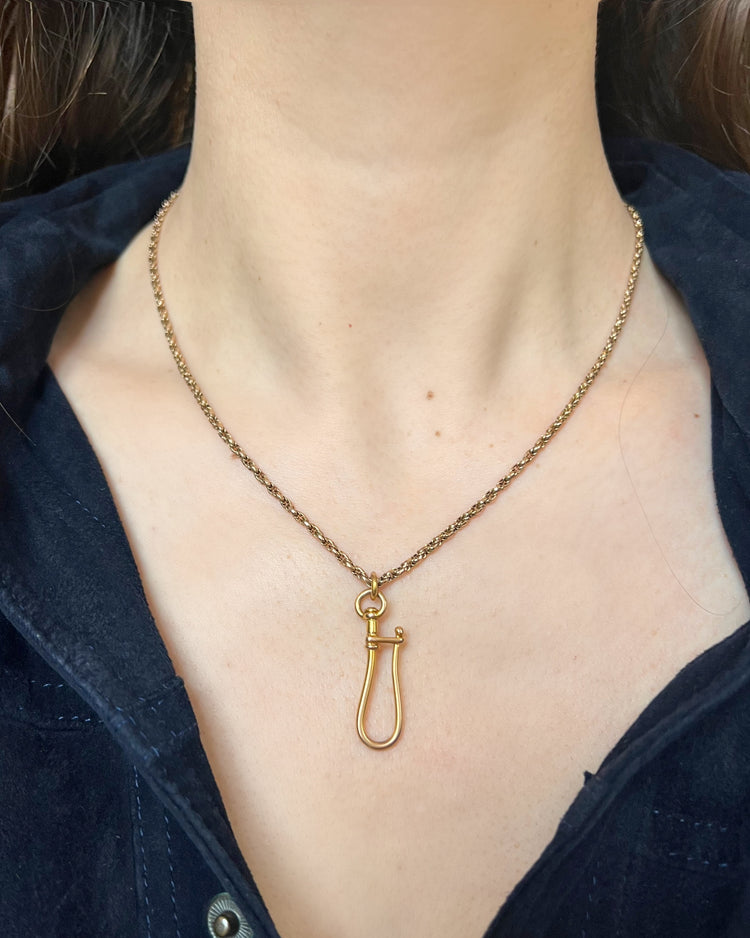 Made of 15ct solid gold, the hook has a lovely rich patina. The hook has a swivel catch that clips over the hook, ensuring any pendant or chain attached is completely secure.