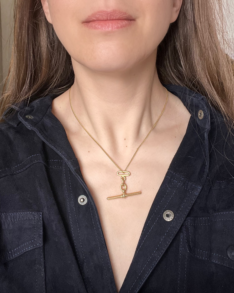 This t-bar would look great added to an Albert chain to extend the length, and can also be used on a finer chain, using the elongated link as a bail.