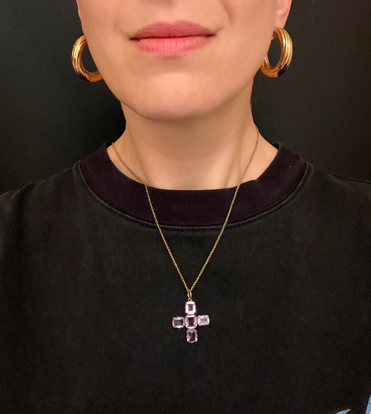 The lilac stones have been cut in chunky rectangles and set in a simple open back gold setting, allowing the beauty of the stones to take centre stage.