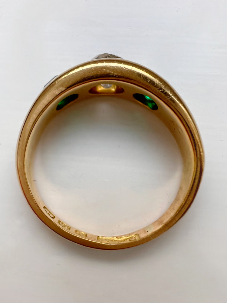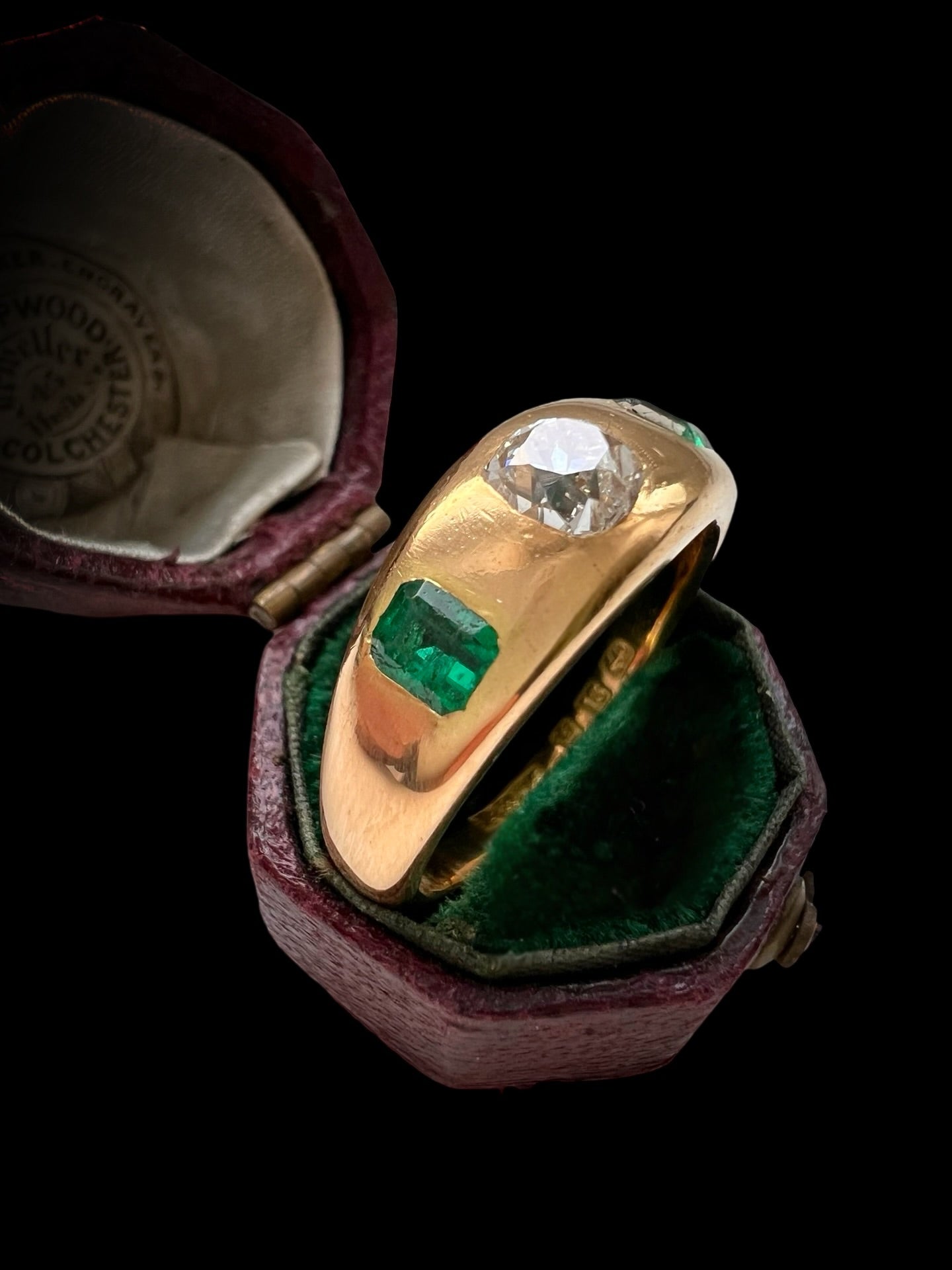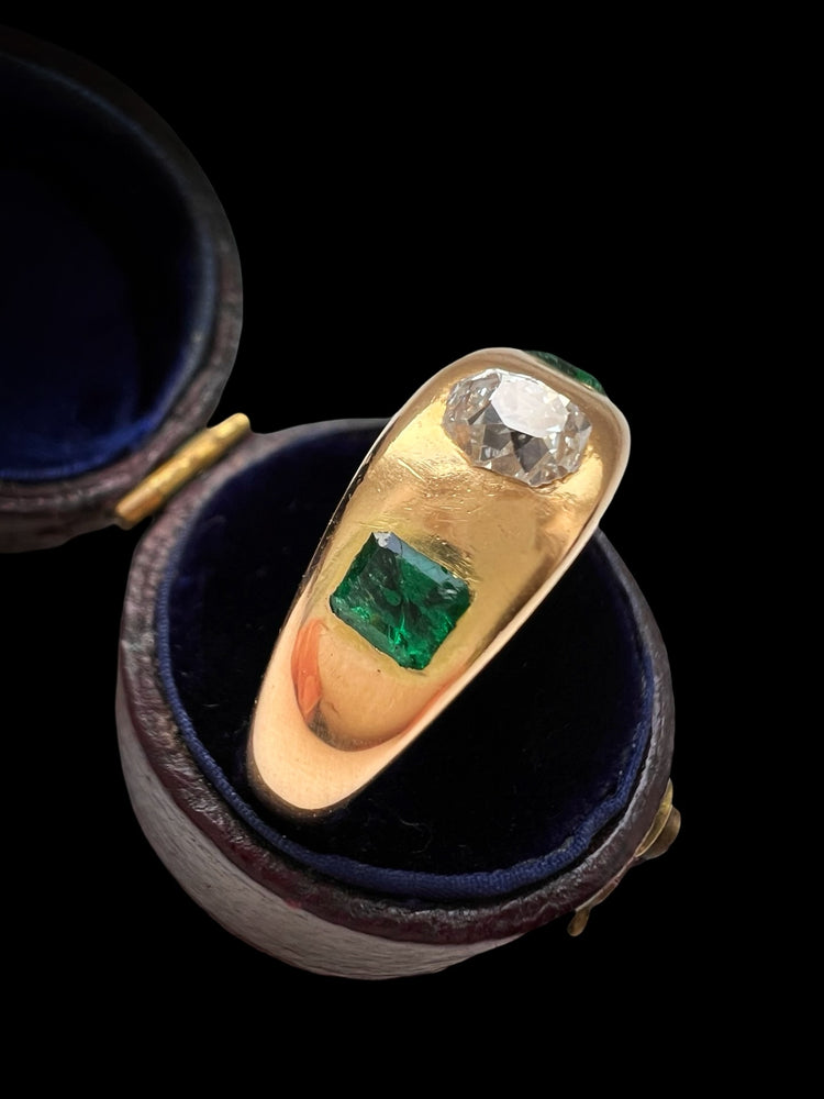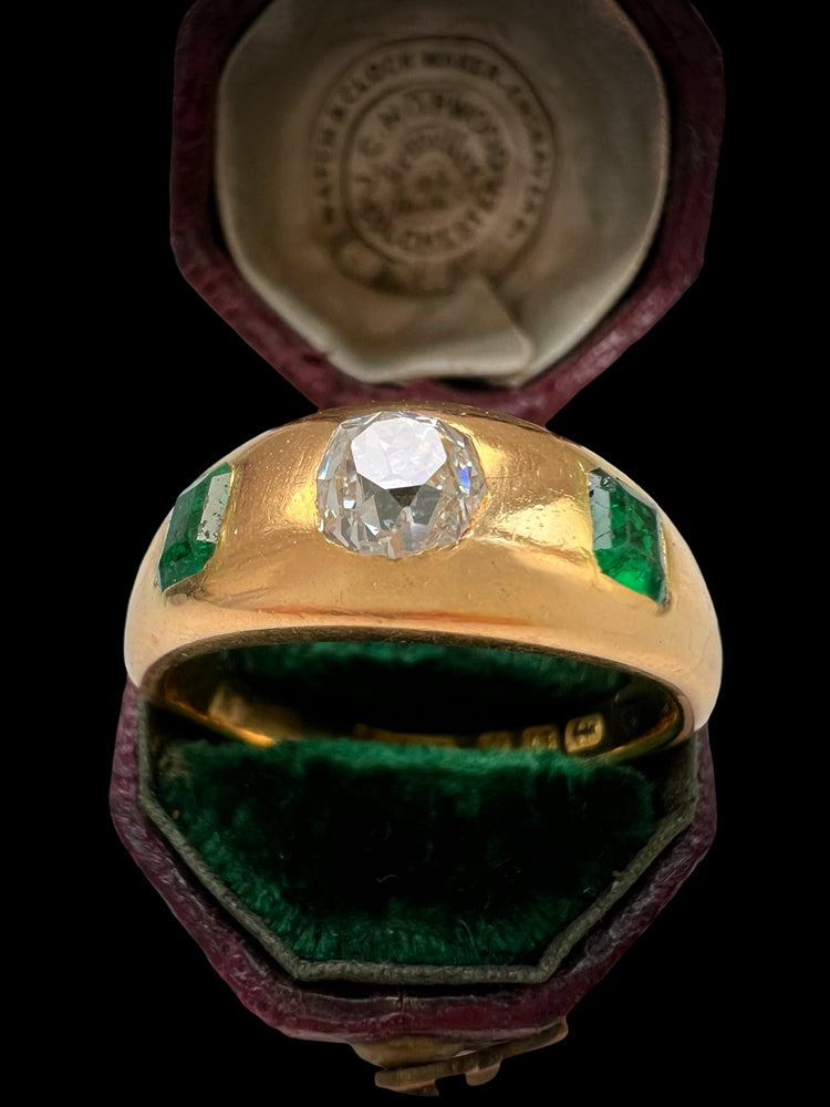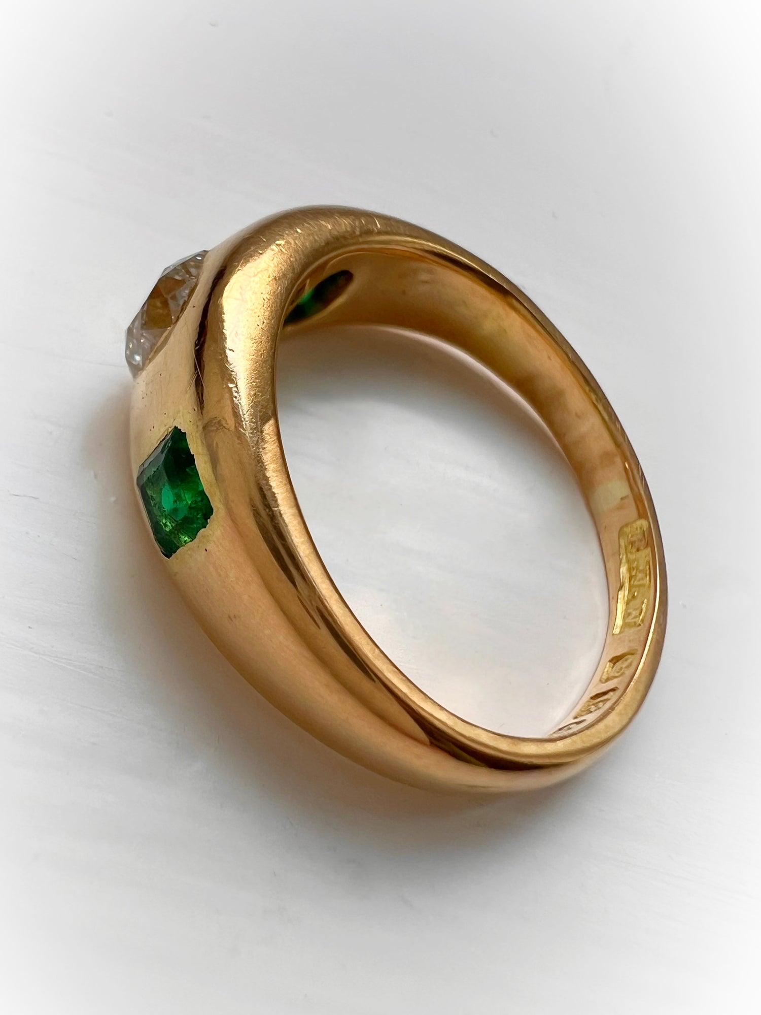 The 18ct gold band has a super chunky central old cut diamond, flanked by two rectangular bright green Columbian emeralds.